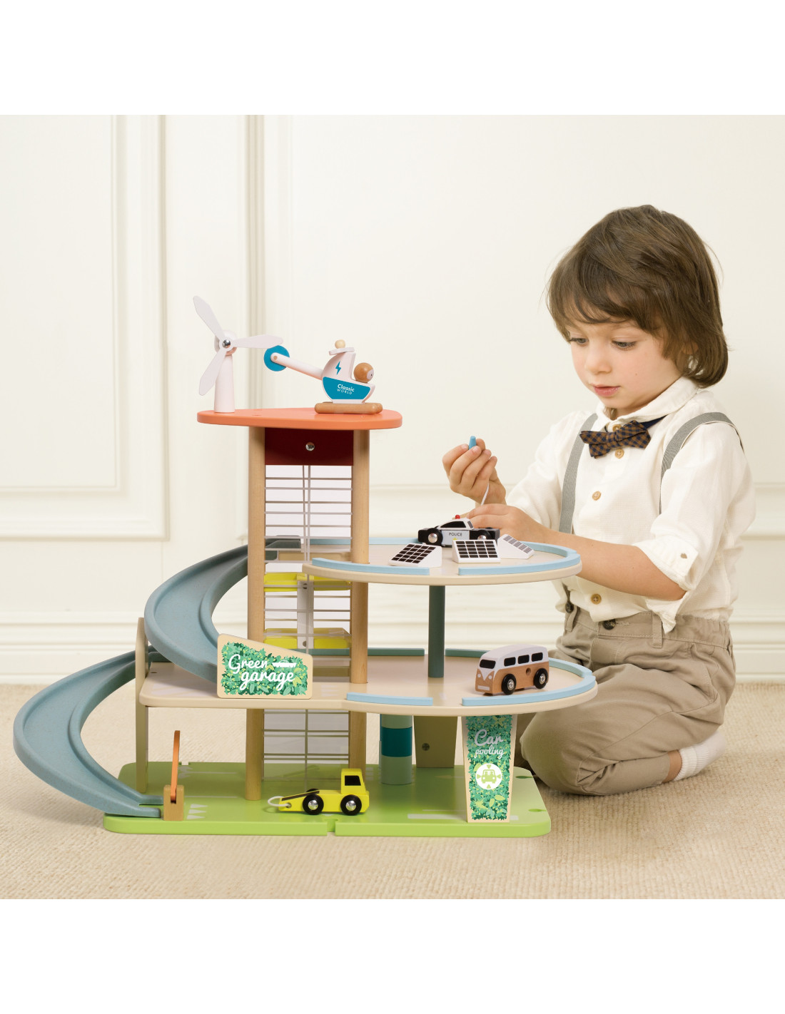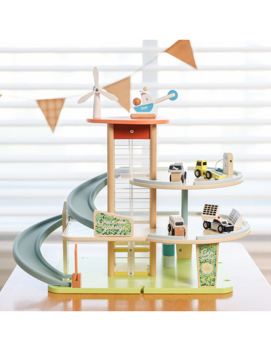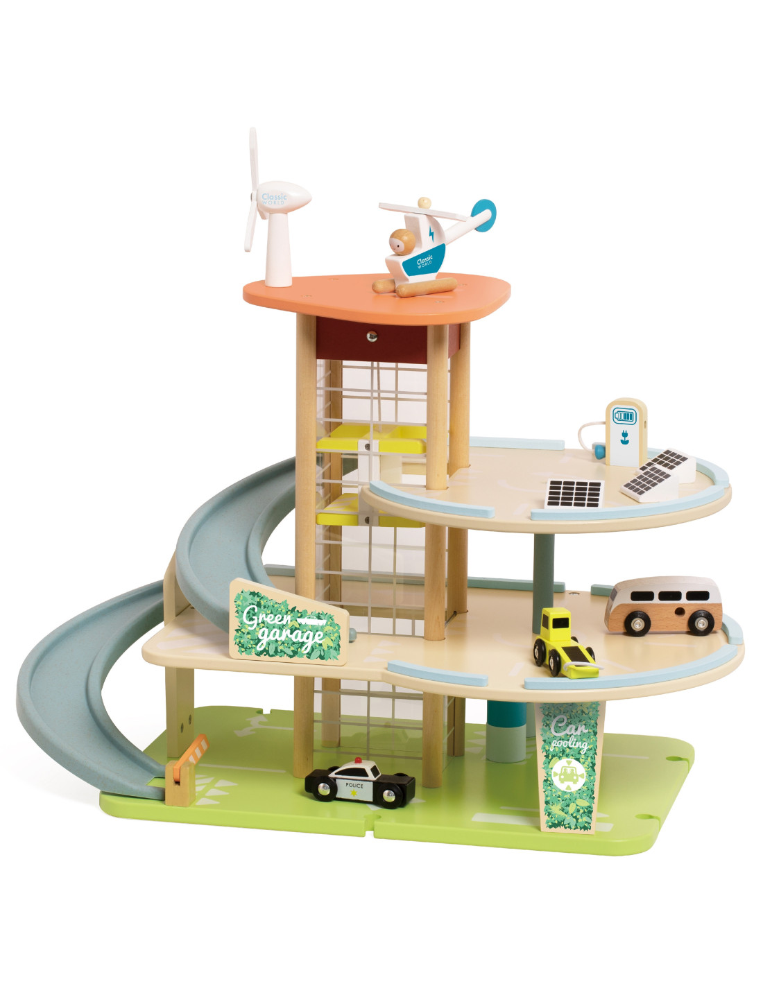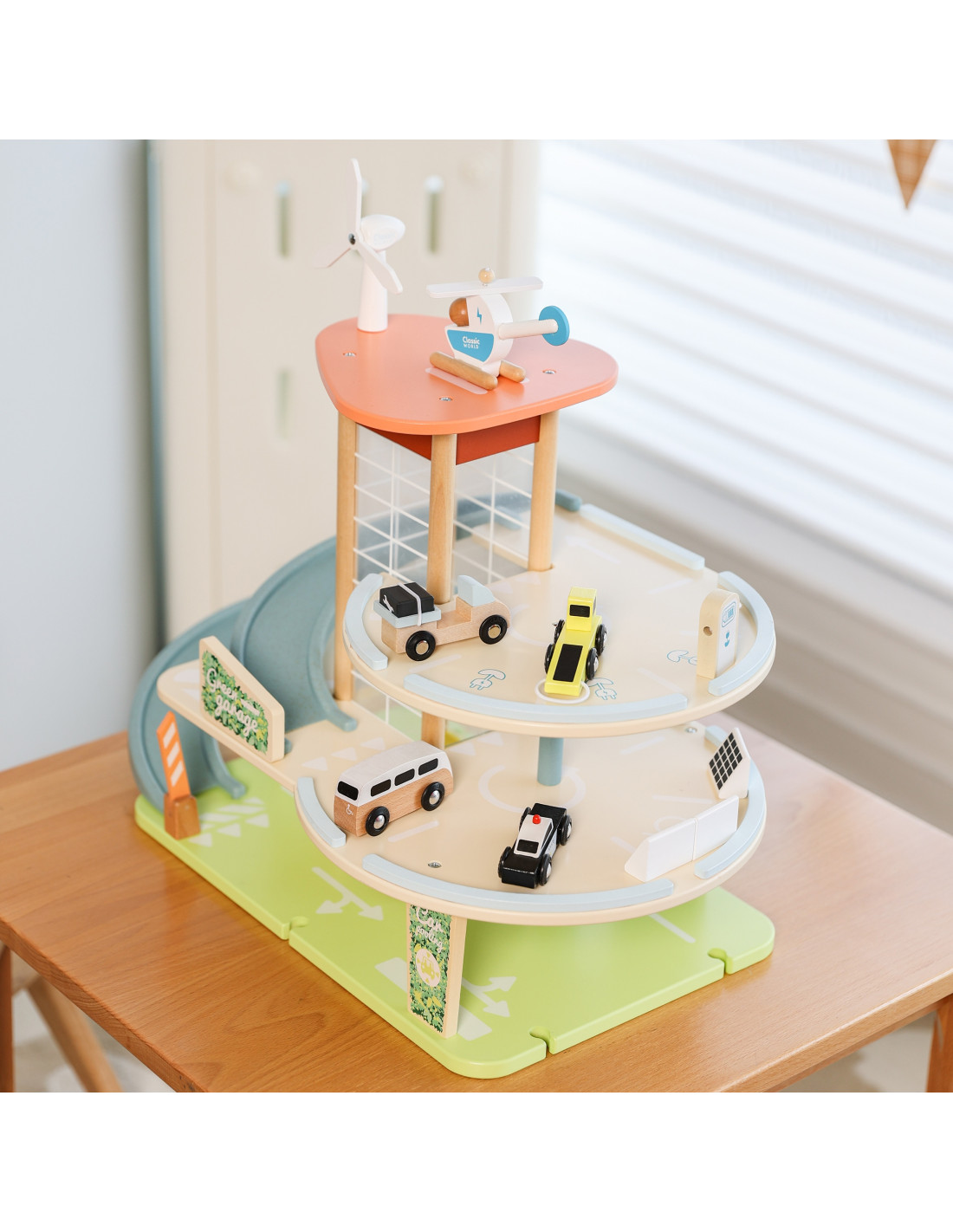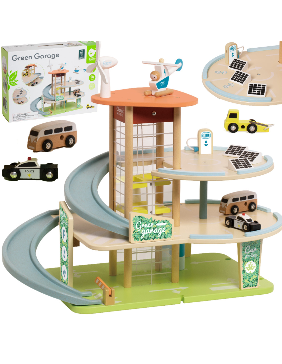 This wooden multi-story parking garage from Classic World, featuring an electric vehicle charging station, elevator, photovoltaic panels, a windmill, and a helicopter landing pad, will spark the imagination of every car and automotive enthusiast. To enter or exit the parking lot, the barrier must be raised. The manually operated elevator allows vehicles to move between floors. A special, winding ramp allows for quick exits between floors. The garage is also equipped with an electric vehicle charging station. The set also includes three toy cars and a helicopter.