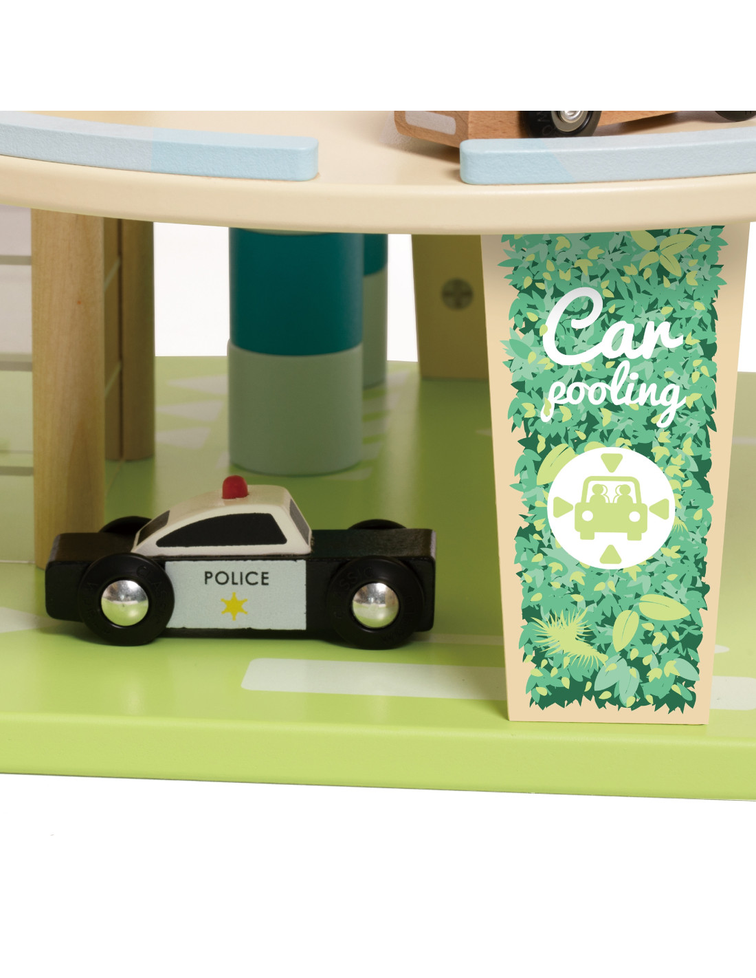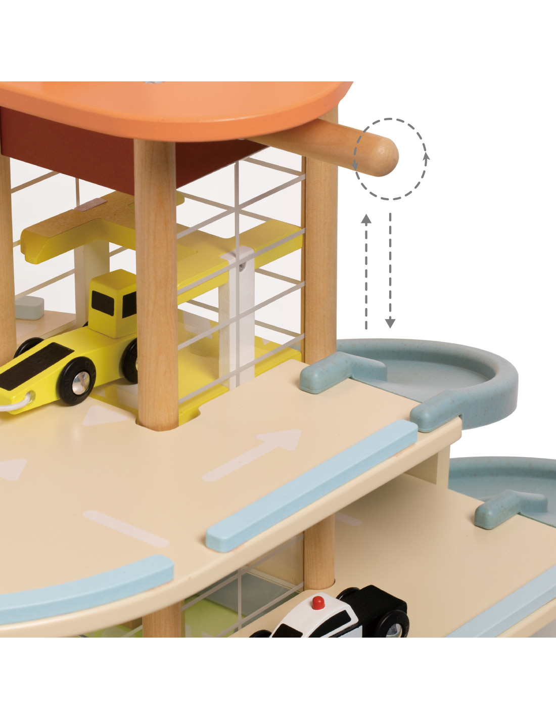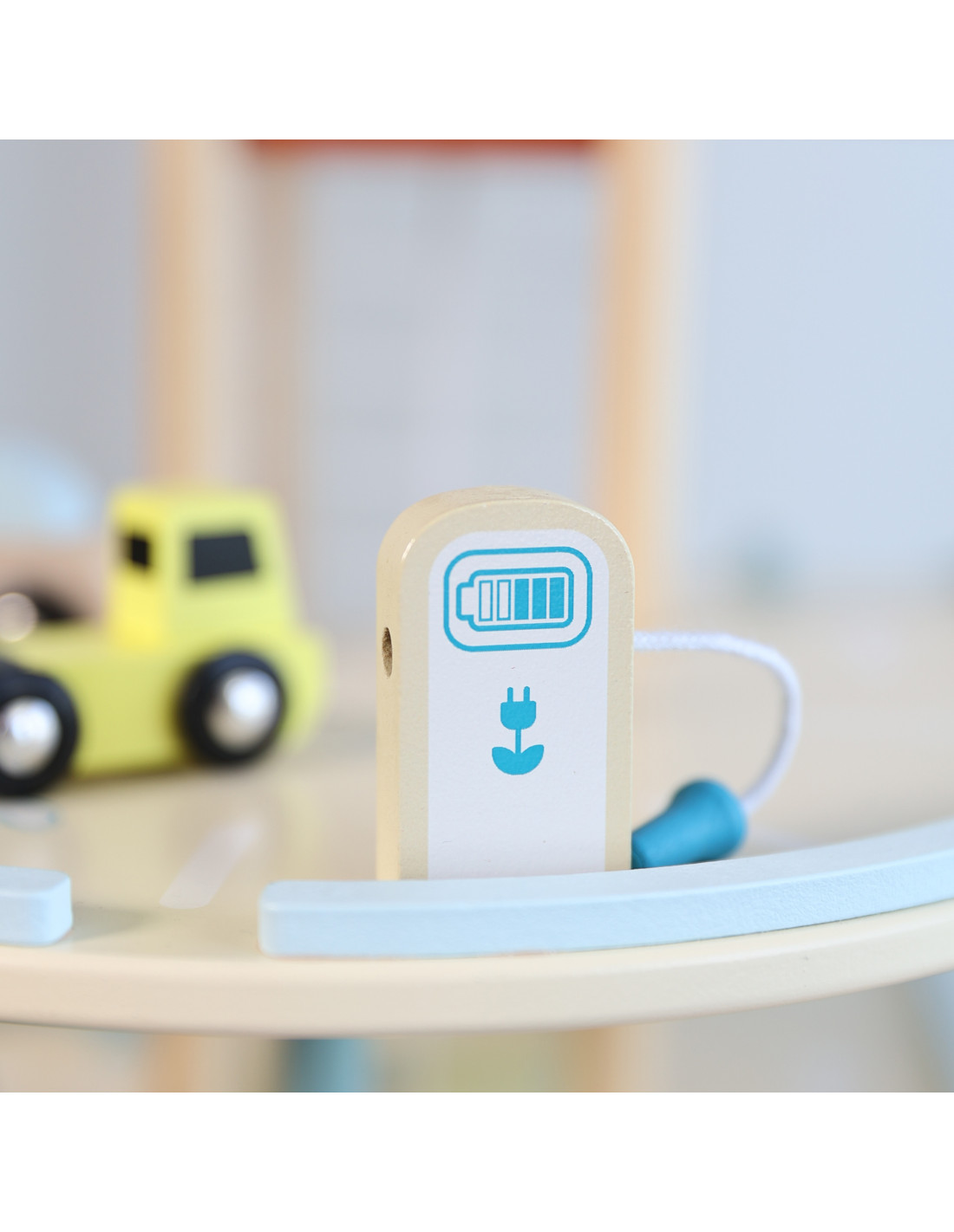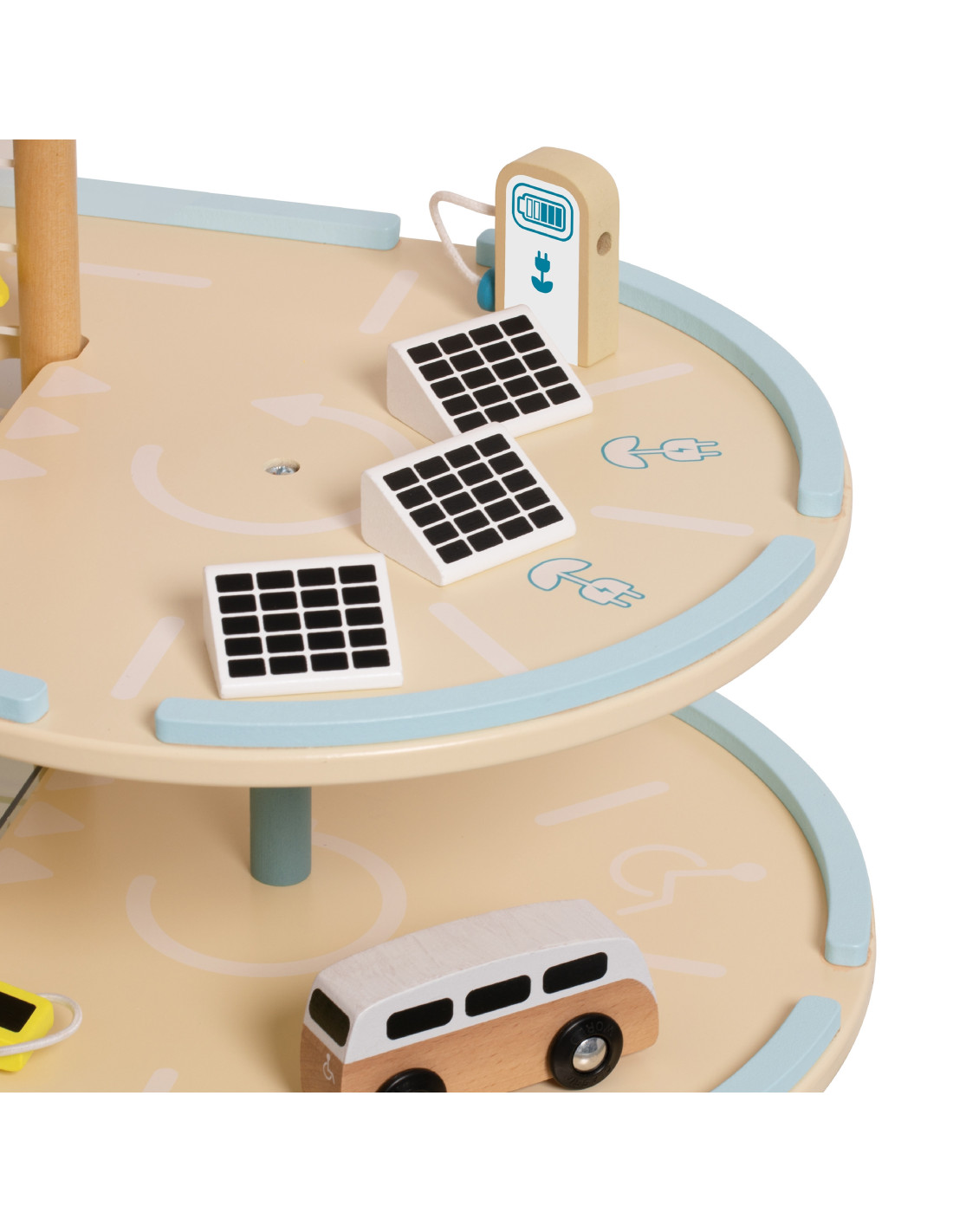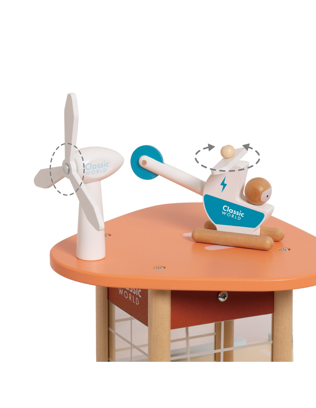 This wooden multi-story parking garage from Classic World, featuring an electric vehicle charging station, elevator, photovoltaic panels, a windmill, and a helicopter landing pad, will spark the imagination of every car and automotive enthusiast. To enter or exit the parking lot, the barrier must be raised. The manually operated elevator allows vehicles to move between floors. A special, winding ramp allows for quick exits between floors. The garage is also equipped with an electric vehicle charging station. The set also includes three toy cars and a helicopter.