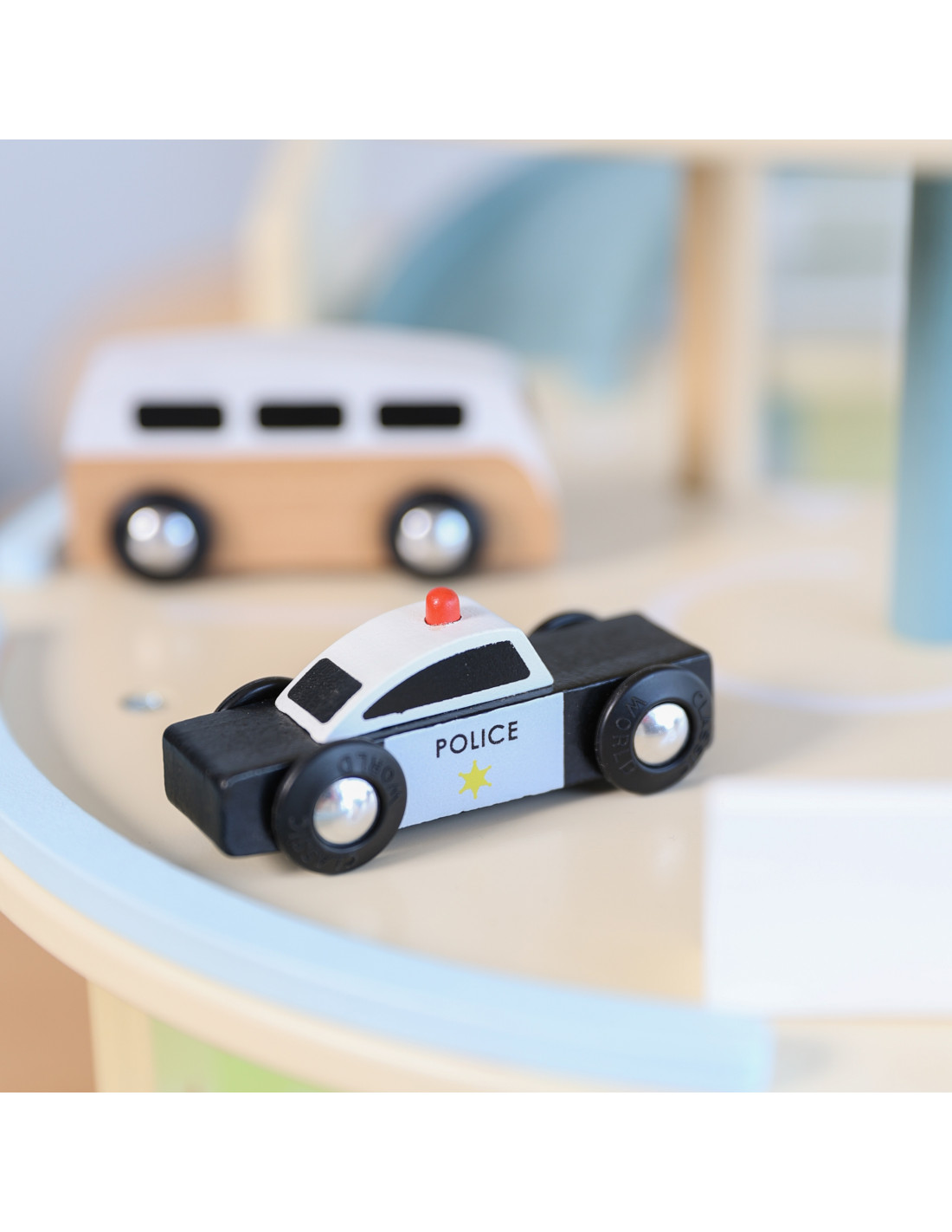 - - 4 wooden vehicles - police, tow truck, bus, helicopter