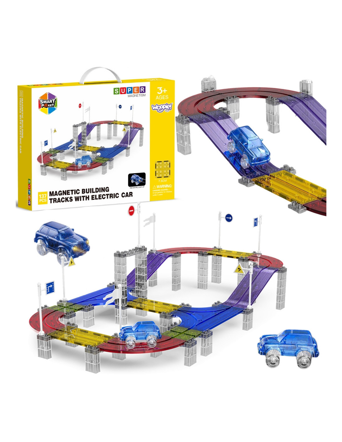 The Woopie Magnetic Race Track is a unique toy that will spark every child's creativity and transform play into an incredible adventure full of lights and colors! Thanks to easy-to-connect magnetic elements, little ones can independently build a variety of multi-level tracks, along which a glowing car races. Transparent, colorful parts and striking LED lights make play captivating and fun , both day and night.