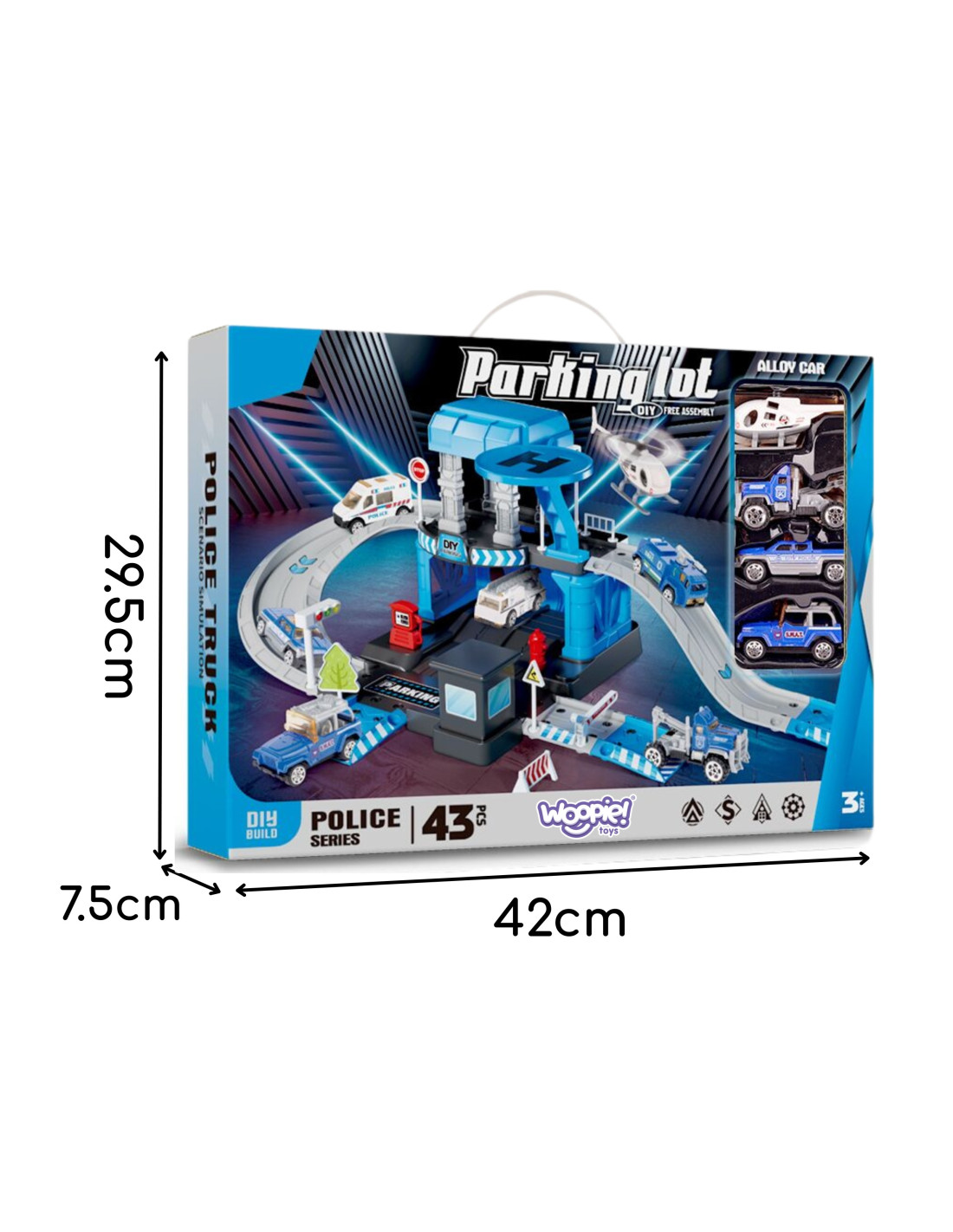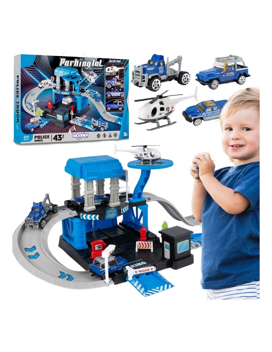 The Woopie Police Parking Garage with accessories and vehicles is a fantastic themed set for every little automotive and law enforcement enthusiast! This toy delights with its rich detail , number of pieces, vibrant colors, and numerous play options. The two-story parking garage with ramps, a helicopter landing pad, and numerous accessories allows children to create their own play scenarios , limited only by their imagination. Three metal cars and a helicopter allow for the use of all the garage's functions, allowing for fun with siblings or friends, and for them to role-play as a little police officer.