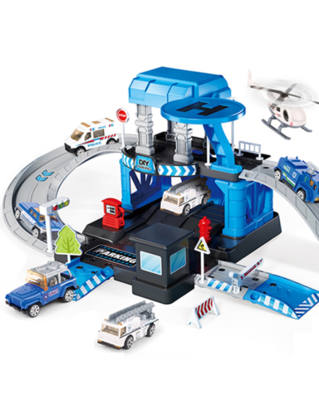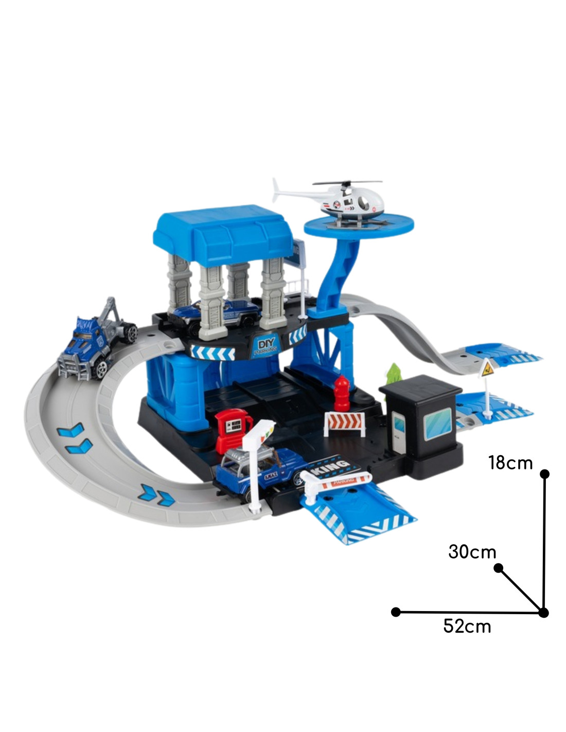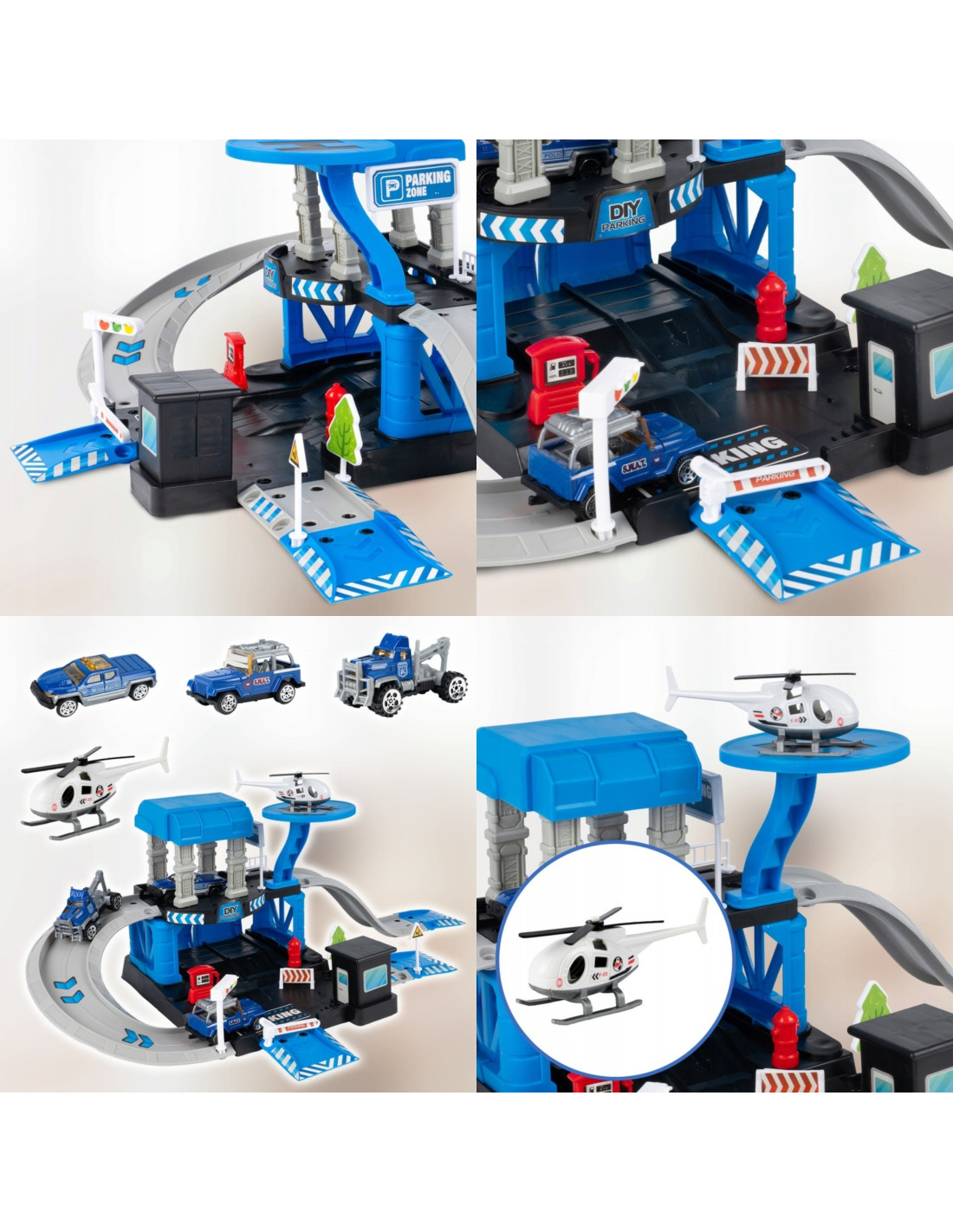 - - Two-level parking lot with ramps, slides and a helicopter landing pad
