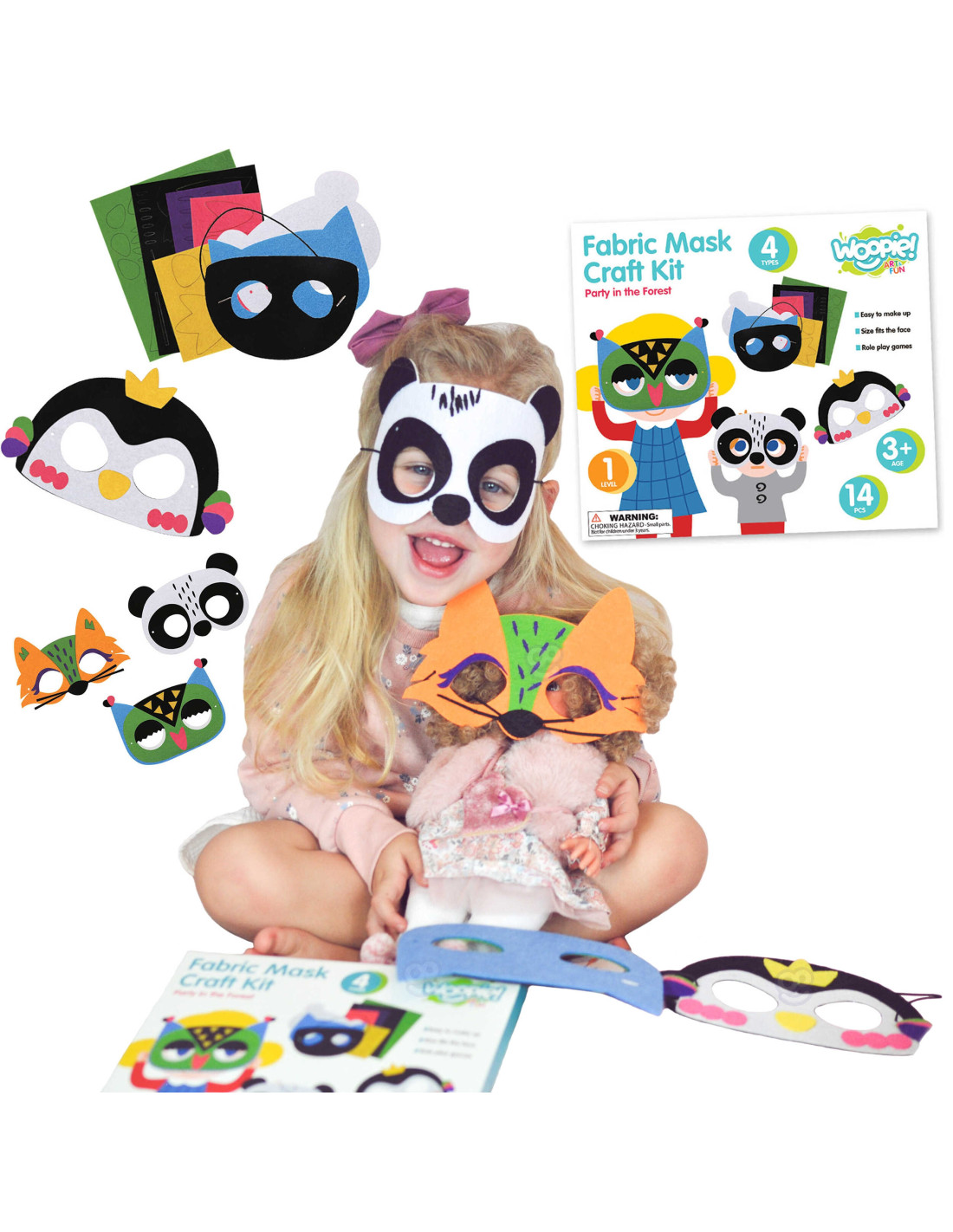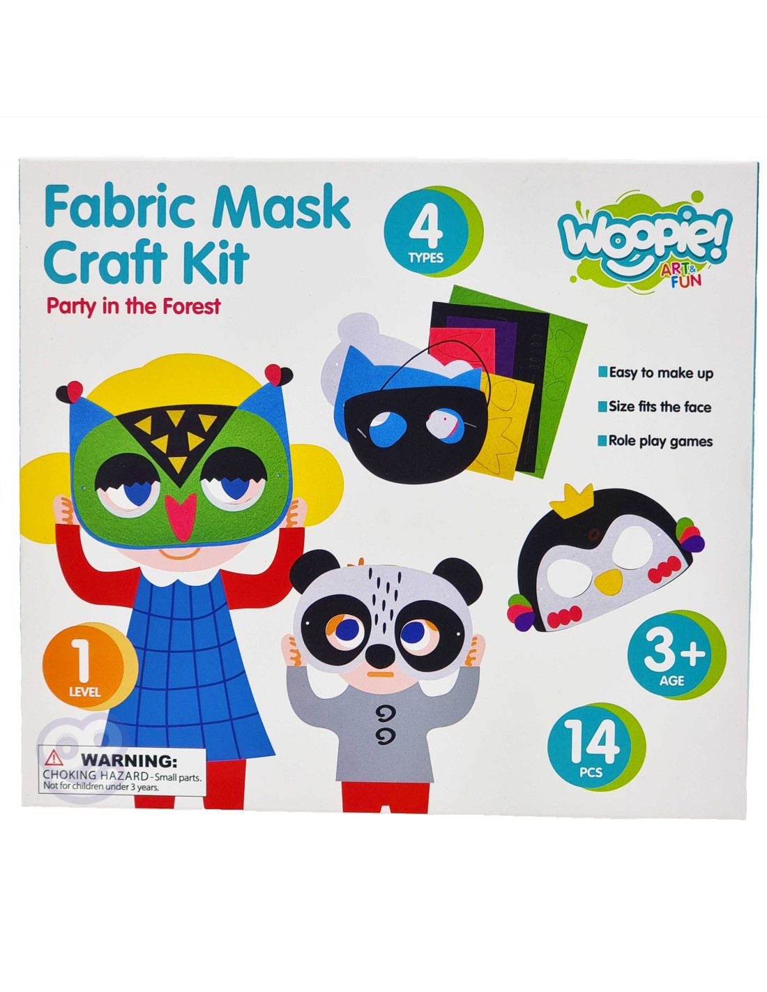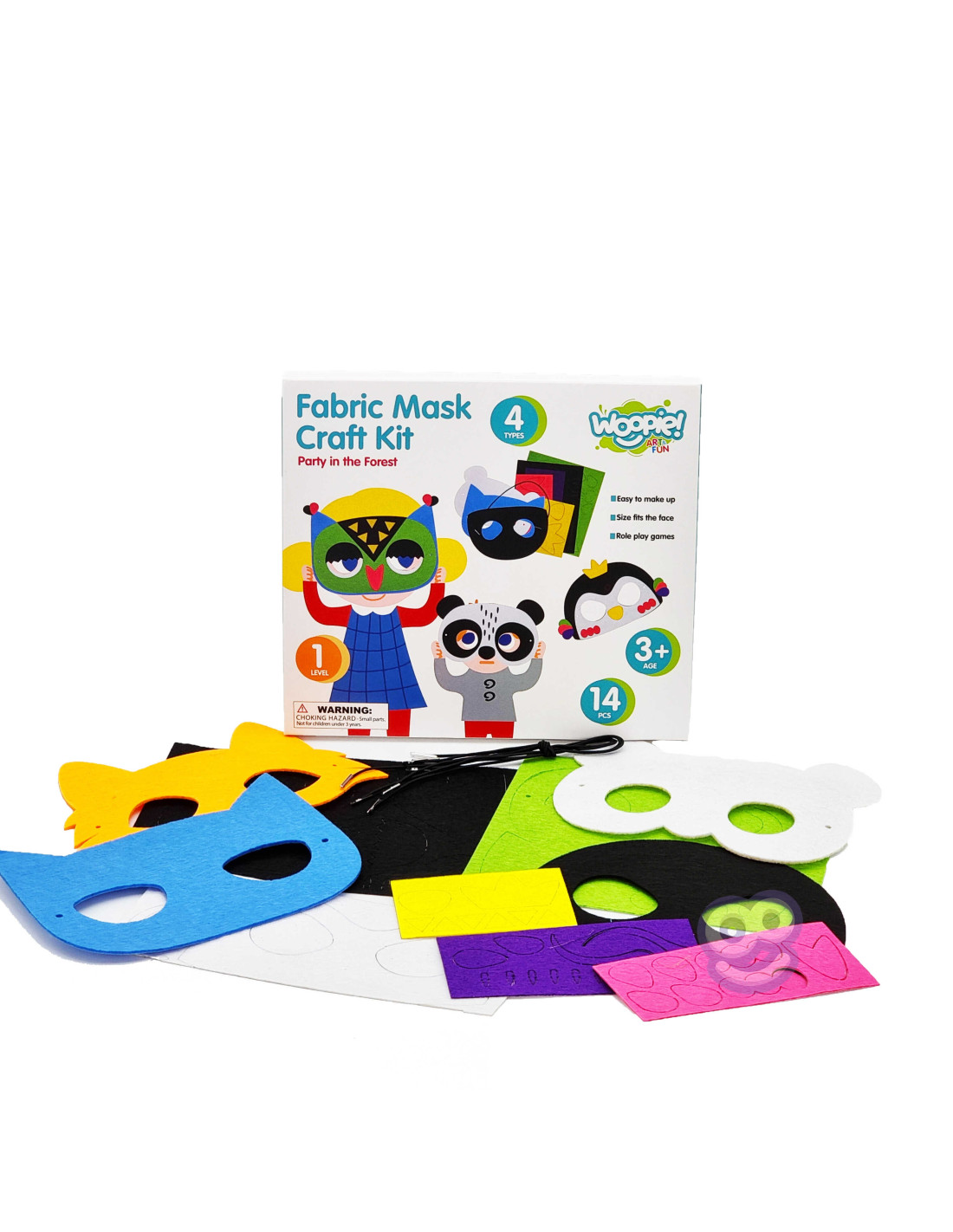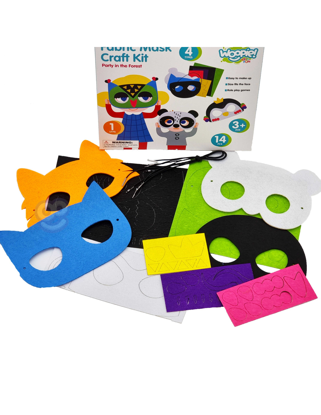 The Creative Mask Factory Party in the Forest set from the WOOPIE brand from the ART&FUN series will provide creative fun alone or with friends! The set offers an interesting form of play that will provide a lot of satisfaction from creating . Children can create their own forest animal mask . The set allows you to create 4 different masks . The set contains 14 pieces: in addition to the 4 mask bases , there are 5 boards with 75 pieces in 5 different colors for decoration, and 4 strings that can be easily adjusted to fit the mask to the child's head. Easy to make - the elements from the boards can be easily separated , simply peel off the paper from the self-adhesive backing and apply the elements to the mask - no glue or scissors required . The masks and elements are made of felt . You can combine the elements freely - the only limit is your imagination ! The back of the package shows examples of how to make masks. After creating the masks, your child can play with friends. Art games also develop children's manual skills , so-called "fine motor skills" . The set is a great idea for having fun with friends; after creating the masks, children can act out and take on different roles !