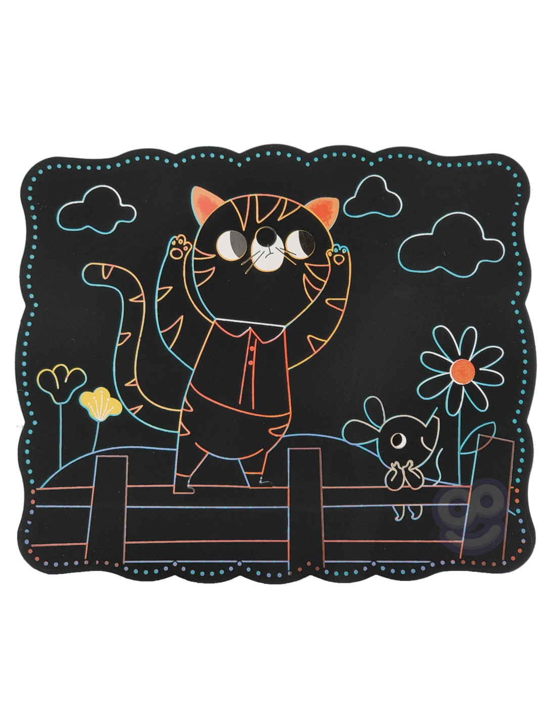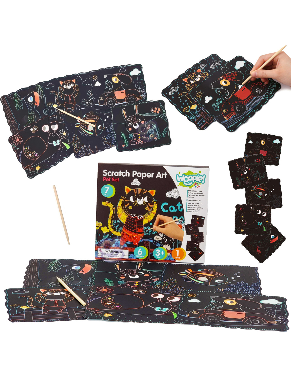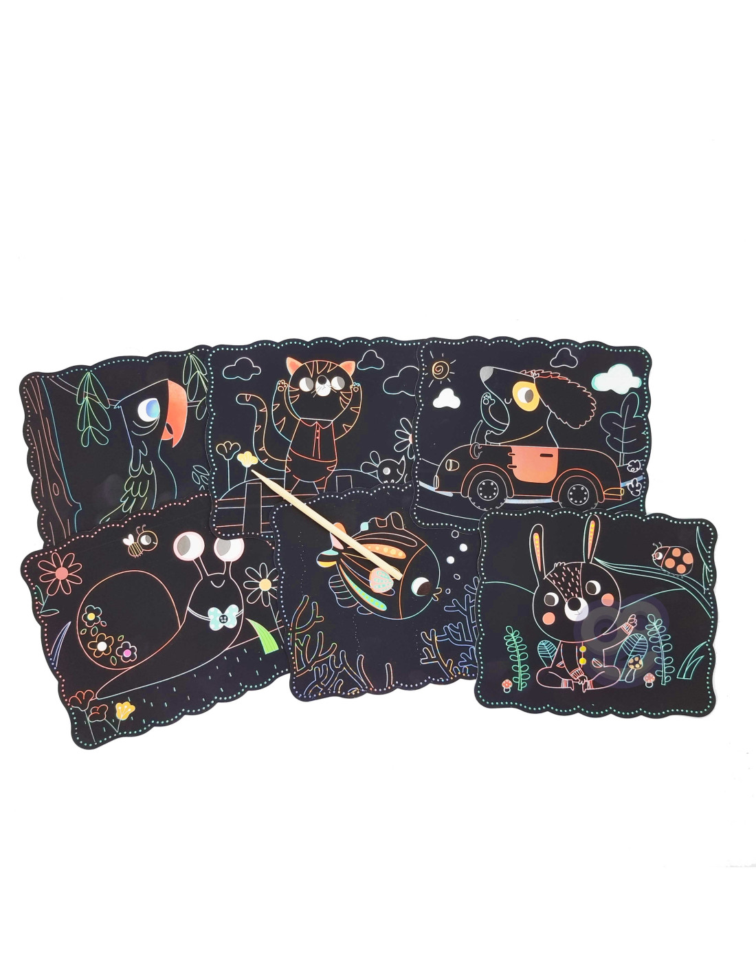 Spark your child's imagination with magical scratching boards from the WOOPIE ART&FUN series! Using a wooden stylus , your child can scratch out new shapes/patterns hidden on the board and then watch as the colors create a unique, cohesive picture with an animal motif ! The set includes 7 pieces, including 6 scratching boards and a stylus. The boards feature images of a cat , a dog , a snail , a rabbit, a fish , and a parrot . The convenient, resealable packaging allows your child to take the set anywhere . This toy develops fine motor skills and sparks creativity and imagination !