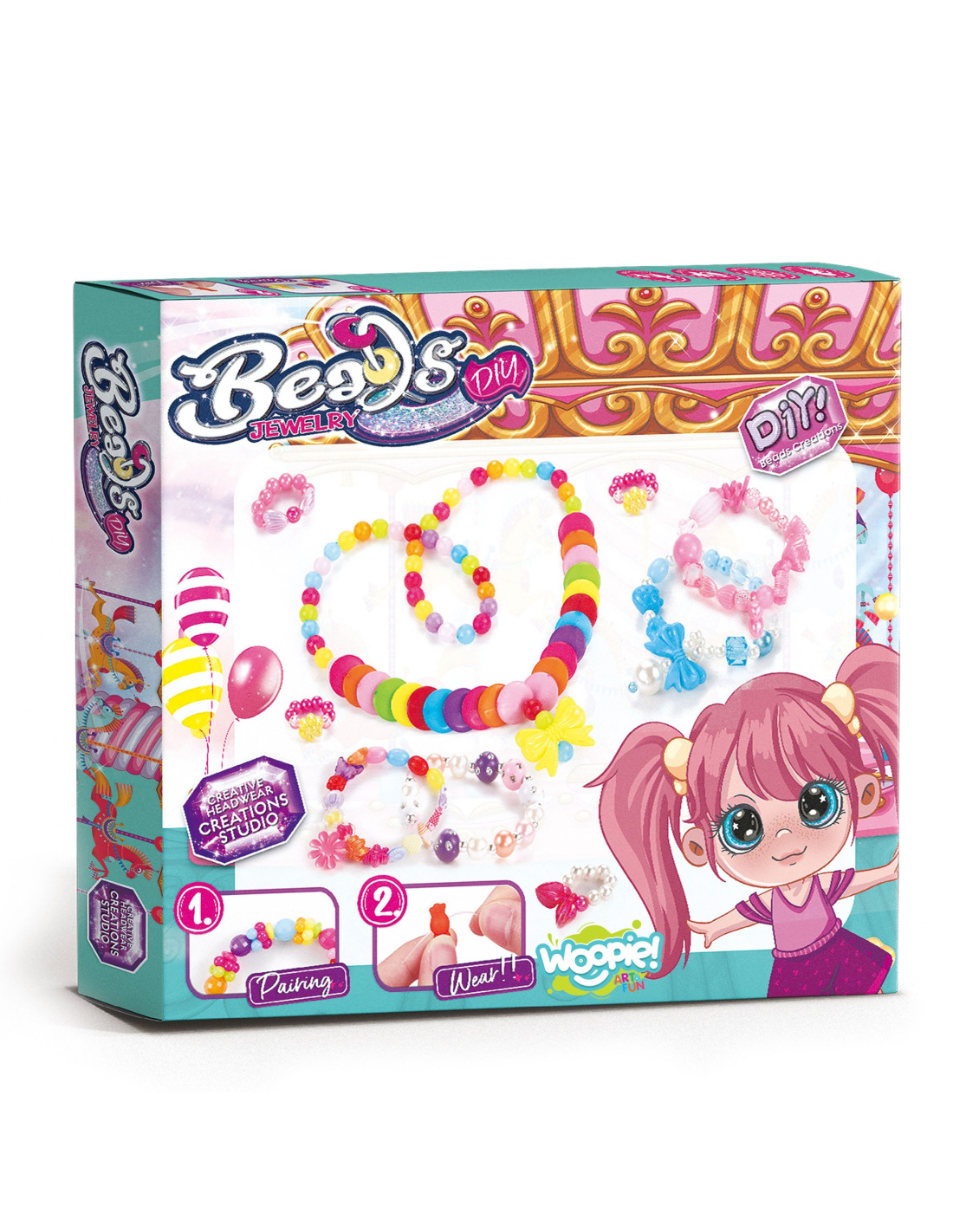 The Jewelry Making Kit from WOOPIE is a stylish, creative, and unique set for every child. Children can mix and match various beads and charms to create their own unique bracelet, ring, or pendant . The kit contains a variety of elements: beads of various sizes, charms , animal -like elements, and string . The set is packaged in a colorful carousel-themed box, making it perfect for a gift. Once unpacked, the kit is easy to carry – it's lightweight and handy, making it easy for children to take to preschool, to a friend's house, or to the garden. The packaging also features an organizer, allowing for safe storage of the small items included in the kit. Playing with jewelry-making positively impacts a child's development, shaping their artistic abilities along with developing their imagination and creativity , while also developing concentration ; it develops manual/motor skills, so-called fine motor skills. "fine motor skills" (hand movements) , and when playing with friends, it teaches cooperation , sharing and improves social and integration skills.