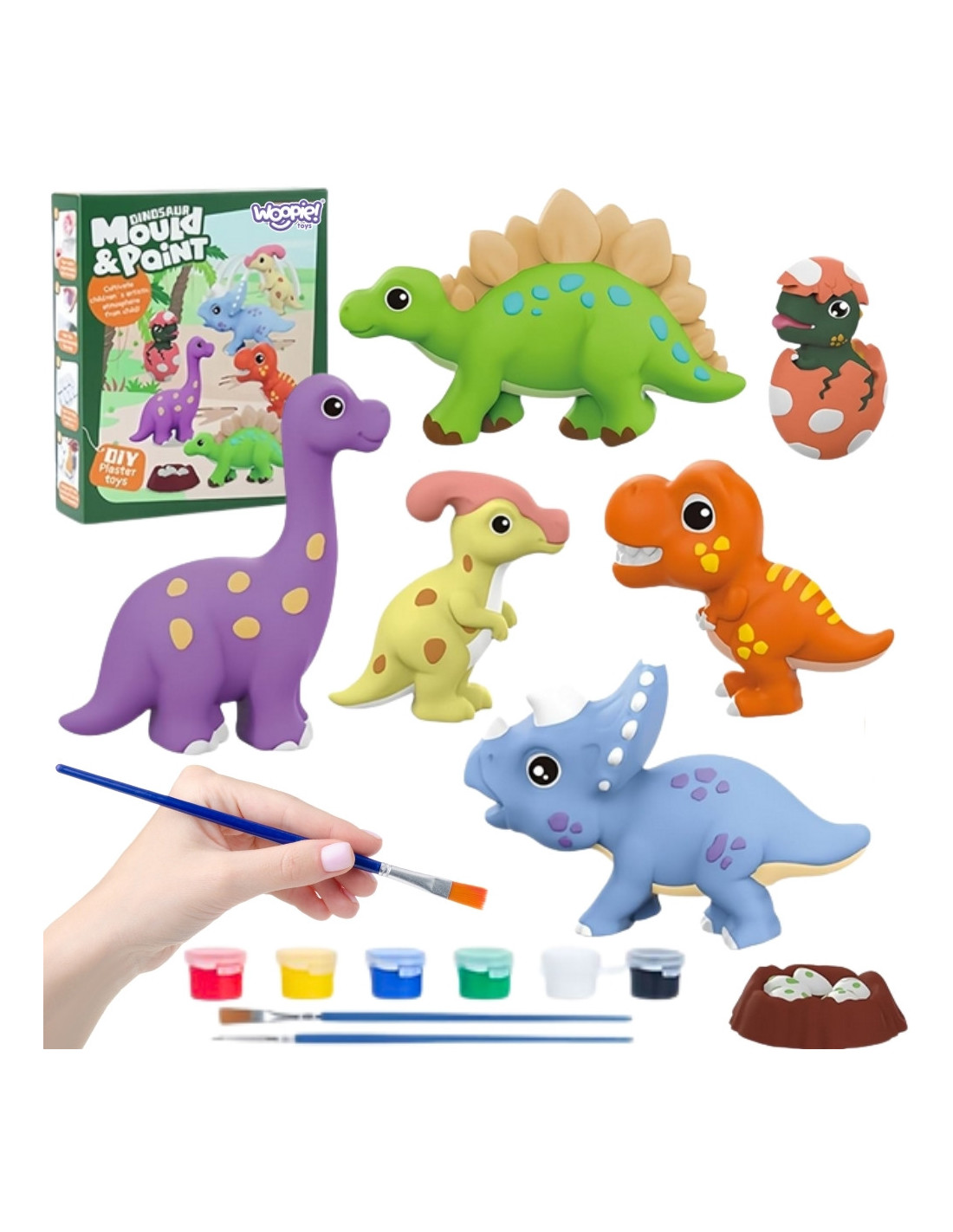 Step into the prehistoric world of dinosaurs! The Dinosaur Mold & Paint set from WOOPIE is a creative playset for kids aged 6 and up. It allows you to mold and decorate your own plaster figurines. Stegosaurus, Triceratops, Tyrannosaurus, and other species will come to life in your own colors.