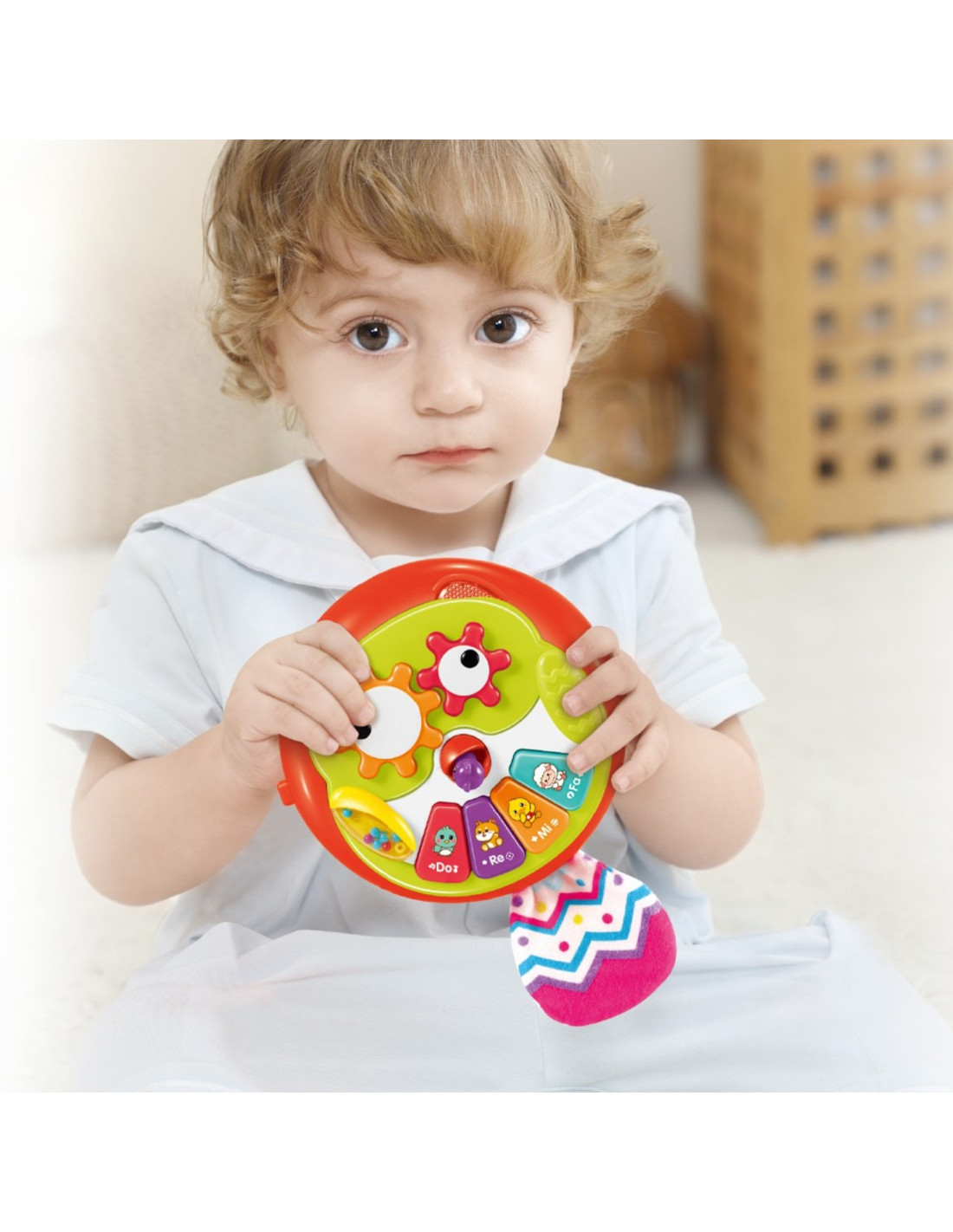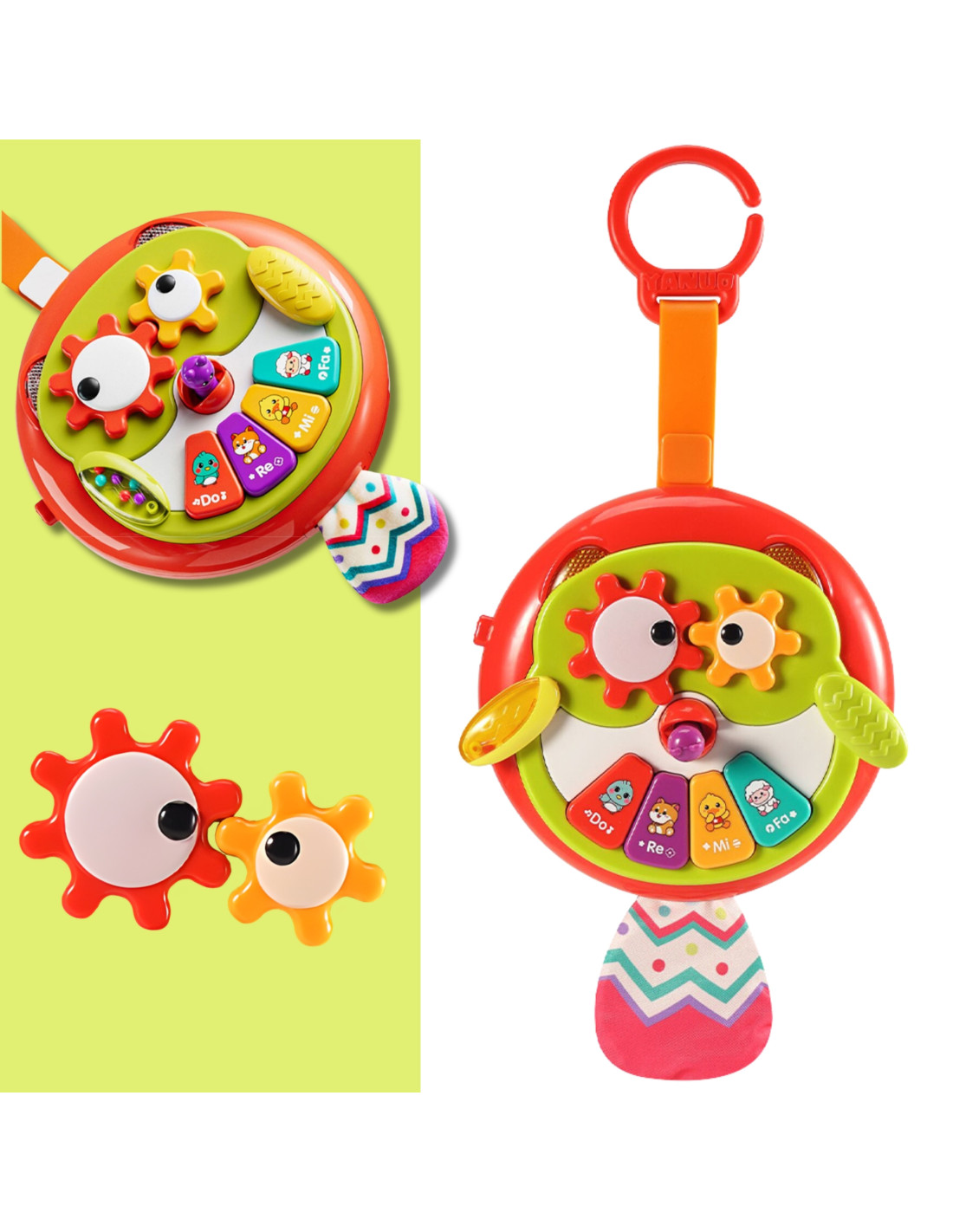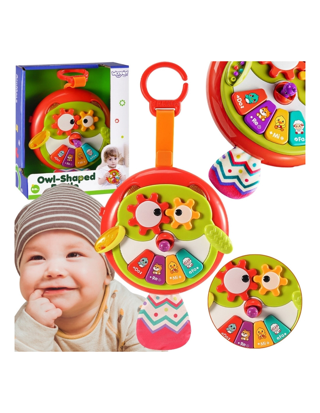 The interactive owl pendant from WOOPIE is a charming and functional toy for little ones that combines education and fun. This colorful owl is designed to engage children with a variety of stimuli – visual, tactile, and auditory . The owl's wings are movable , allowing little ones to move them during play. A worm protrudes from its beak, which, when pulled, activates the gears in the owl's eyes . On the owl's belly, there's a colorful piano with sound markings (do, re, mi, fa) . By pressing the keys, children will hear gentle, friendly melodies that support hearing development and teach tone discrimination. The owl's tail is made of rustling material, and the pendant has a clip that allows it to be attached to a stroller, crib, or car seat.