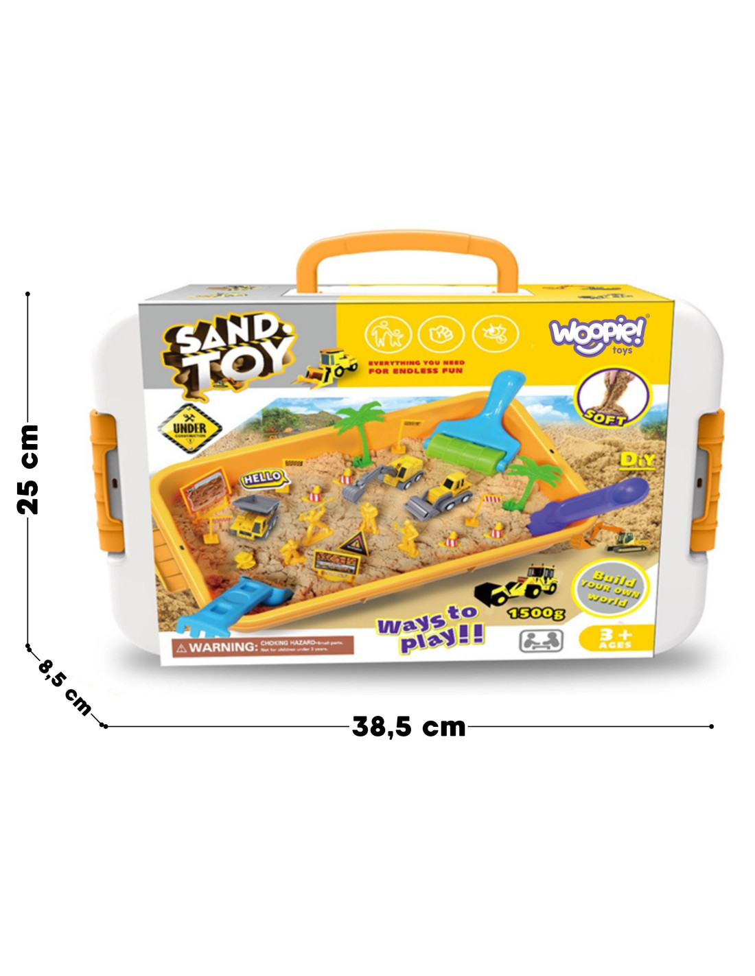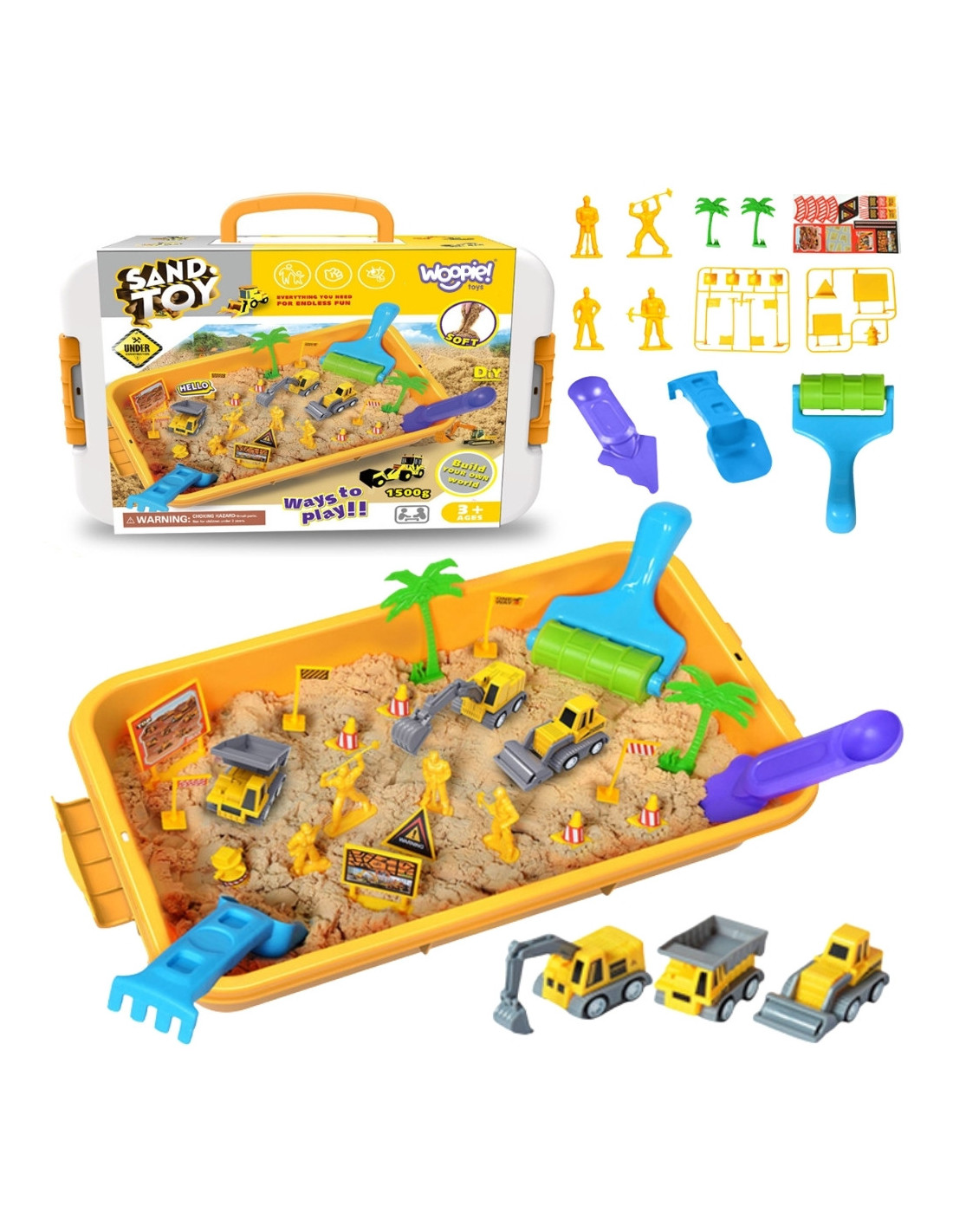 Ready for the biggest construction project your room has ever seen? Introducing Woopie 's Magic Kinetic Sand Construction Site – the perfect set for every little engineer and construction equipment fan! This amazing sand never dries out , is soft to the touch, and easily moldable, allowing your child to build, dig, and create realistic structures. With a wealth of machines, molds, and accessories , it will provide hours of engaging play while developing creativity and manual dexterity, all without making a mess!