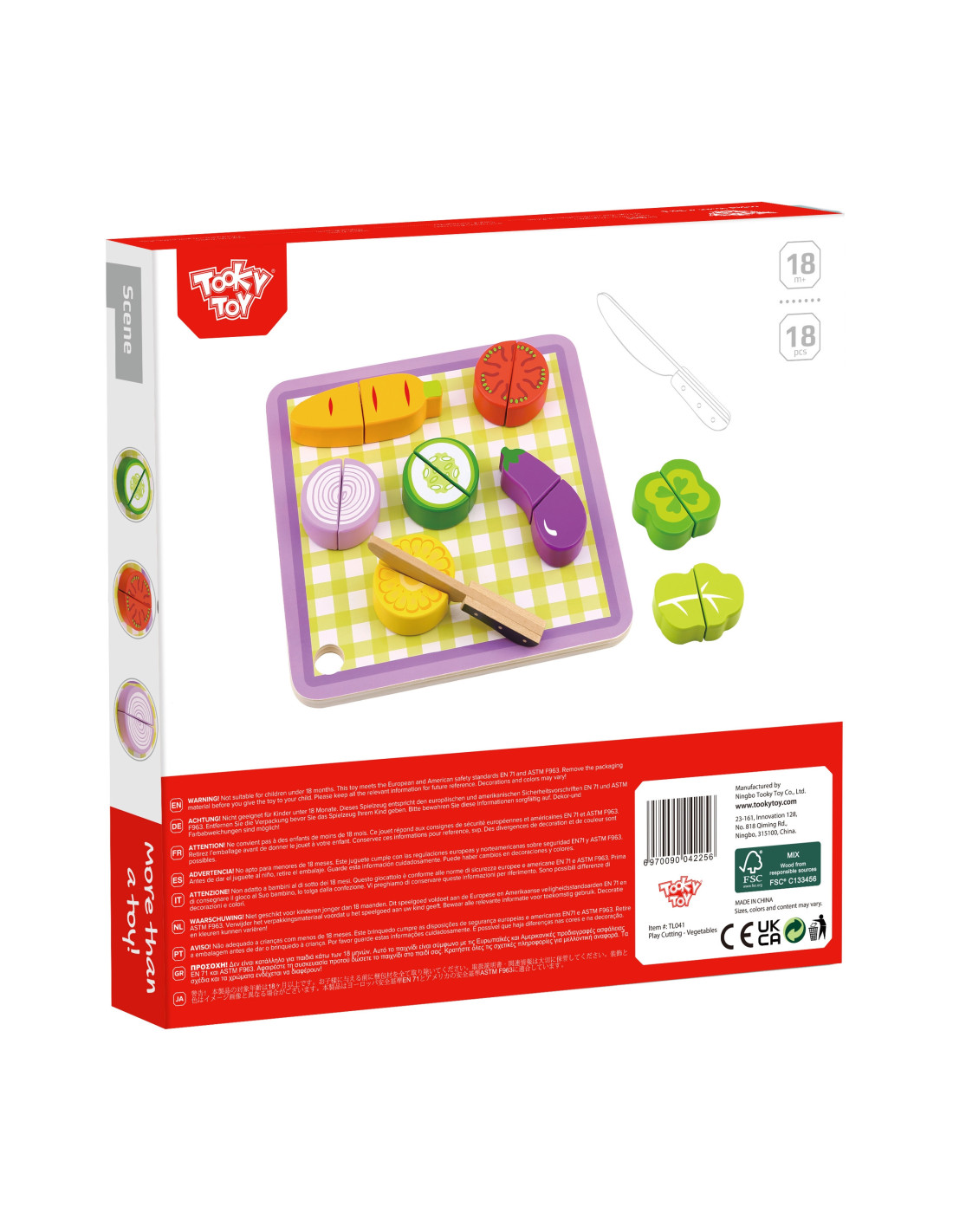 Drewniane Warzywa do krojenia na desce producenta zabawek Tooky Toy dla dzieci od 18 miesiąca życia idealnie pasują do przedszkola jak i do domu. Zestaw zawiera 9 owoców przekrojonych na pół, które można połączyć za pomocą rzepów oraz drewniany zabawkowy nożyk i kolorową deskę do krojenia. Dziecko będzie mogło naśladować czynności z życia codziennego. Zabawka może być wykorzystywana również jako układanka. Zestaw pozwoli na rozwijanie się różnych umiejętności przydatnych w późniejszym życiu. Zabawka jest wielofunkcyjna dzięki czemu dziecko może bawić się na różne sposoby. Twoja pociecha wcięli się w role kucharza we własnej kuchni. Wszystko zależy od kreatywności dziecka.