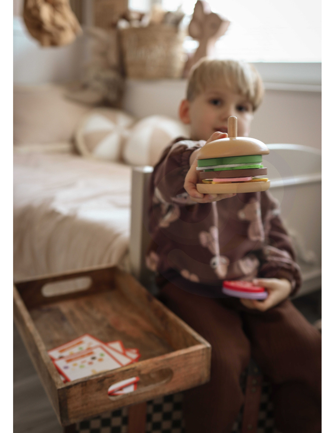 The child selects the necessary ingredients and then, looking at the thickness and color , arranges the ingredients in order. The game can be enhanced by playing a memory game and having the child recreate the image from memory. You can also cover the ingredients on the card , and the child can select the necessary ingredients and assemble the burger based on its appearance. The child can also create their own burger design – the only limits are creativity and imagination.