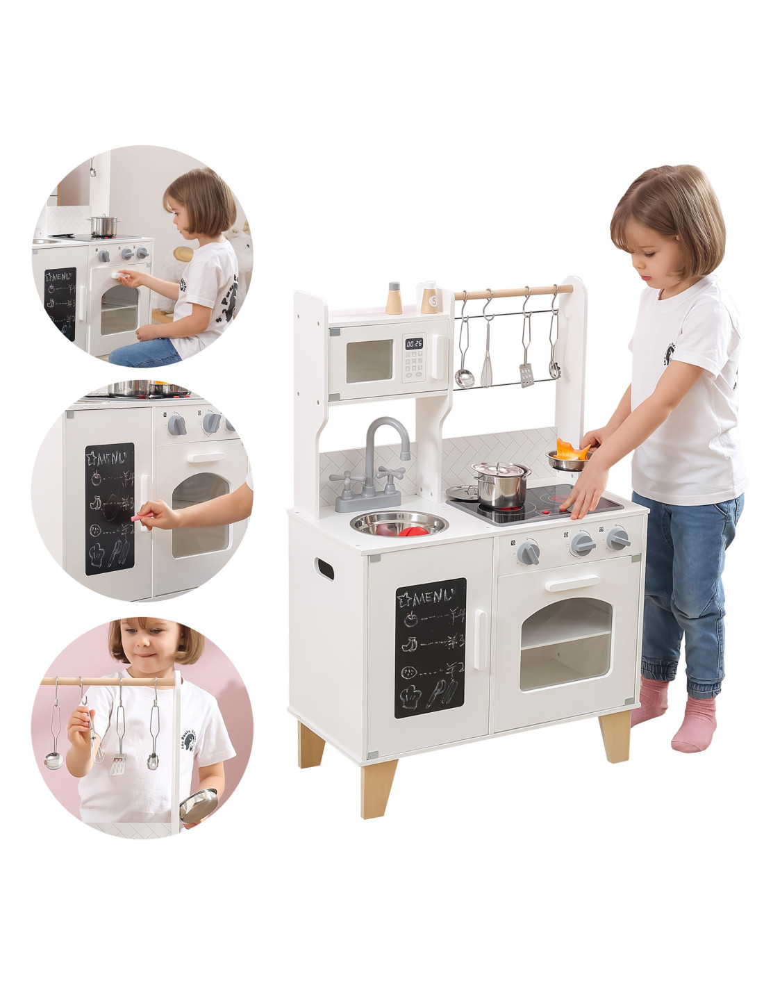 A wonderful play kitchen set for kids that lets them cook and prepare delicious meals for family and friends. Learning to use kitchen tools while having fun can truly spark children's creative thinking and imagination .
