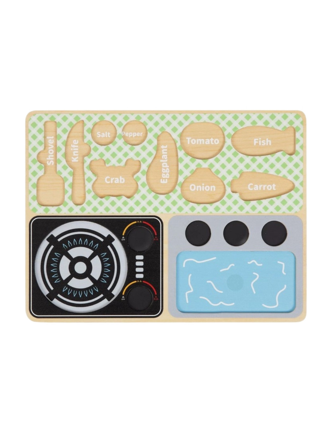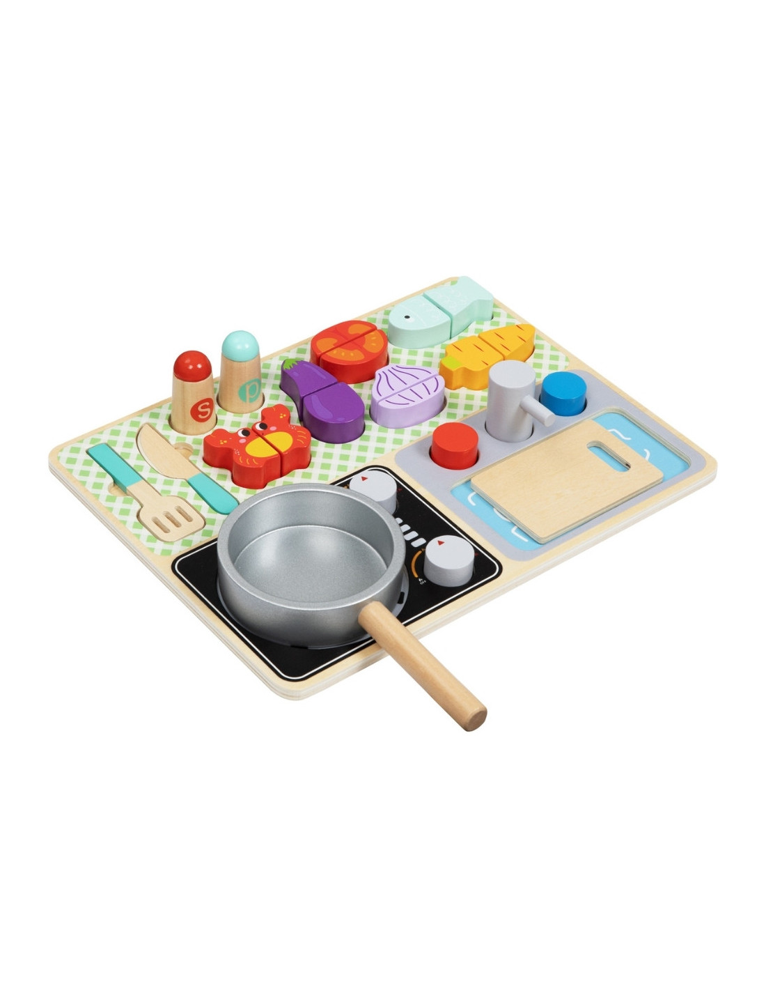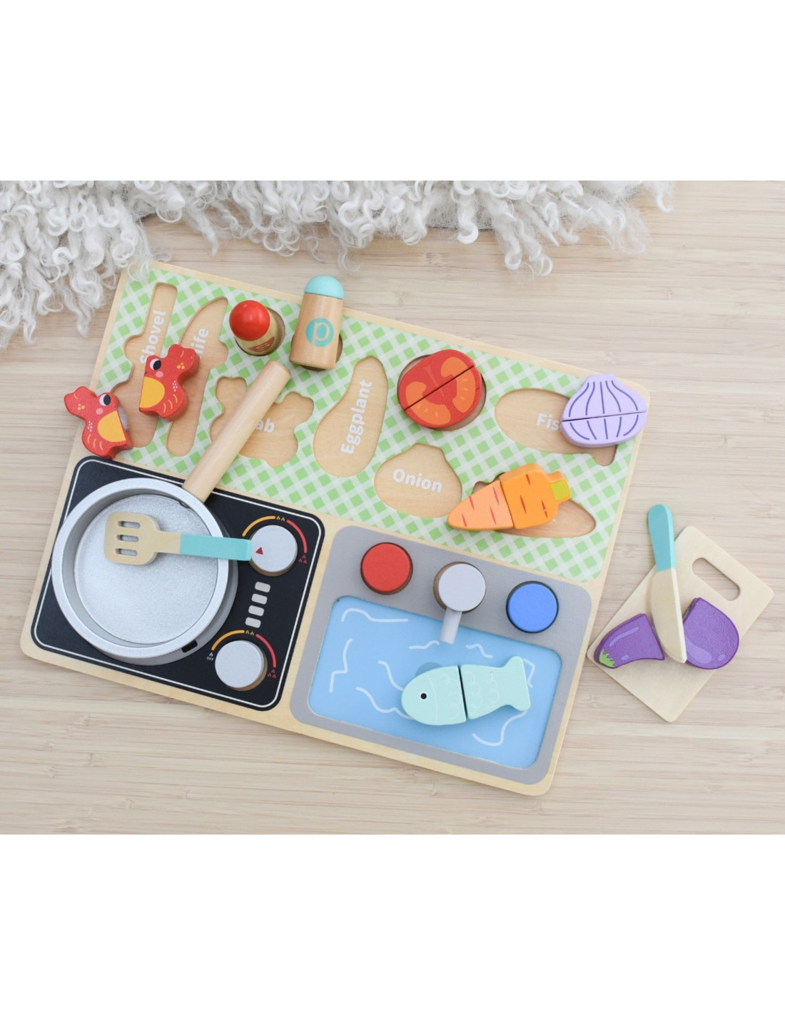 - ✔️ A convenient board that helps your child learn the names of vegetables, kitchen cutlery and other items related to cooking and eating
