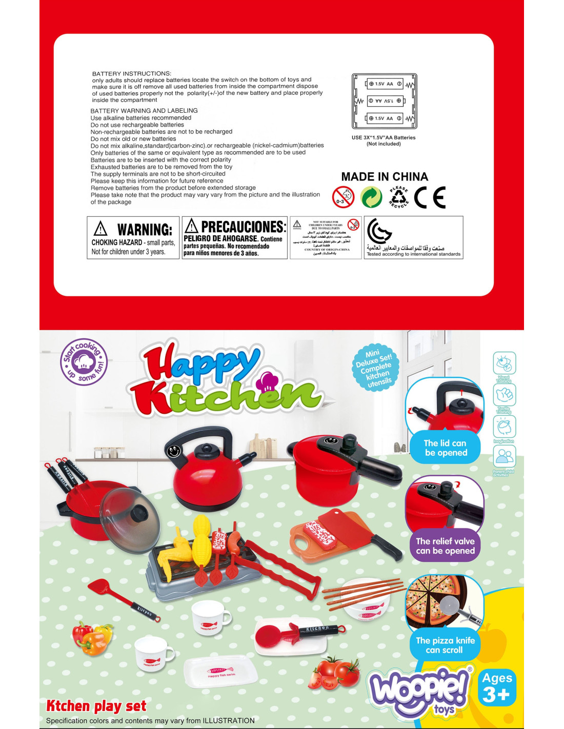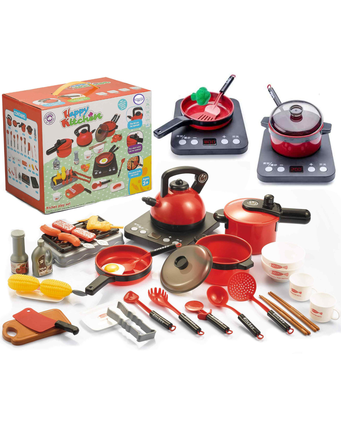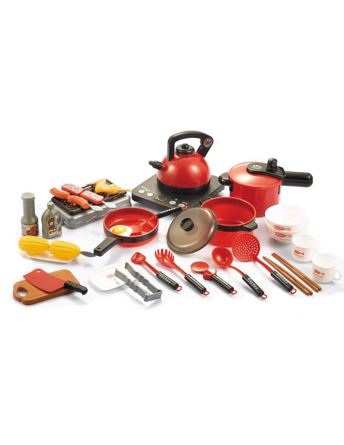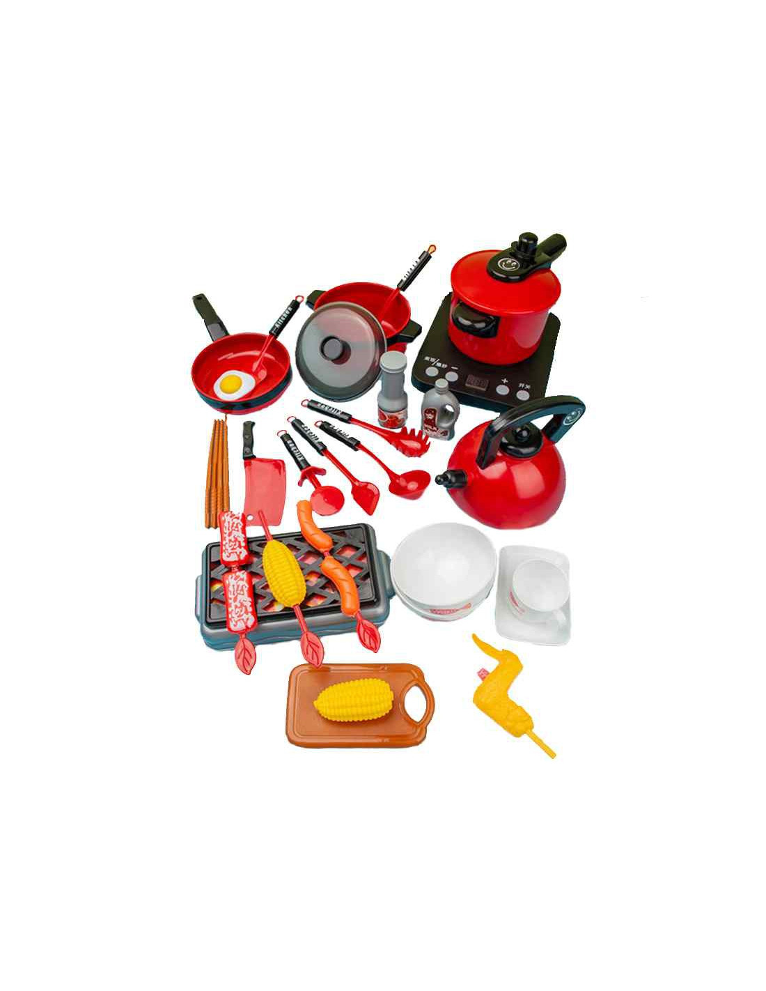 Toy kitchenware from the WOOPIE brand for playing cooking, home, and restaurant. They perfectly imitate real pots. Thanks to them, children can prepare dinner for their dolls or teddy bears. It includes a pot, kettle, frying pan, plates, cutlery, knives, a chopping board, an induction hob, a grill, and many other useful accessories. This set of kitchen accessories allows for engaging play, such as home, bar, and restaurant. The set is perfect for independent play, with adults, or with other children. The cookware set makes a great gift for both girls and boys. The vibrant and bright colors will attract children's attention and encourage play.