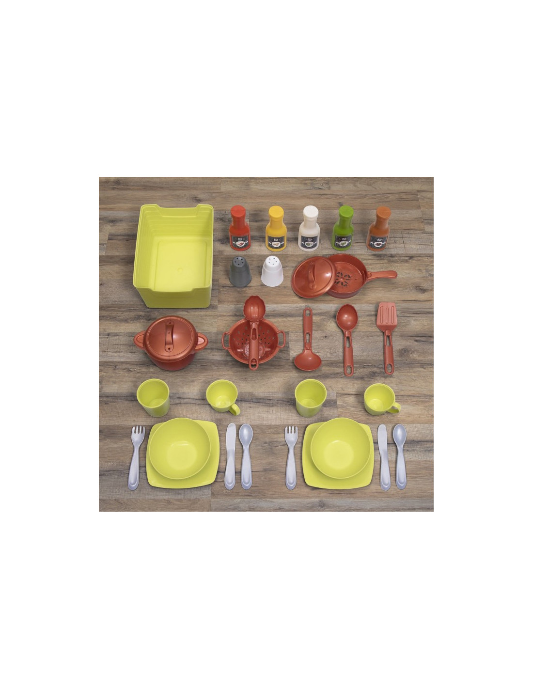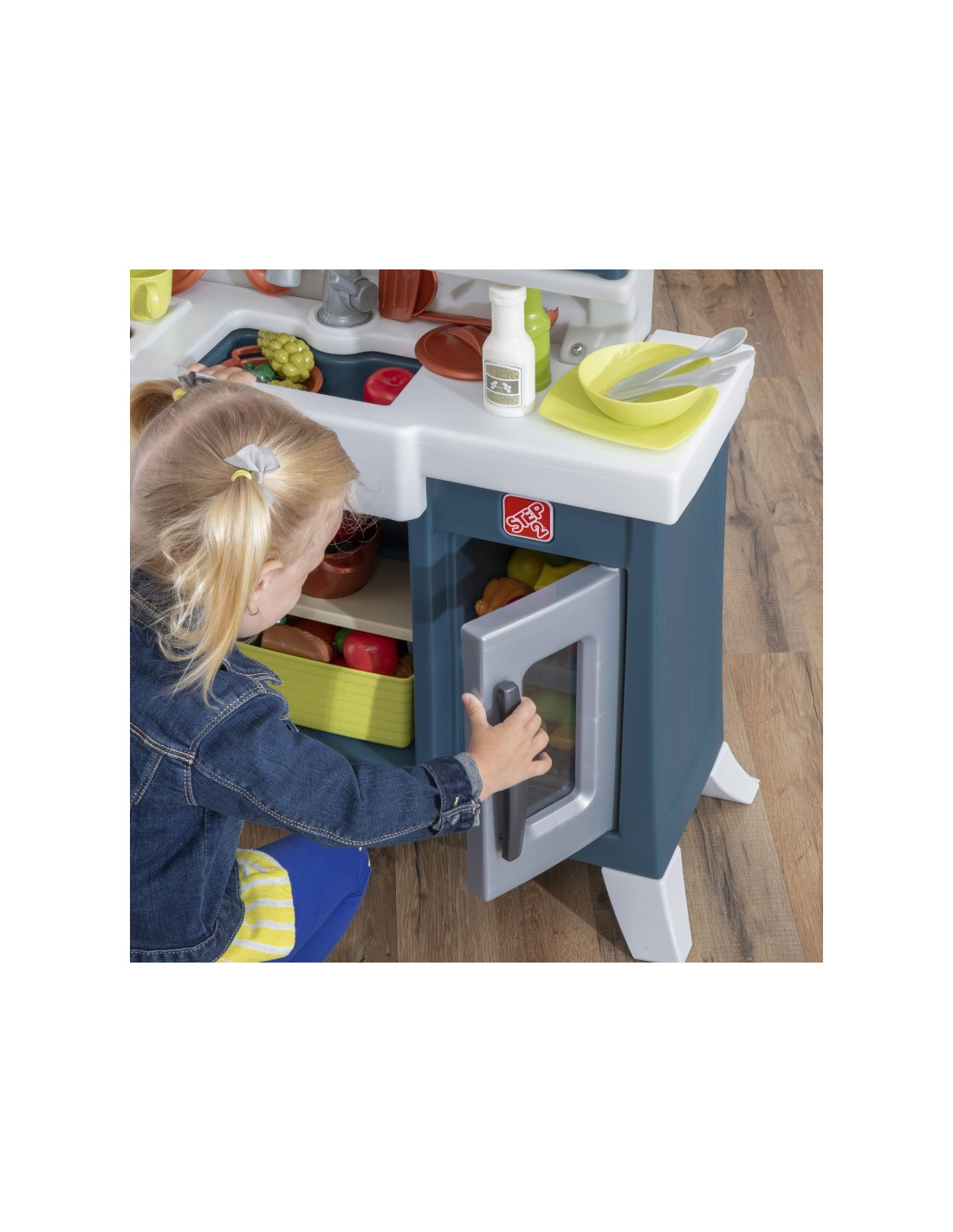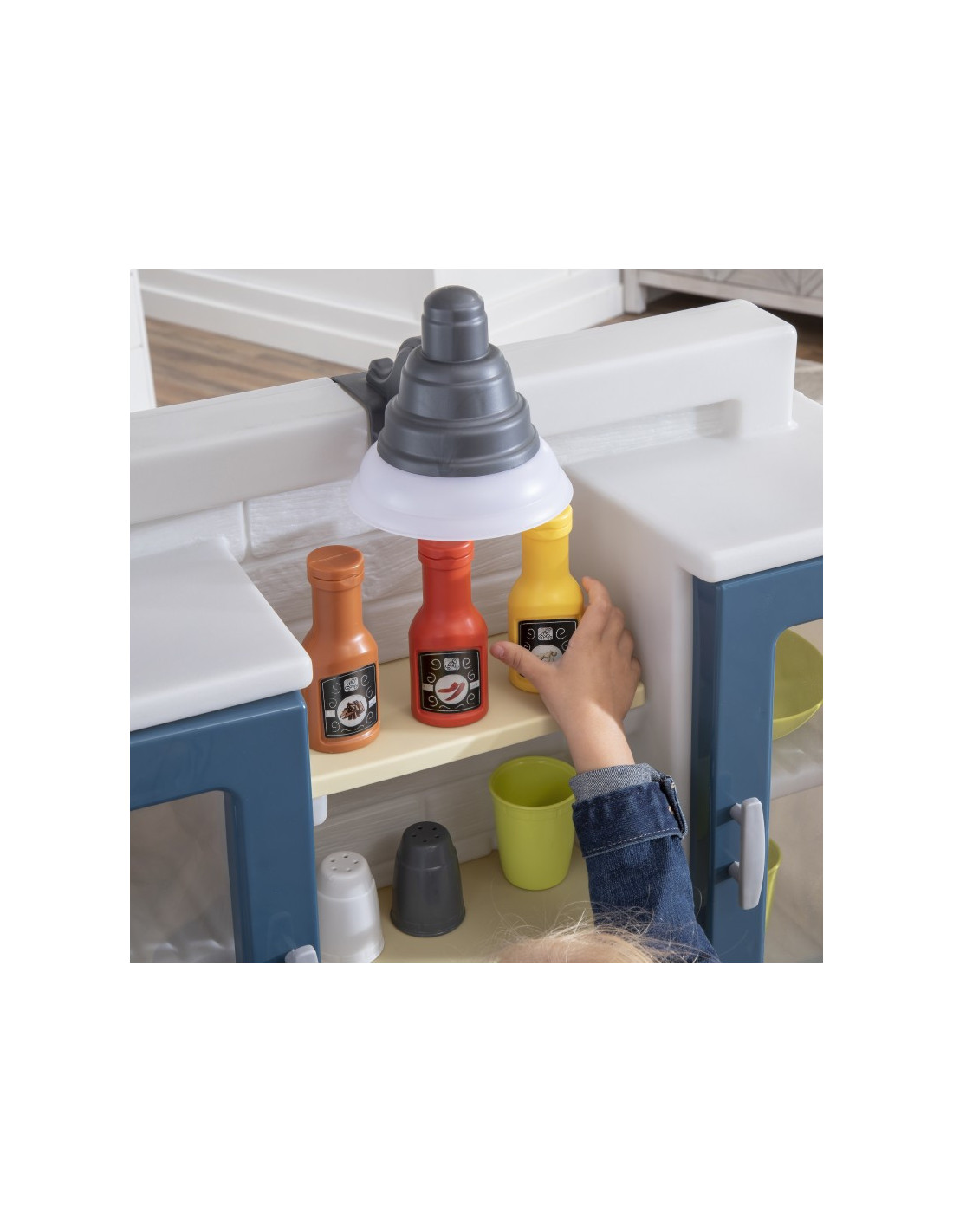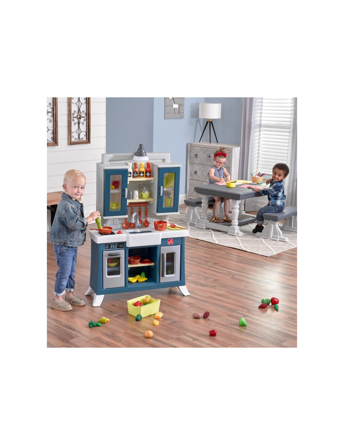 Dziecięca kuchnia do zabawy firmy Step2 charakteryzuje się realistyczną estetyką wiejskiego szyku z nowoczesną funkcjonalnością i mnóstwem miejsca do przechowywania! Przygotuj posiłki na dużym blacie ze sztucznego granitu. Sięgnij do górnych szafek z półkami przeznaczonych na kubki i talerze do nakrycia stołu. Zabawka posiada zlew w wiejskim stylu z kranem, realistyczny „miedziany” wiszący drążek do przechowywania. Ta kuchnia jest stylowym dodatkiem każdej przestrzeni do zabawy. Palnik elektroniczny posiada zabawne światła i realistyczne odgłosy skwierczenia, a działająca lampa wisząca nad zlewem urzeczywistnia zabawę w kuchni Produkt wymaga 2 baterii „AA” i 2 „AAA” (brak w zestawie)