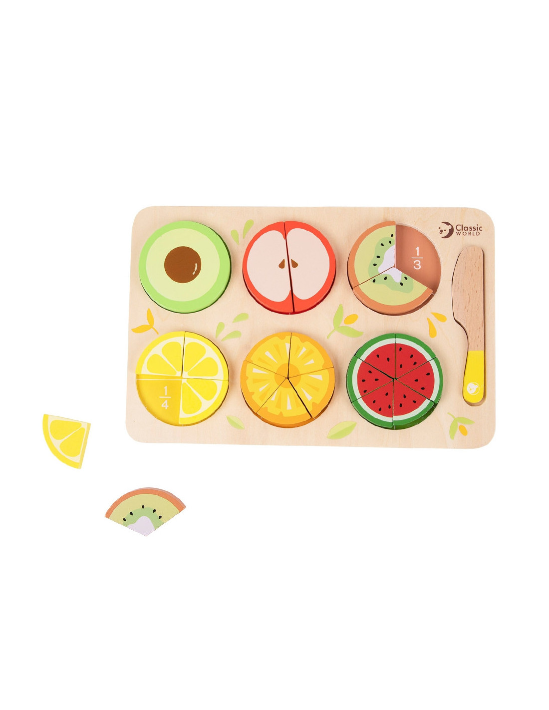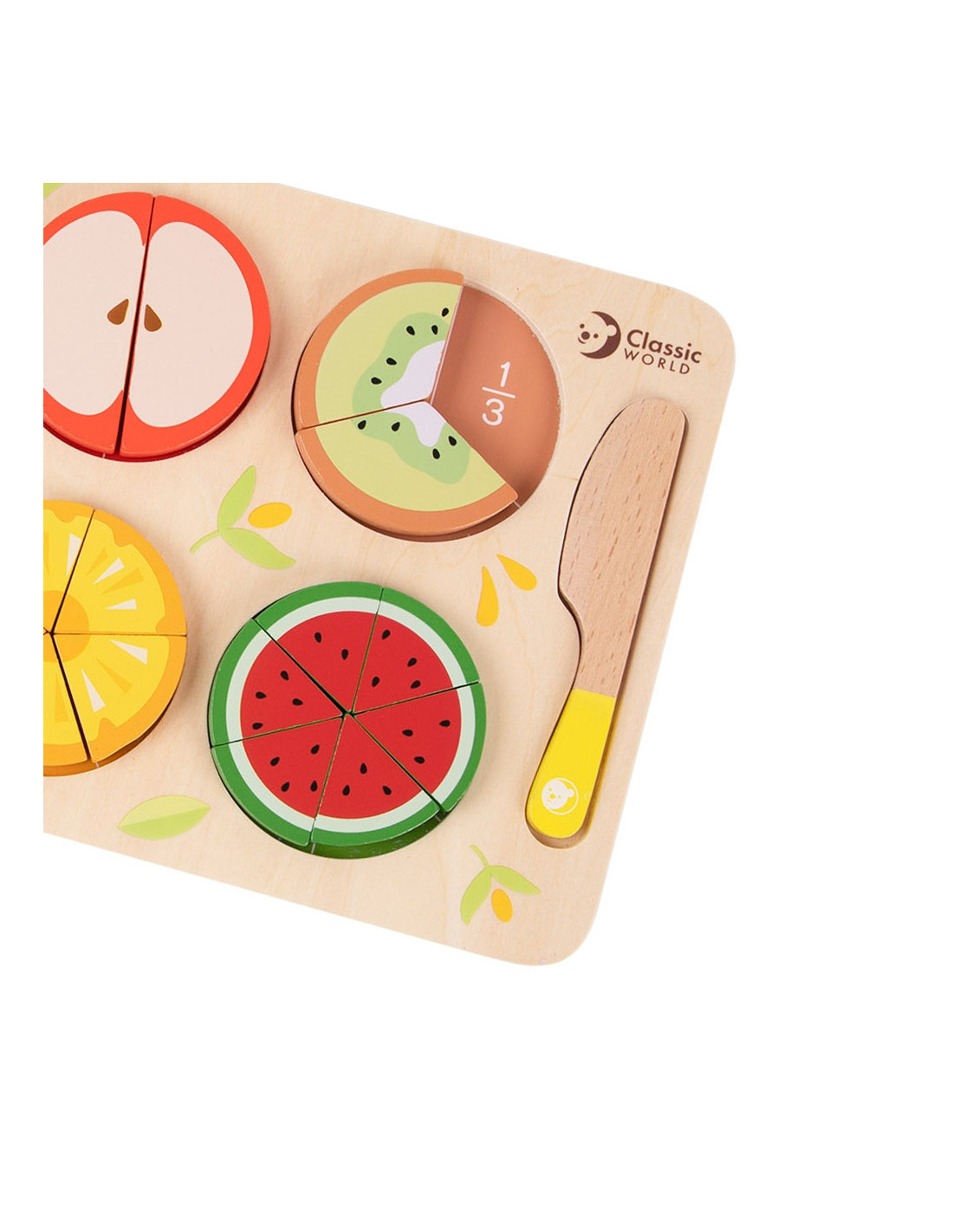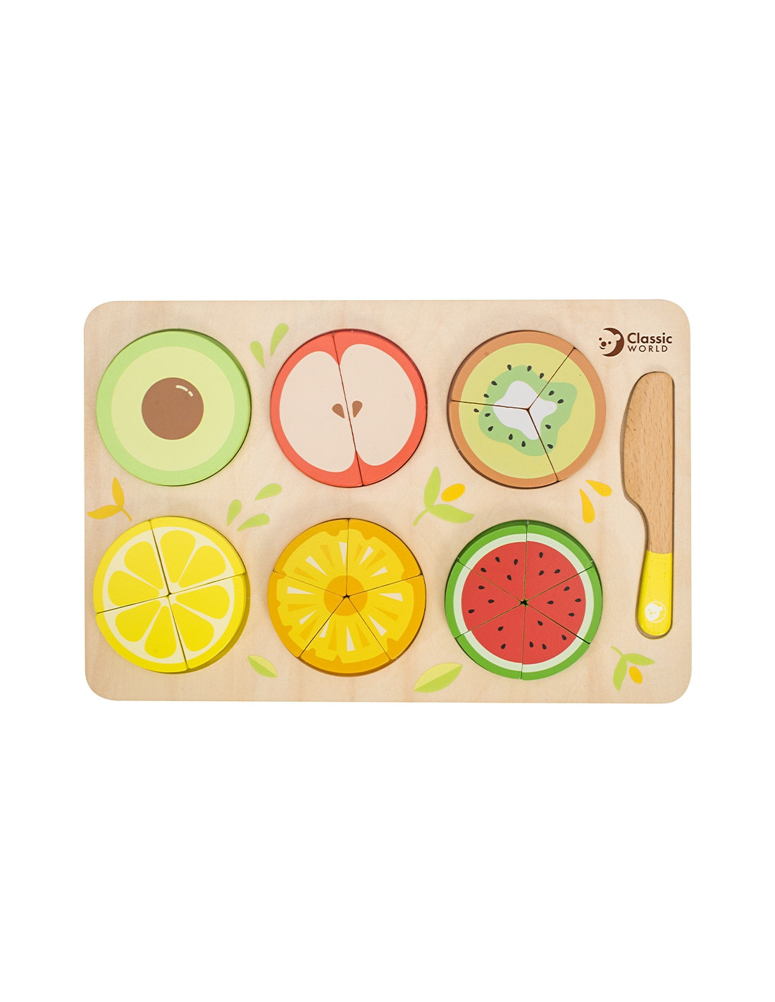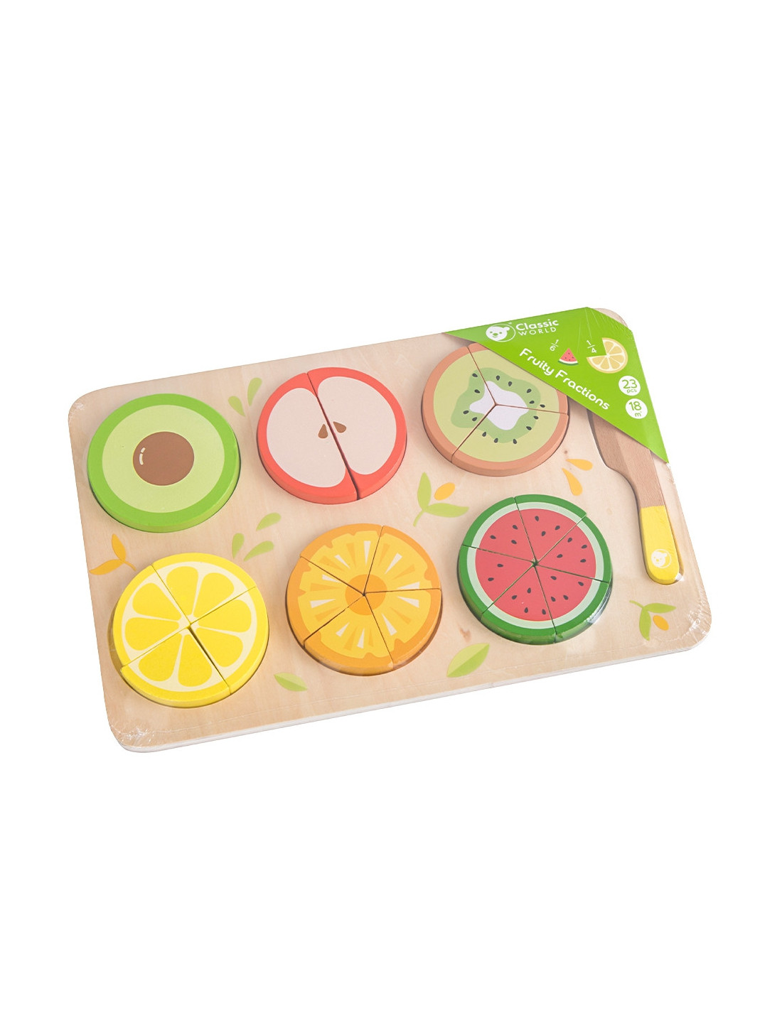 The CLASSIC WORLD fruit chopping set is a great addition to play for little chefs who love playing house or cooking. The set contains 23 pieces. This game allows for role-playing from a young age and serves an educational purpose, including learning fractions and division . This product is a fantastic way to have fun! The beautiful colors and simulated fruit will encourage endless play. Your little one will learn colors and how to distinguish between different fruits . The set is designed with little hands in mind. The absence of sharp edges makes it 100% child-safe.