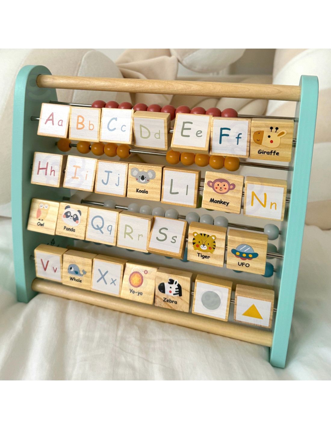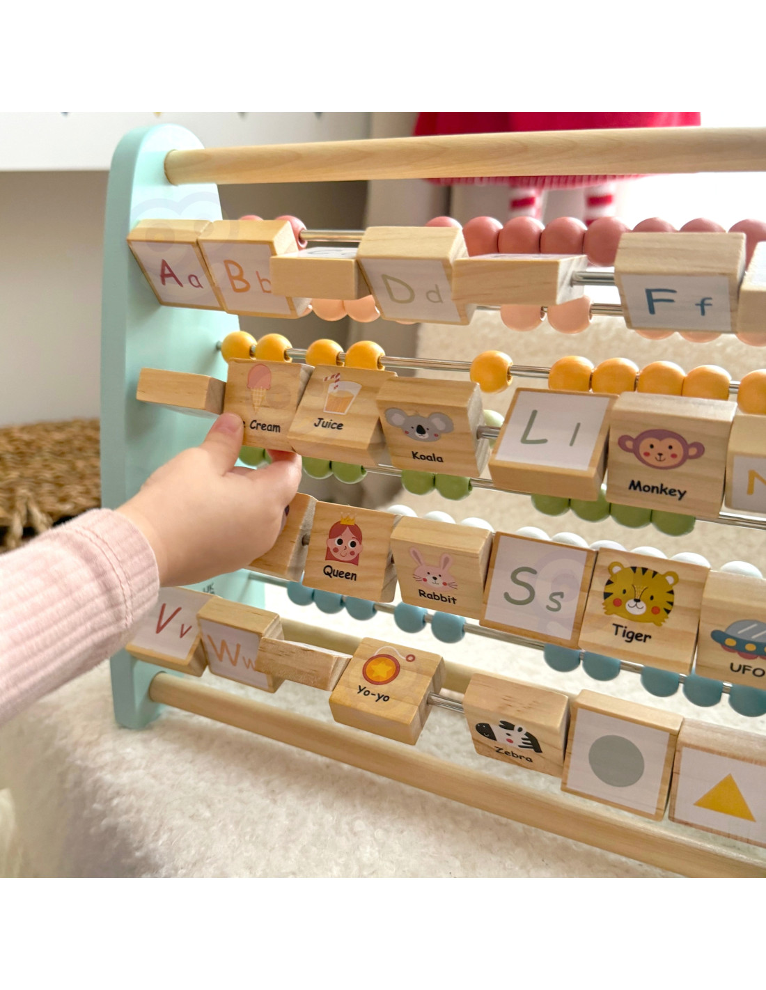On the one hand, children can discover the timeless charm of a classic beaded abacus , ideal for developing basic counting skills and mathematical concepts. On the other hand, a unique surprise awaits – an alphabet abacus , whose blocks feature uppercase and lowercase letters of the alphabet. Each block features a picture associated with a given letter, making learning engaging and fun.