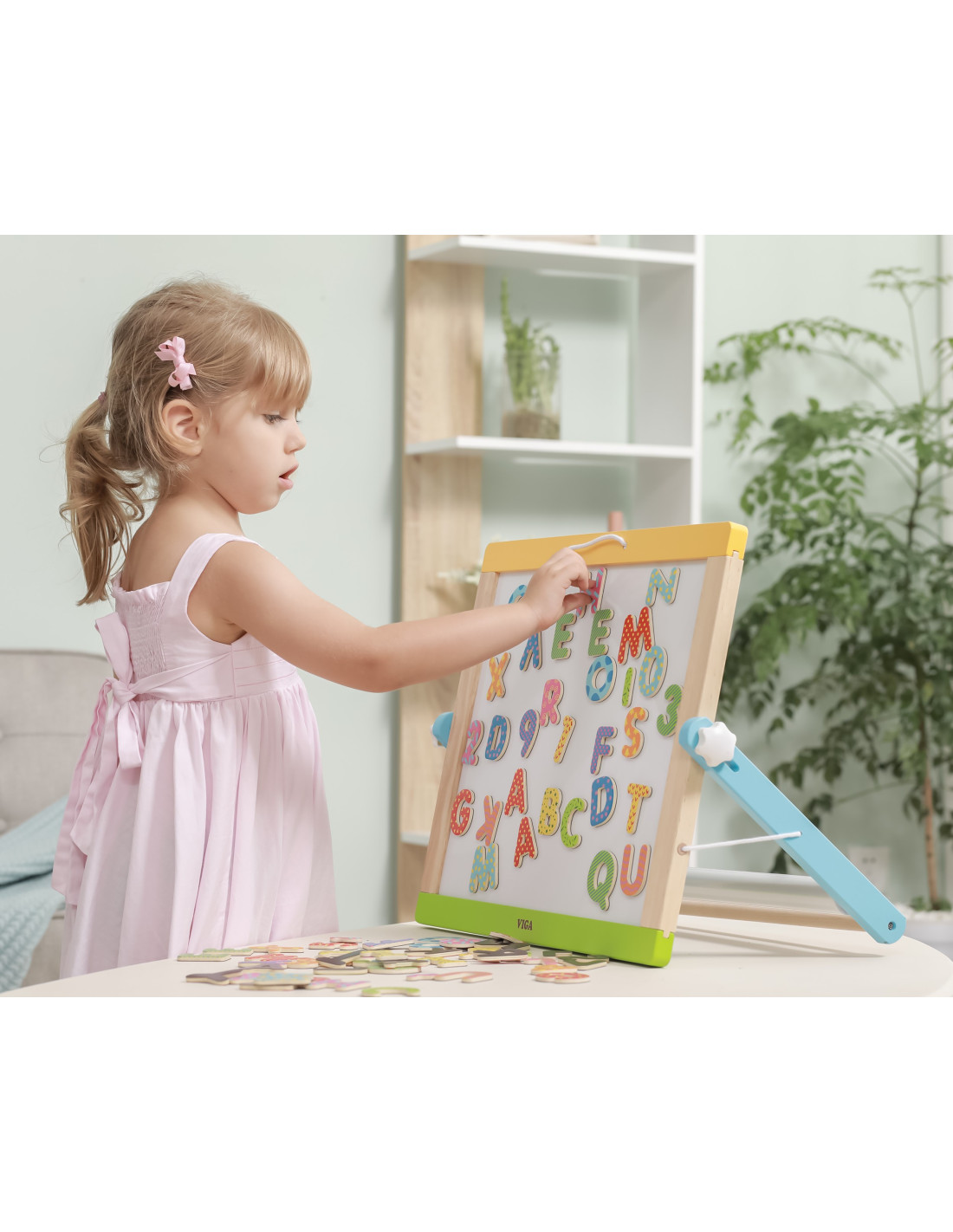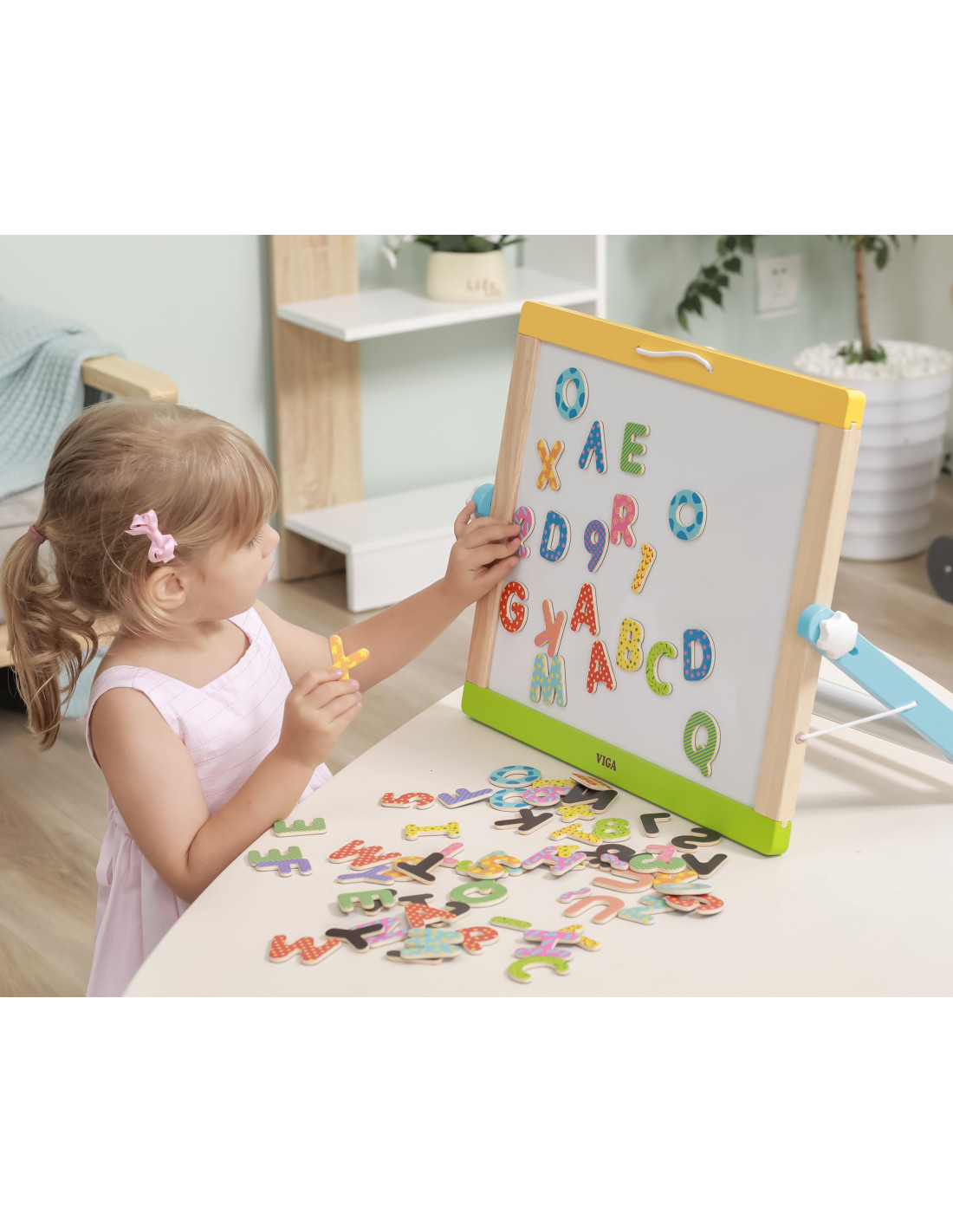 Drewniany zestaw magnetycznych literek i cyferek marki VIGA to świetna układanka, która kształtuje zdolności manualne, uczy alfabetu, pomaga opanować pierwsze działania matematyczne. W skład wchodzi 77 elementów, w tym cyferki i literki. Można je przyczepiać do tablicy magnetycznej oraz lodówki. Dziecko podczas zabawy uczy się kolorów, alfabetu oraz liczenia. Układa słowa, a w później zdania. Dzięki znakom matematycznym może uczyć się dodawać i odejmować. Teraz bez trudu Twoje dziecko posiądzie wiedzę wczesnoprzedszkolną.