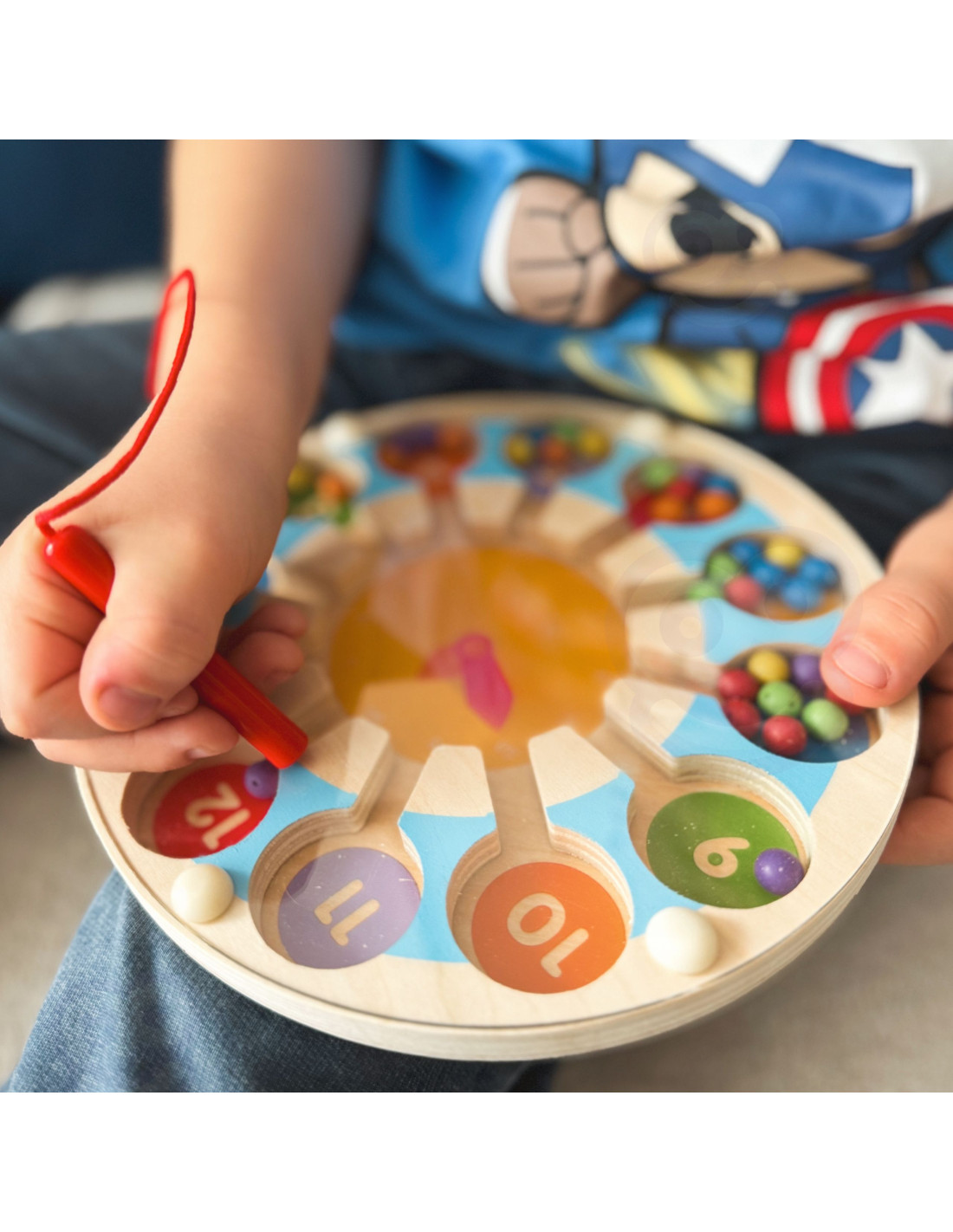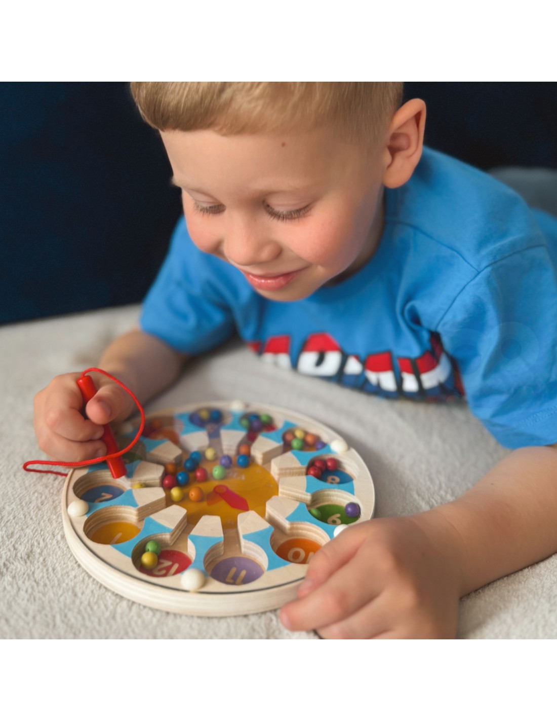 W zegarze znajduje się labirynt z kuleczkami – które można w dwa sposoby przeprowadzić przez cały labirynt. Tradycyjnie – za pomocą magnetycznej „różdżki”, co wymaga od dziecka skupienia, dokładności oraz logicznego myślenia. Drugim sposobem - obracanie zabawki, co dodatkowo wpłynie na zmysł koncentracji oraz logicznego myślenia.