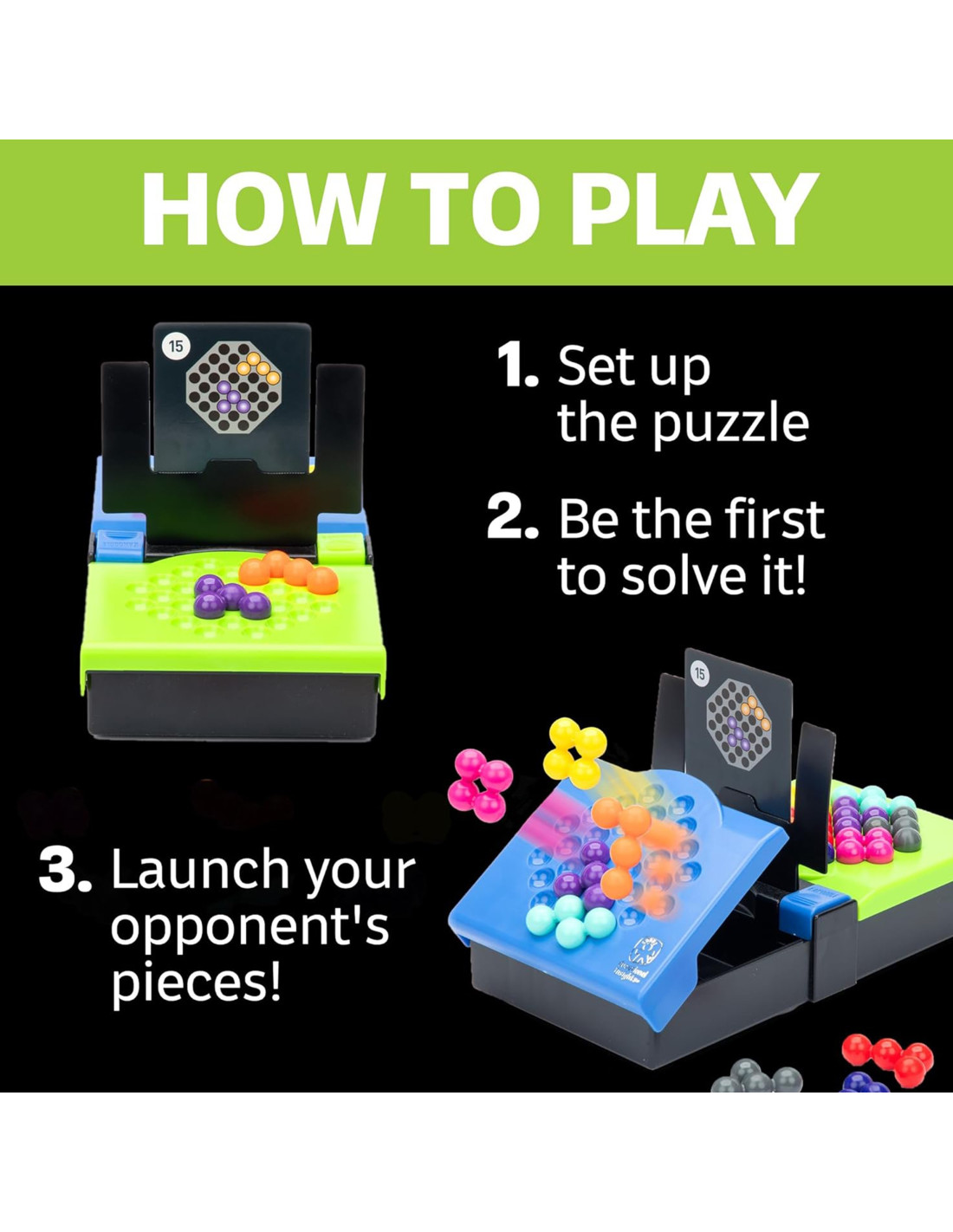 - The first player to form a pattern presses a button on the side of the board, causing the balls to scatter from the opponent's board.