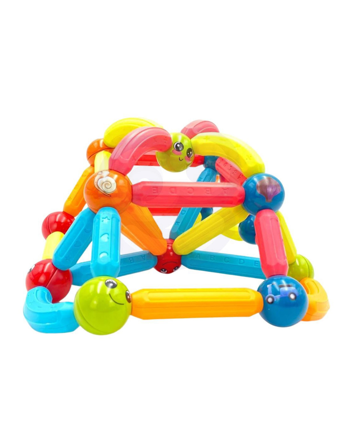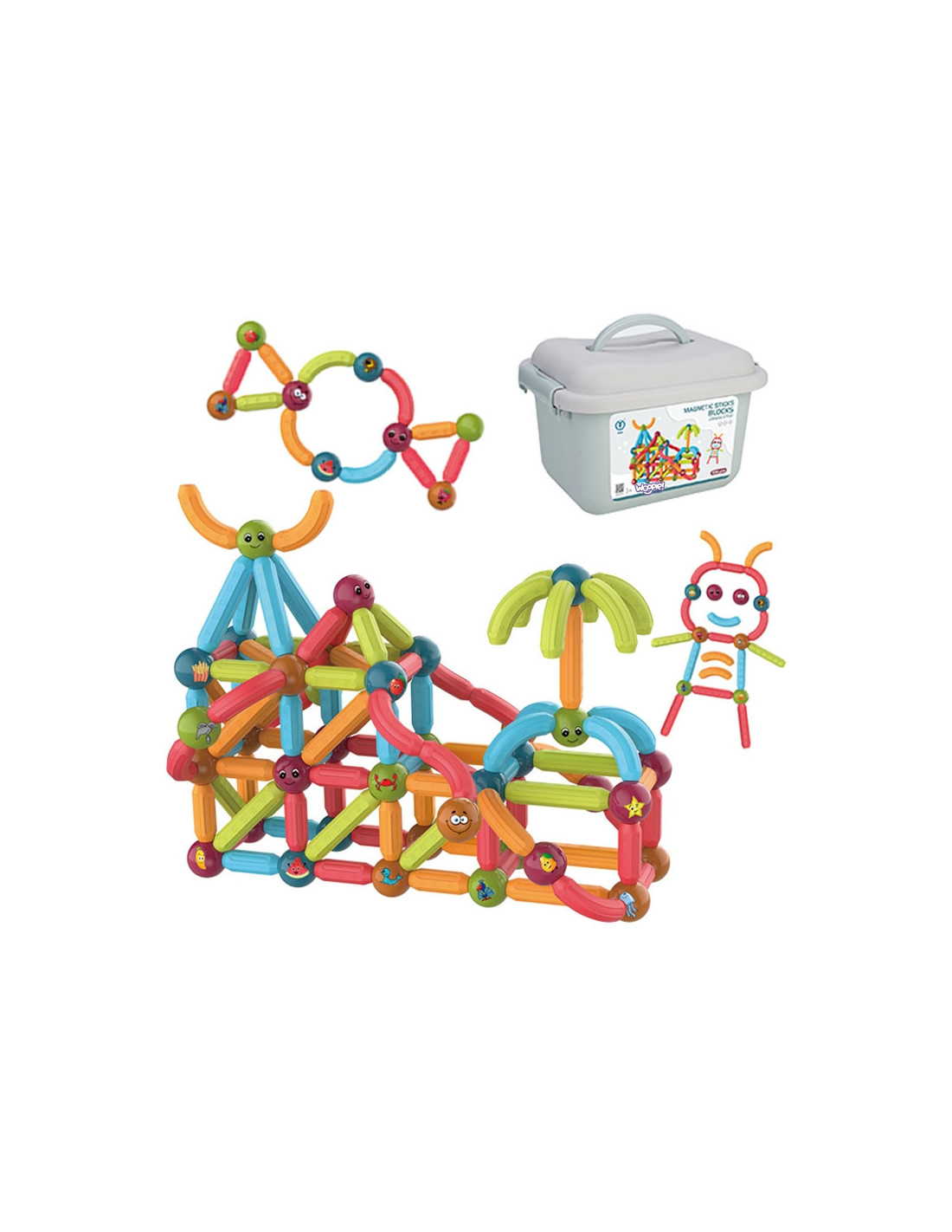 This set of thick magnetic blocks from WOOPIE combines fun and learning ! Just connect the pieces and start creating elaborate structures and many other arrangements, such as geometric shapes or a mini house! The only limit is your imagination . The set contains 128 pieces and a pattern card. The blocks are thick , colorful , and safe —perfect for small children's hands. The blocks' educational functions include learning the alphabet, counting, and shapes . The balls feature animals and smiles, among other things . Everything is packaged in a convenient box. Building structures with the blocks develops children's creativity , fine motor skills, spatial awareness , and concentration .