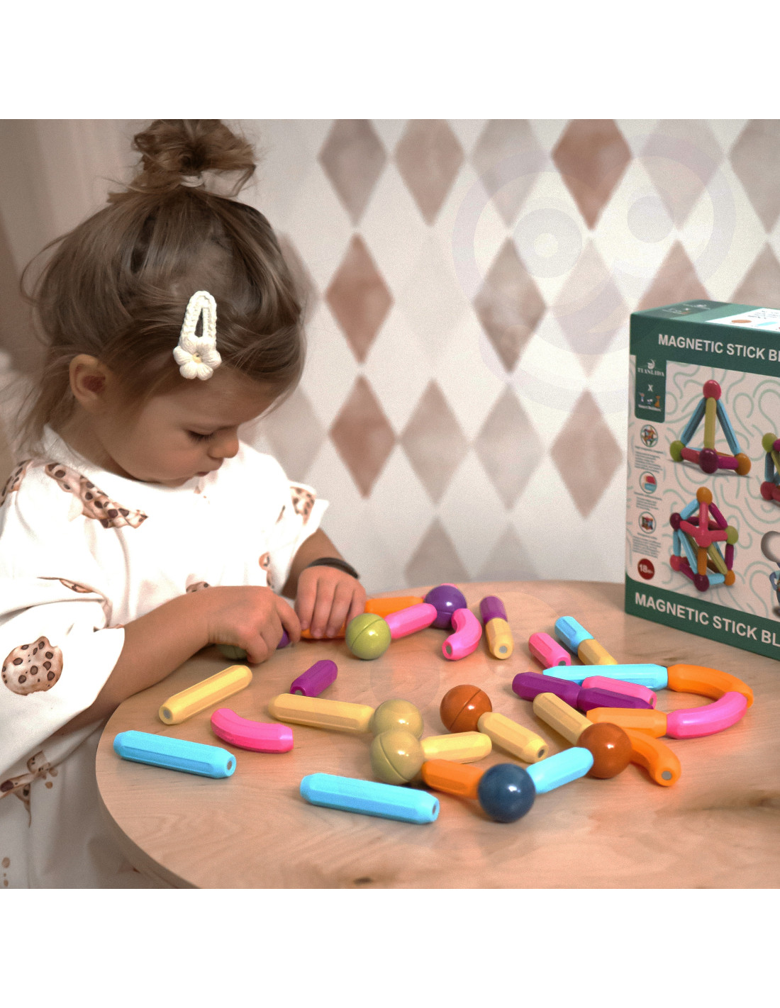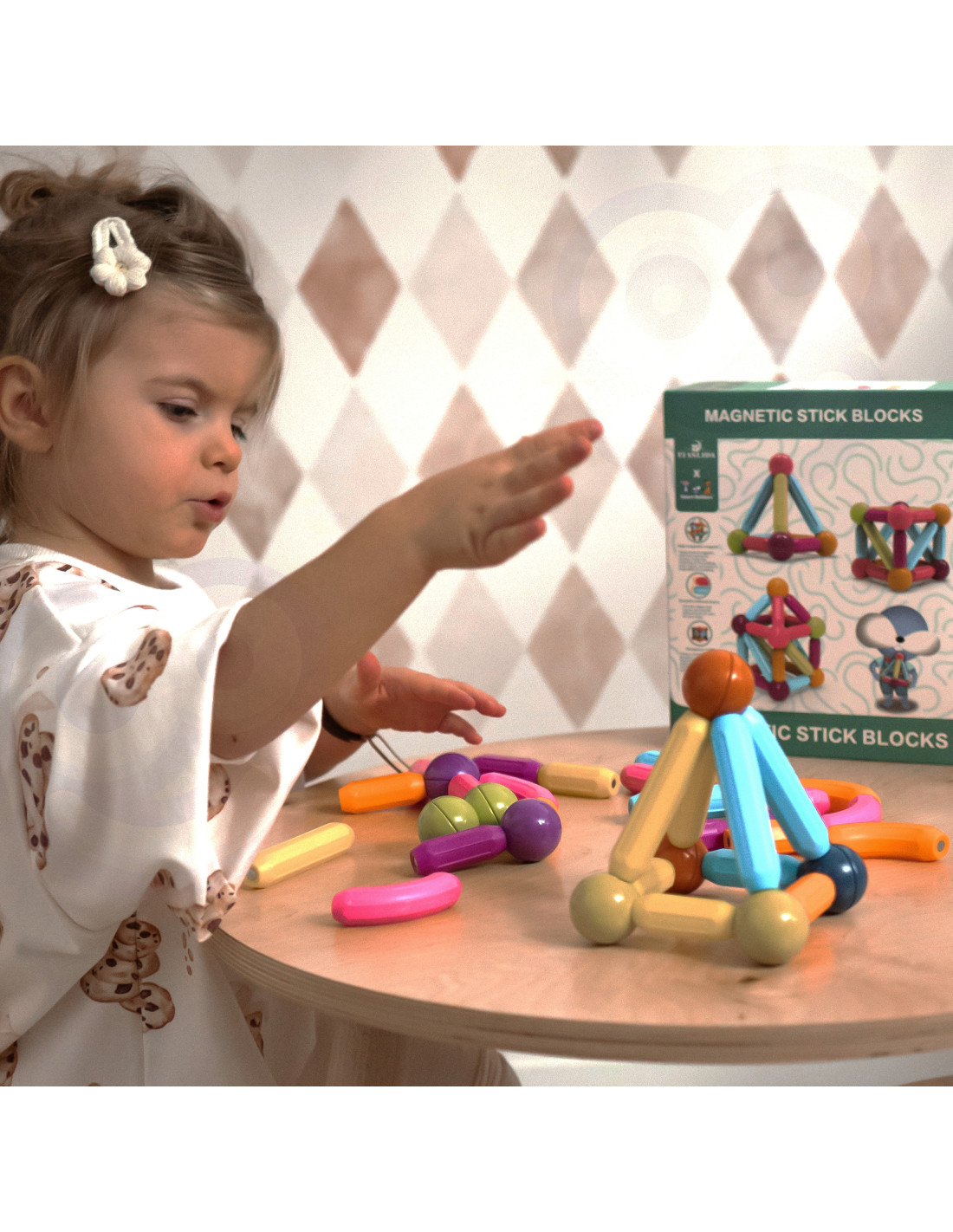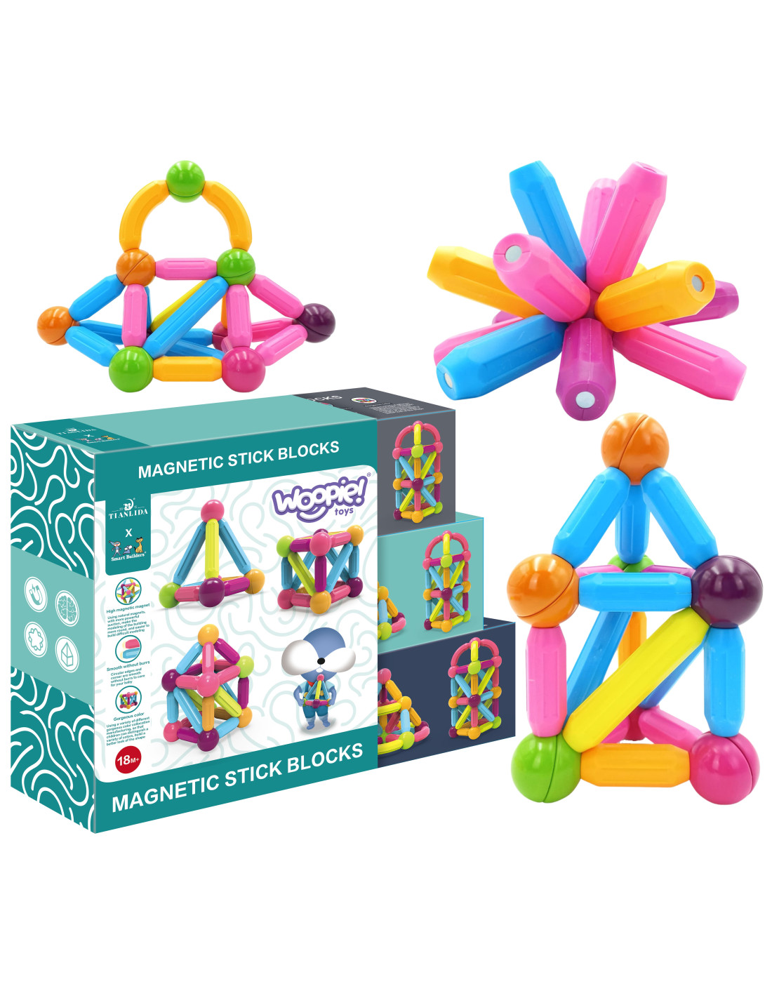 This set of thick magnetic blocks from WOOPIE combines fun and learning ! Just connect the pieces and start creating inventive structures and many other arrangements, such as geometric shapes or a mini house! The only limit is your imagination . The set contains 38 pieces . The blocks are thick , colorful , and safe – perfect for small children's hands. Everything is packed in a convenient box. Building structures with blocks develops children's creativity , fine motor skills, spatial imagination , and concentration .