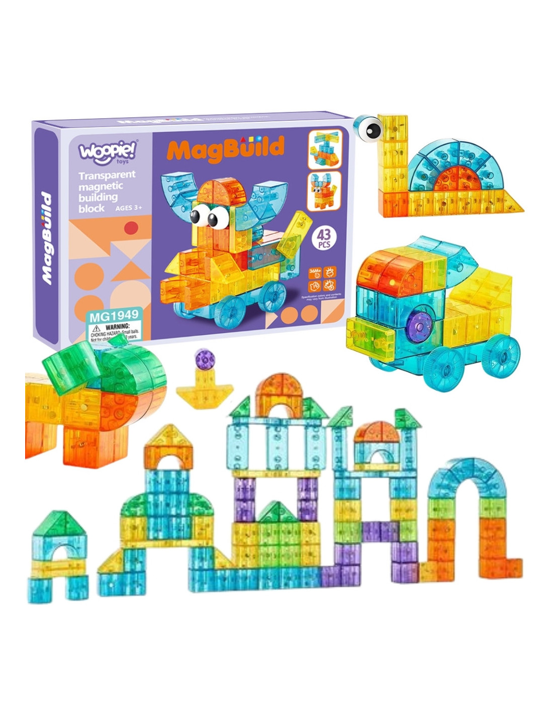 Woopie 's magical, transparent magnetic blocks transport children to a world of building full of color, light, and movement – from fun vehicles and animals to imaginative structures and arched tracks that assemble themselves thanks to hidden magnets and lightweight, smooth pieces that are easy for little hands.