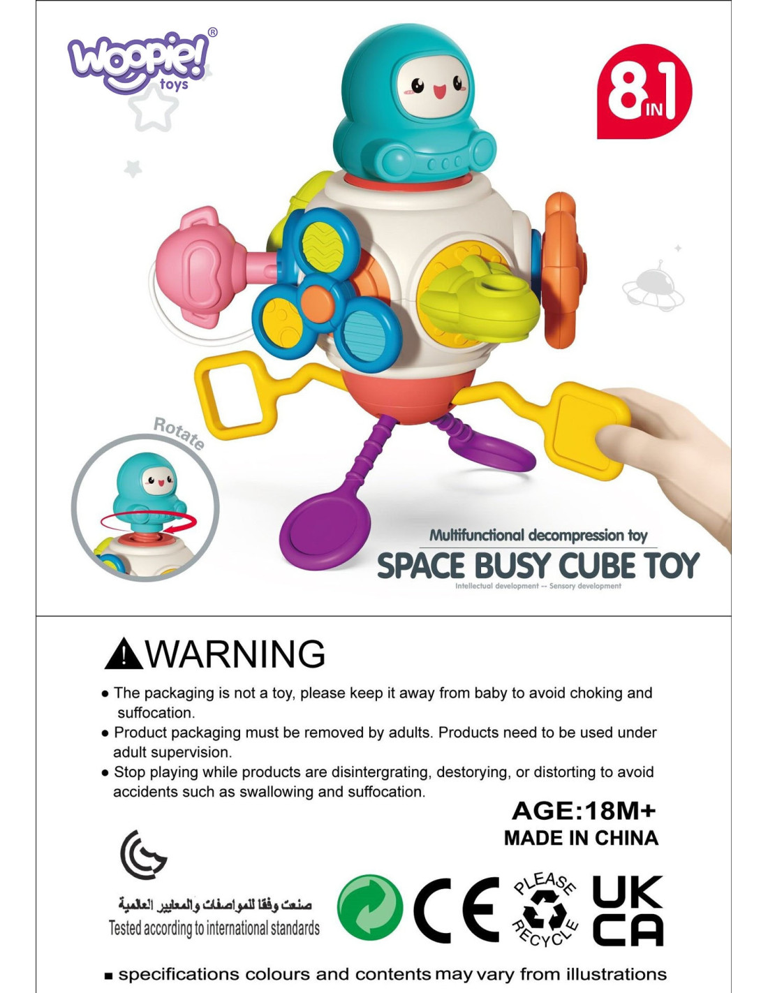The Montessori Cube Space Rocket Cube from WOOPIE is a colorful, educational sensory cube for children aged 18 months and up . It contains eight activity panels that stimulate the child's senses and develop motor skills. The toy is safe, made of high-quality materials, and designed with child development and safety in mind.