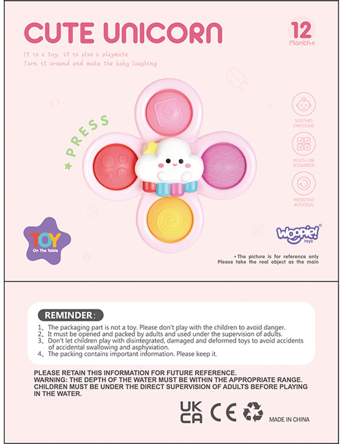 This set of adorable spinners from the WOOPIE brand will make a big impression on your child. The set includes three spinners: Unicorn, Star, and Cloud. Your child can take these spinners anywhere thanks to the rubber suction cups . You can attach the spinner to a window while traveling or to the bathtub during bath time (the toy can be wet). The spinners' bearings guarantee long-lasting spins . Detachable elements allow you to connect them in any way you like. The toys feature rubber elements with different surfaces, which will develop your child's senses and have a stress-relieving effect. Playing develops manual dexterity and improves hand-eye coordination . These toys can act as a relaxation and stress-reduction tool , helping them achieve a state of calm and tranquility .