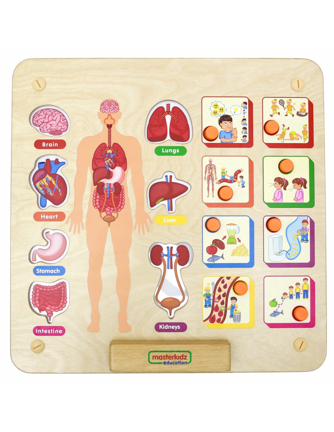 - - w prosty sposób tablica wyjaśnia dzieciom jak działają poszczególne narządy w ciele, np. mózg kontroluje myślenie, emocje i zmysły, serce pompuje krew po całym ciele, płuca pomagają oddychać, żołądek pomaga w rozbijaniu pokarmu, jelita pomagają w trawieniu pokarmu