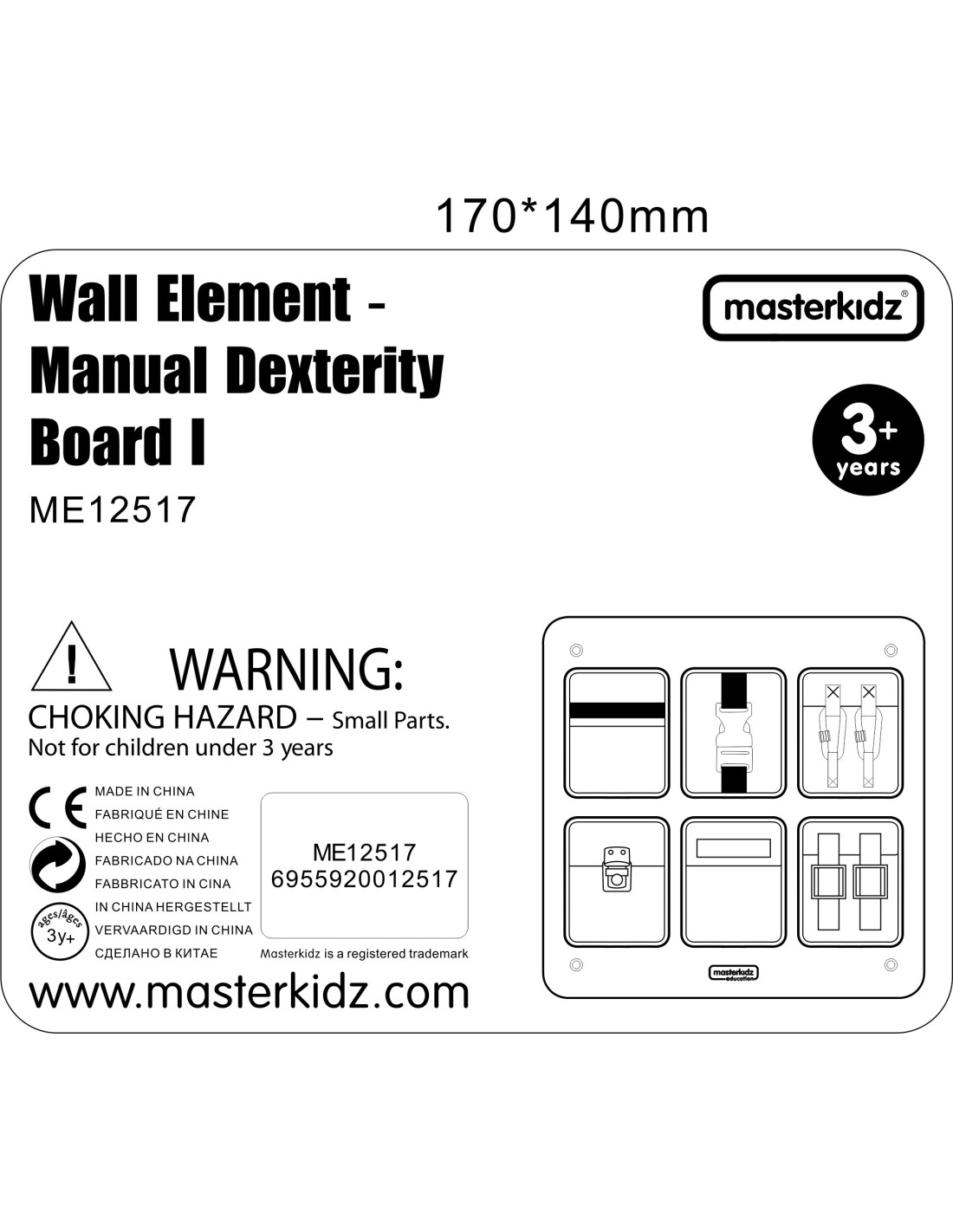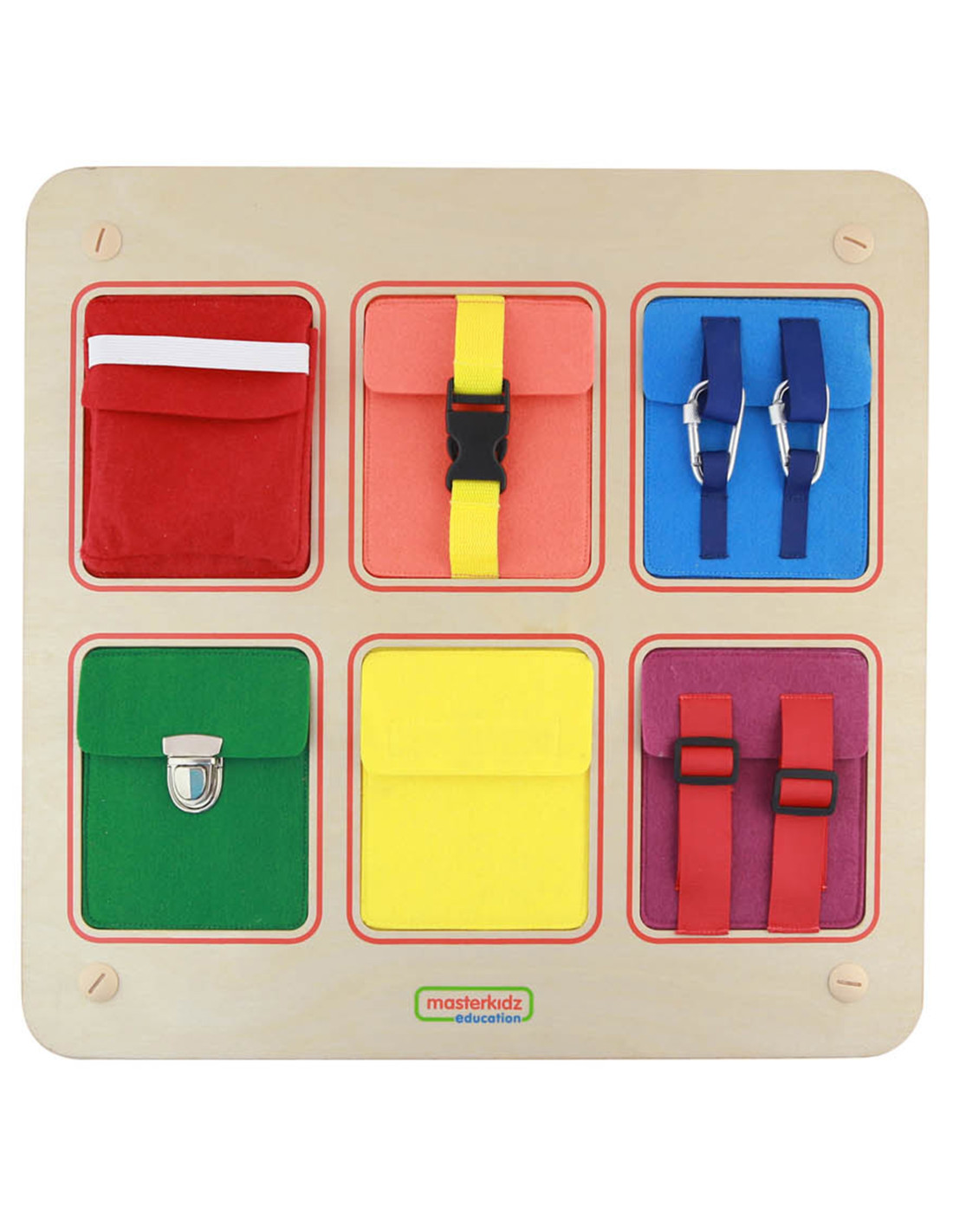 This Masterkidz wall board can be mounted on the wall or in the Masterkidz Flex system. The board features six colorful fabric pockets, each secured with a variety of clasps and zippers. Children can use these pockets to learn how to open and close various types of closures.