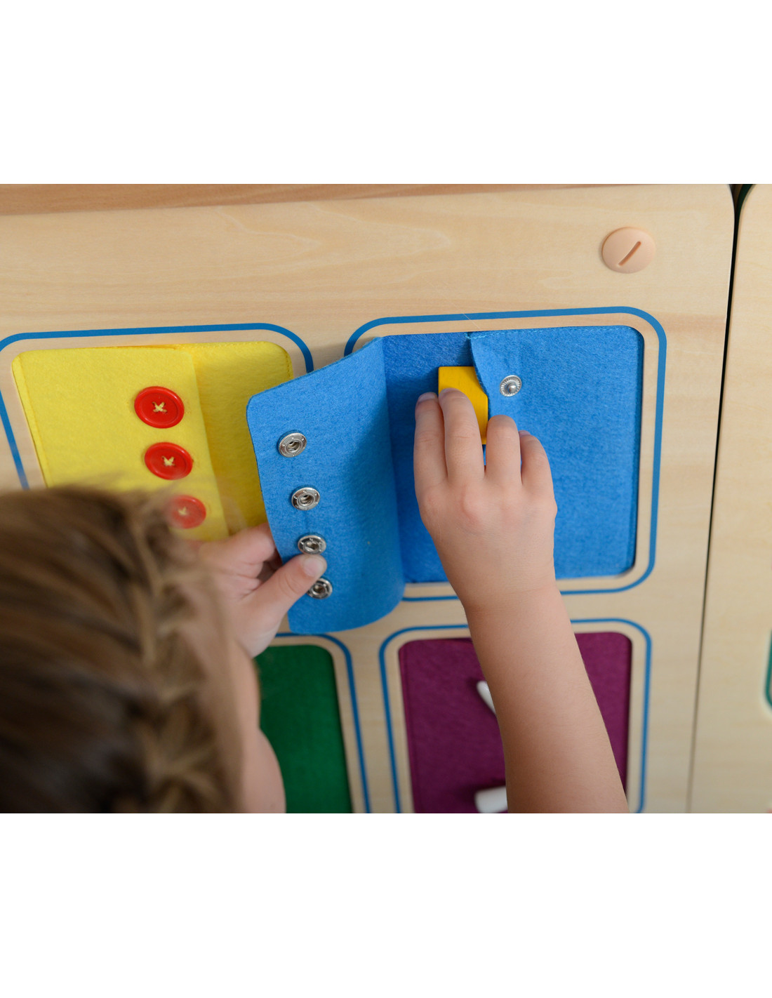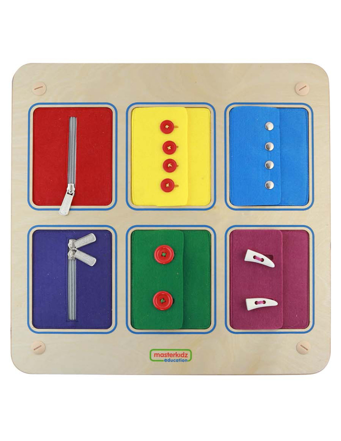 This wooden wall board can be mounted directly on the wall, or used with the Masterkidz Flex system – either wall-mounted or freestanding. The board features six colorful pockets with various types of zippers and fasteners, such as zippers and buttons. This toy will easily teach your child how to manage even the most difficult zippers.