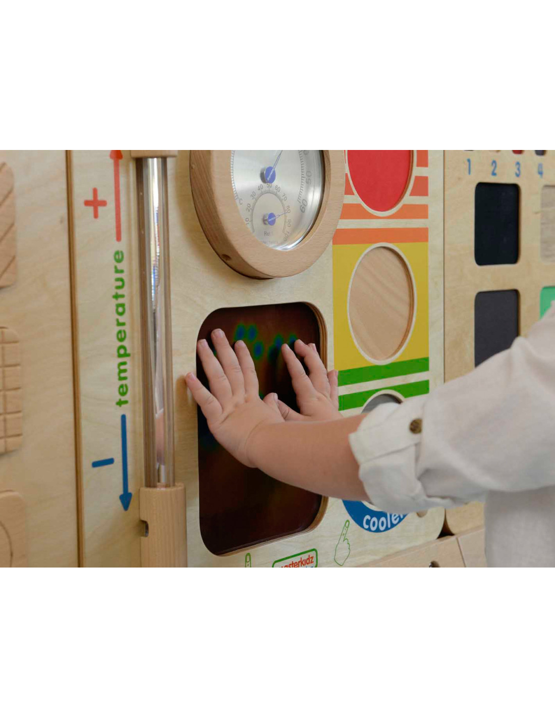 A fantastic educational board that helps children learn to recognize heat and cold. It's a great teaching aid for science and basic physics lessons. The board features several areas: warm , neutral , and cold , as well as a heat-sensitive board , where we see the imprints of a warm hand . The board also includes a thermometer .