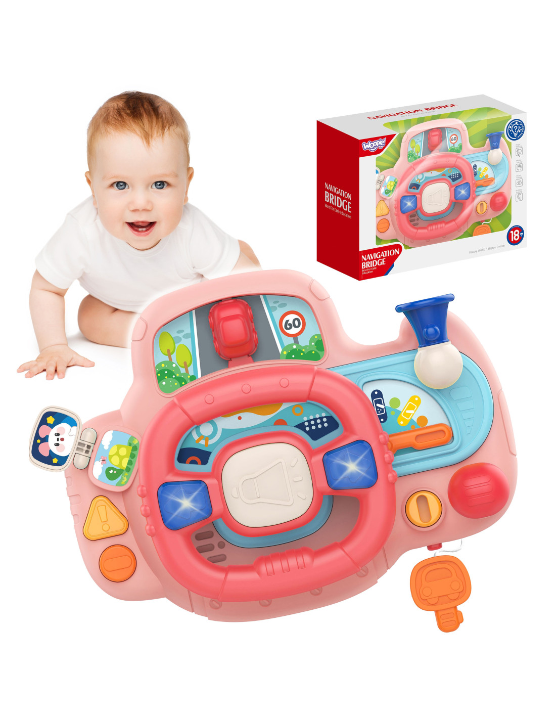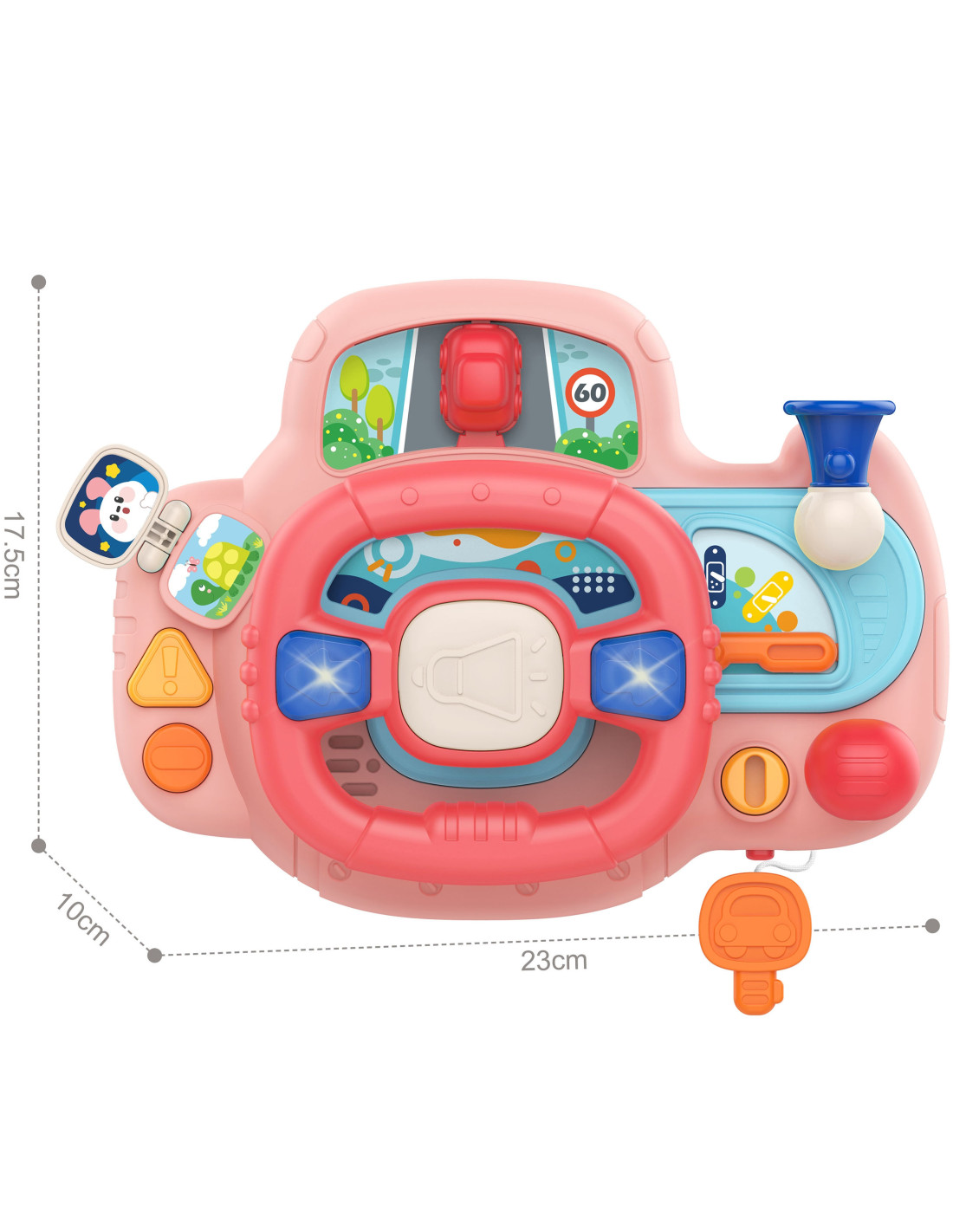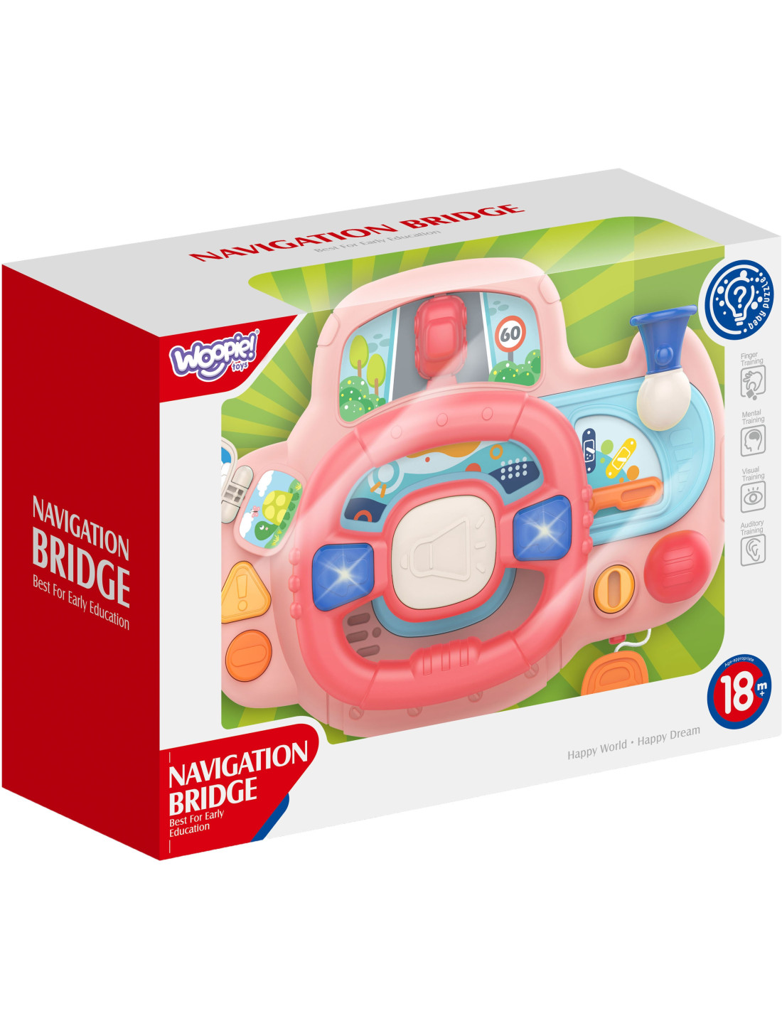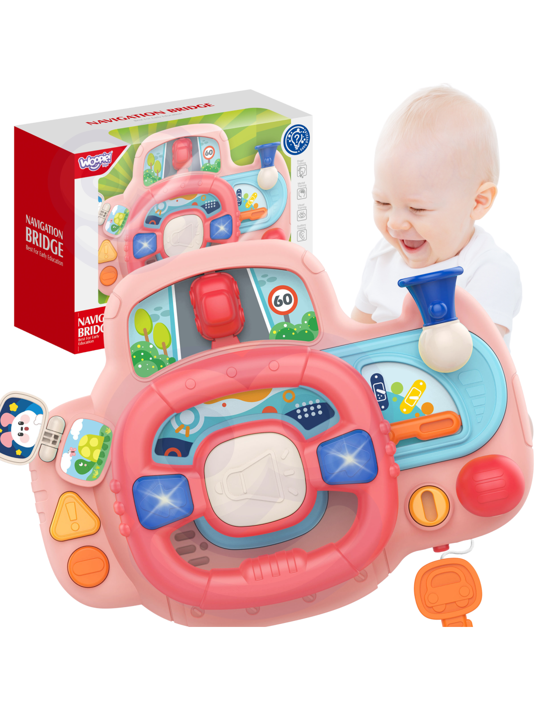 An electronic steering wheel , full of activity and fun, from the WOOPIE brand. This toy features buttons, lights, and sounds that simulate a realistic driving experience , engaging and stimulating your child's imagination. Turning the steering wheel moves the car, providing additional fun for your little one. The steering wheel with a control panel offers 11 functions , providing hours of fun. Additionally, the product can be attached to a crib, car seat, and many other places using seat belts.