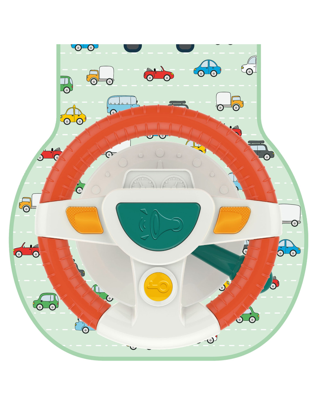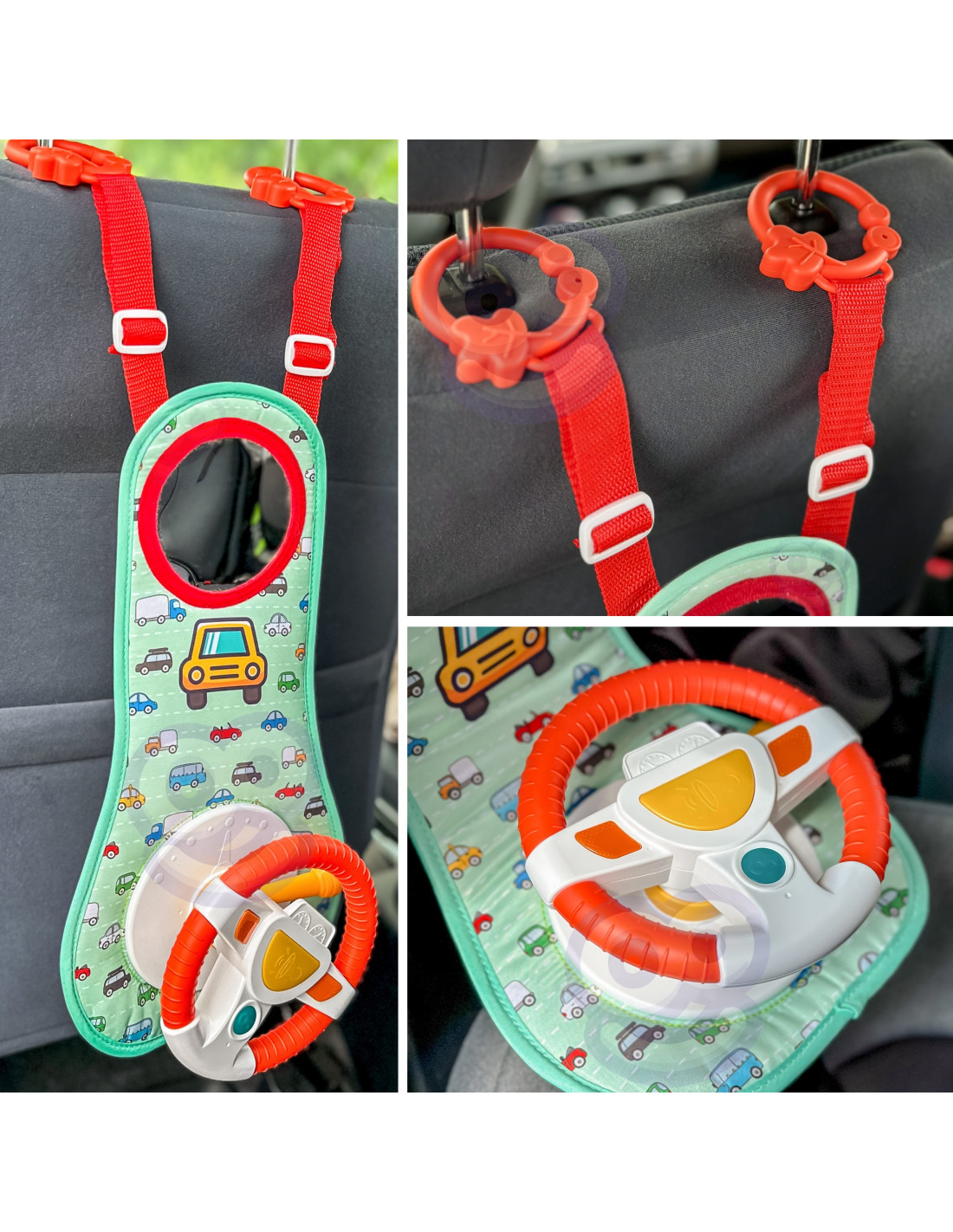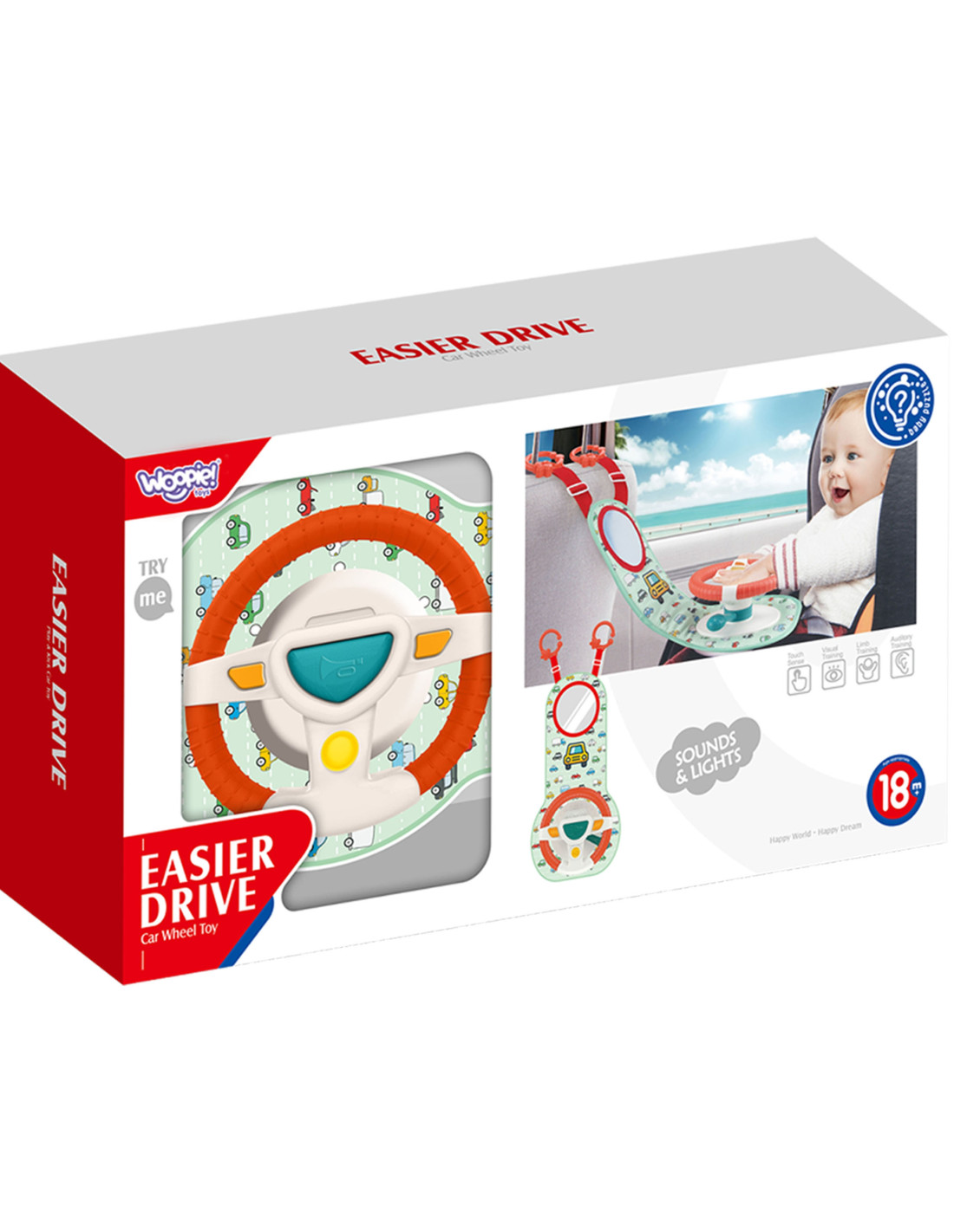 The interactive car steering wheel from WOOPIE will provide your child with endless fun on long journeys. Children can imitate their parents' actions, role-playing as drivers . They can use the horn , turn signals , start the engine, and look in the plastic mirror . All steering wheel components make sounds and light up , adding to the fun. Children love imitating adults, and this toy allows them to do so in a safe and controlled manner. All components are securely attached , free of sharp edges, and the steering wheel easily attaches to the front seat headrest .