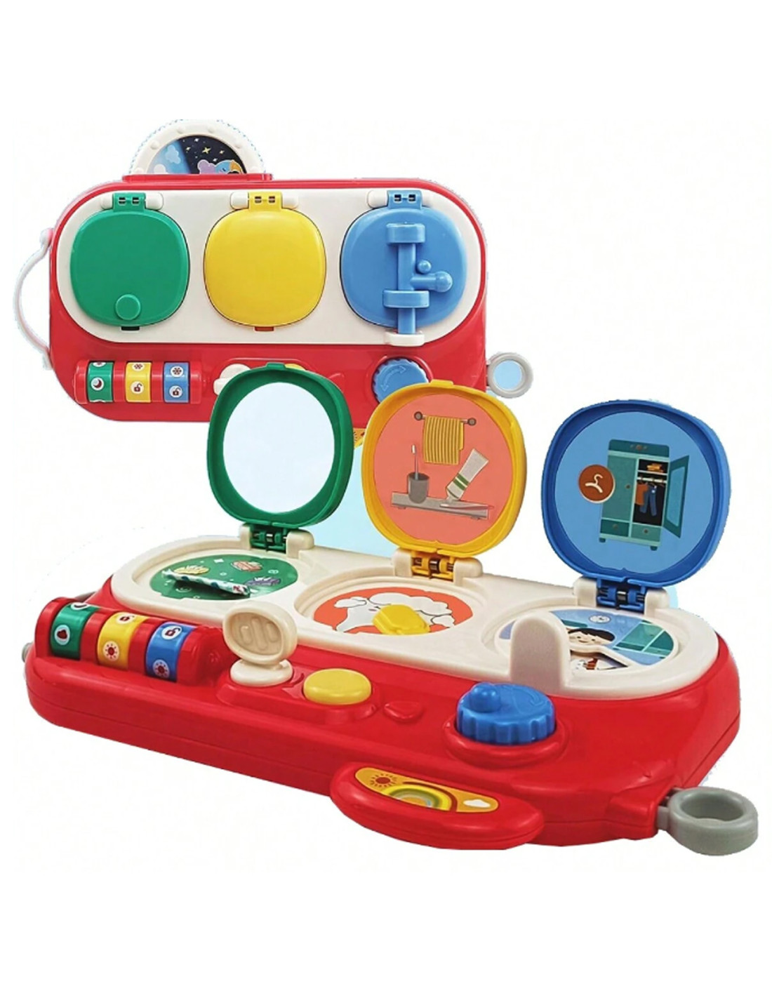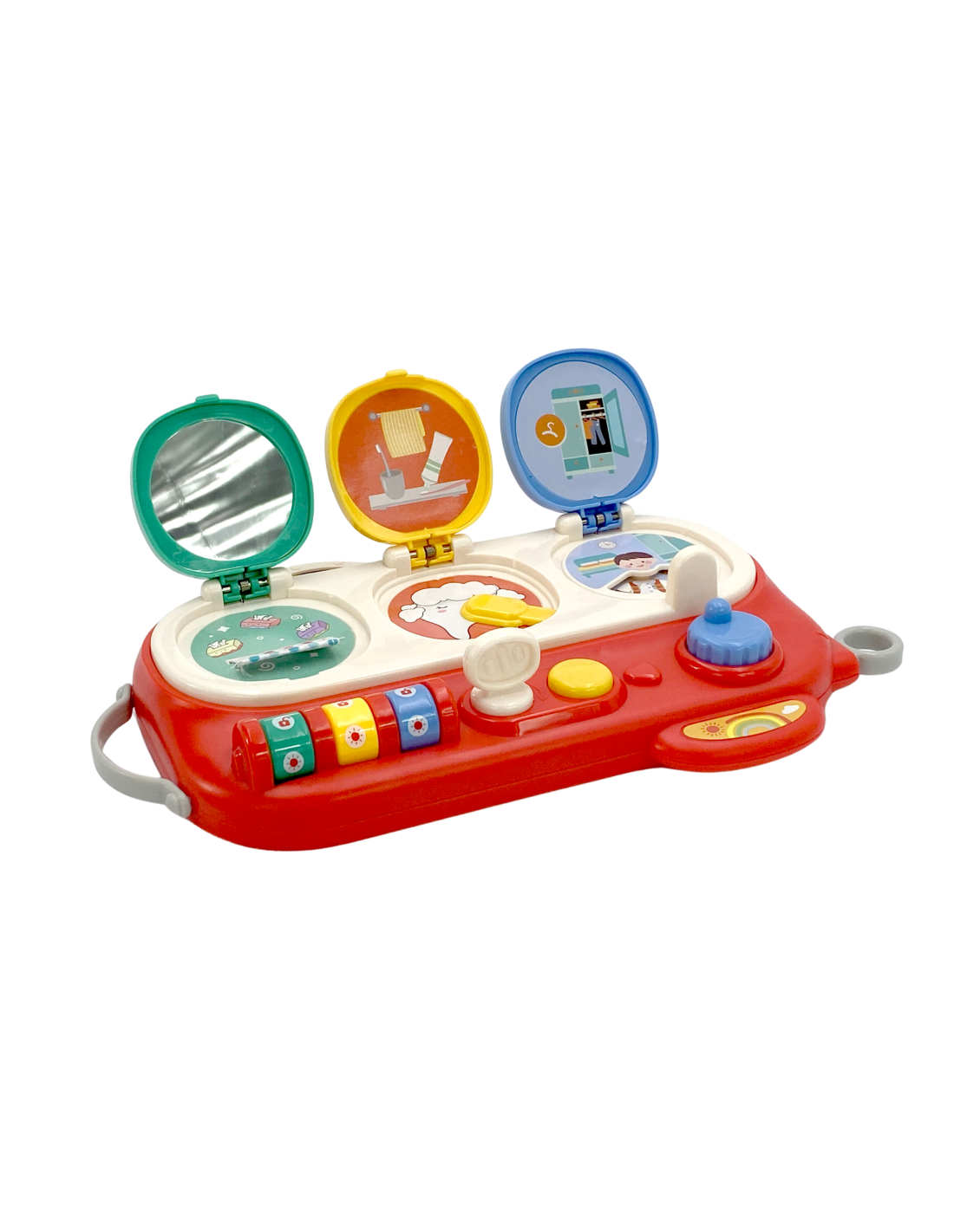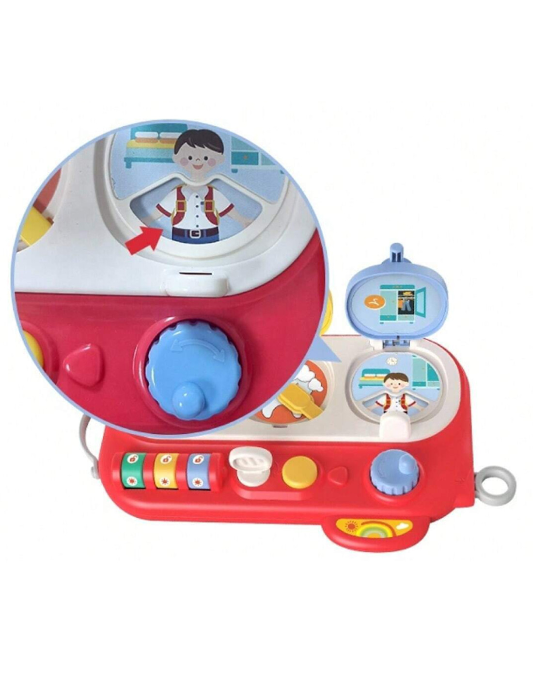 The blue window opens using the yellow button and blue knob. Once opened, children discover a boy and a rotating box of clothes that change when the blue knob is turned. This is a wonderful opportunity to develop creativity and experiment with different combinations.