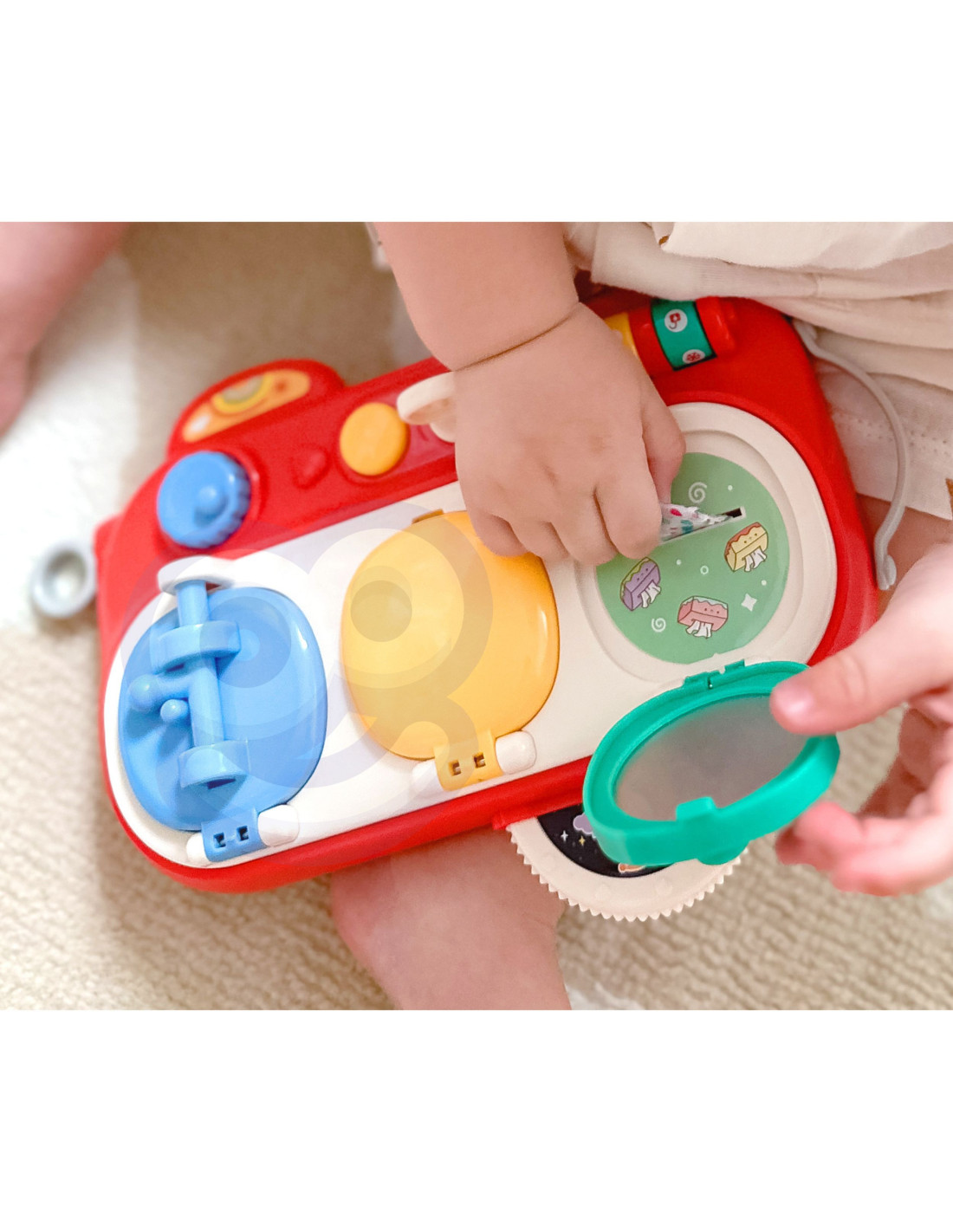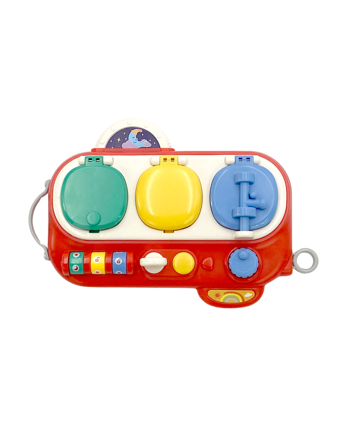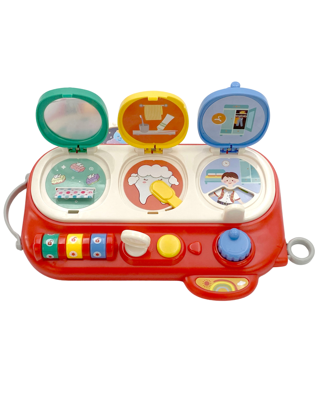 The blue window opens using the yellow button and blue knob. Once opened, children discover a boy and a rotating box of clothes that change when the blue knob is turned. This is a wonderful opportunity to develop creativity and experiment with different combinations.