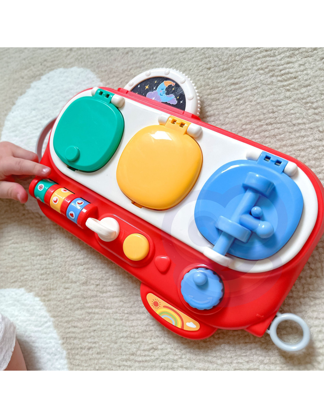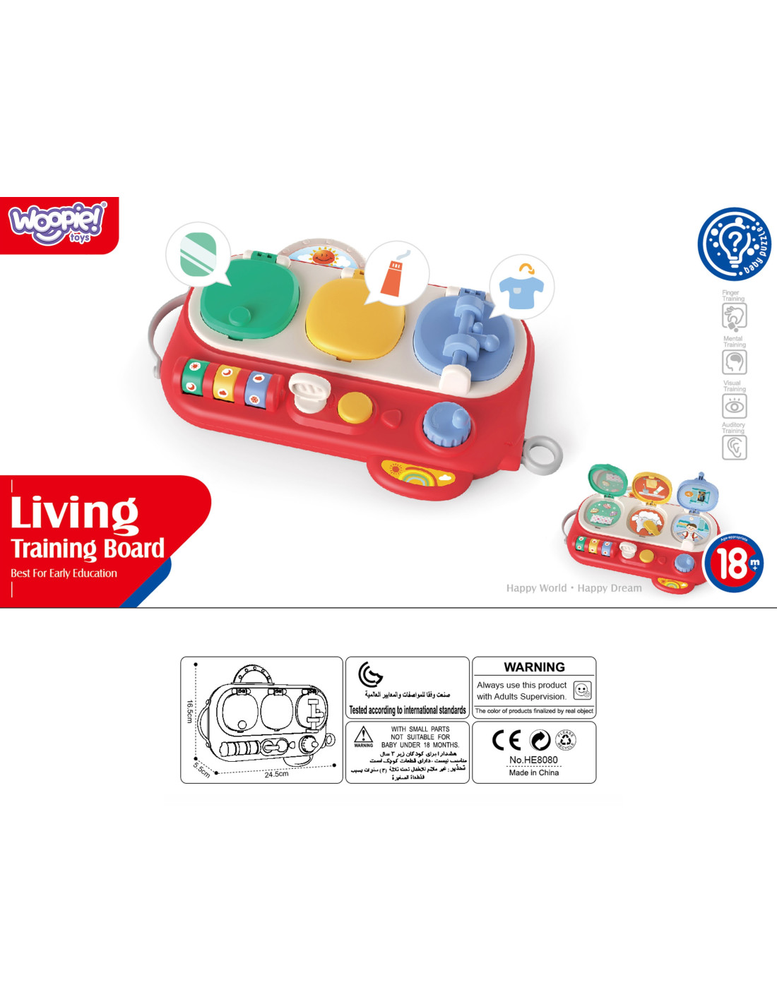 Discover and Check is an educational, interactive toy from the Woopie brand that simultaneously teaches and entertains, promoting manual and visual skills. The toy features three interactive windows that reveal various surprises. Each window opens differently, providing an element of surprise and engaging the child in play.
