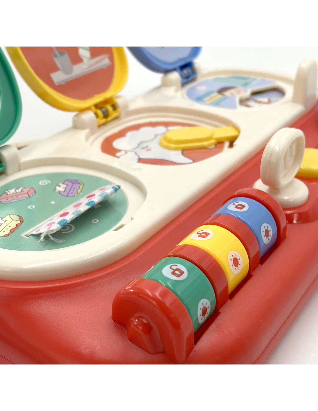 The green window opens with a code entered, consisting of three open padlocks. Once the window is opened, the child discovers tissues that unfold as they are pulled out, adding an element of surprise.