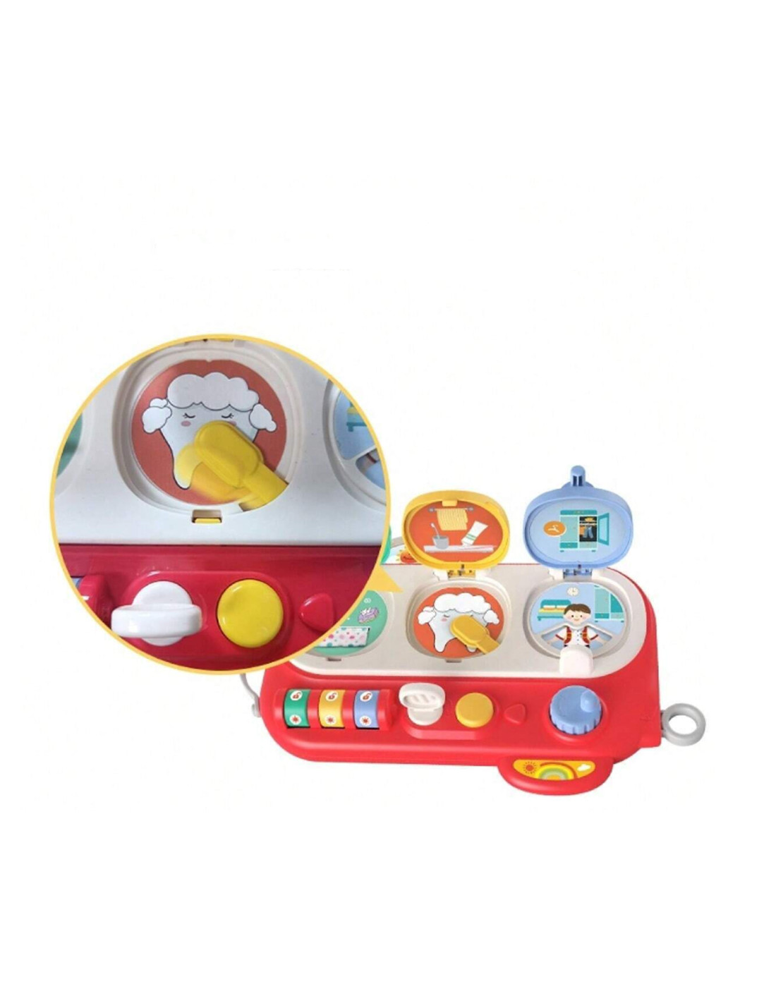 The yellow window opens with a white key. Once opened, children discover a tooth image and a moving toothbrush, engaging them in play and learning about oral hygiene.