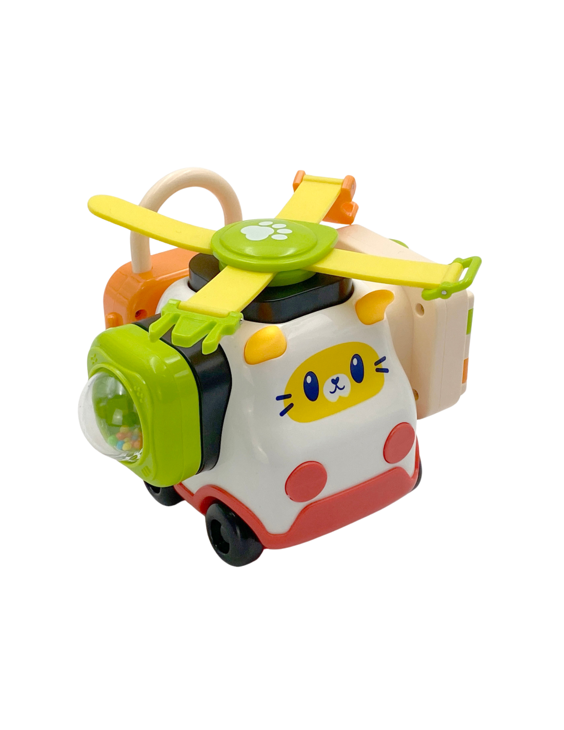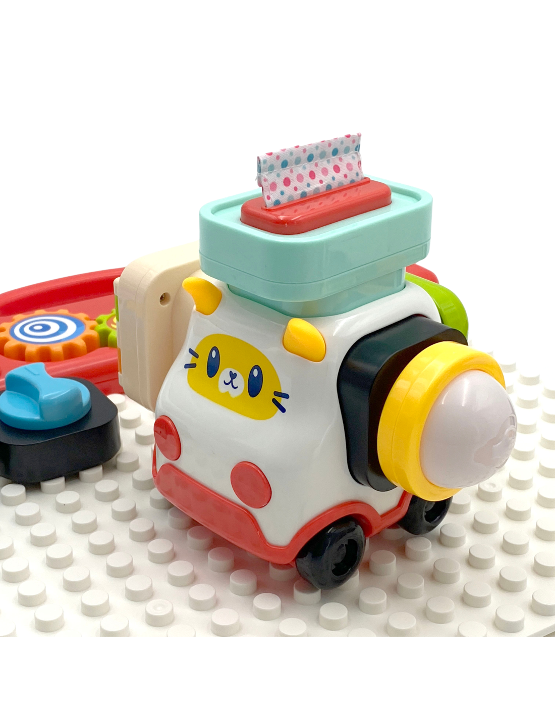 The colorful Woopie activity panel is a fascinating developmental toy designed to support children's sensory and motor development. The panel consists of a variety of interactive elements that can be attached and detached, much like building blocks. The set also includes a kitten-shaped car to which you can freely attach elements from the board.