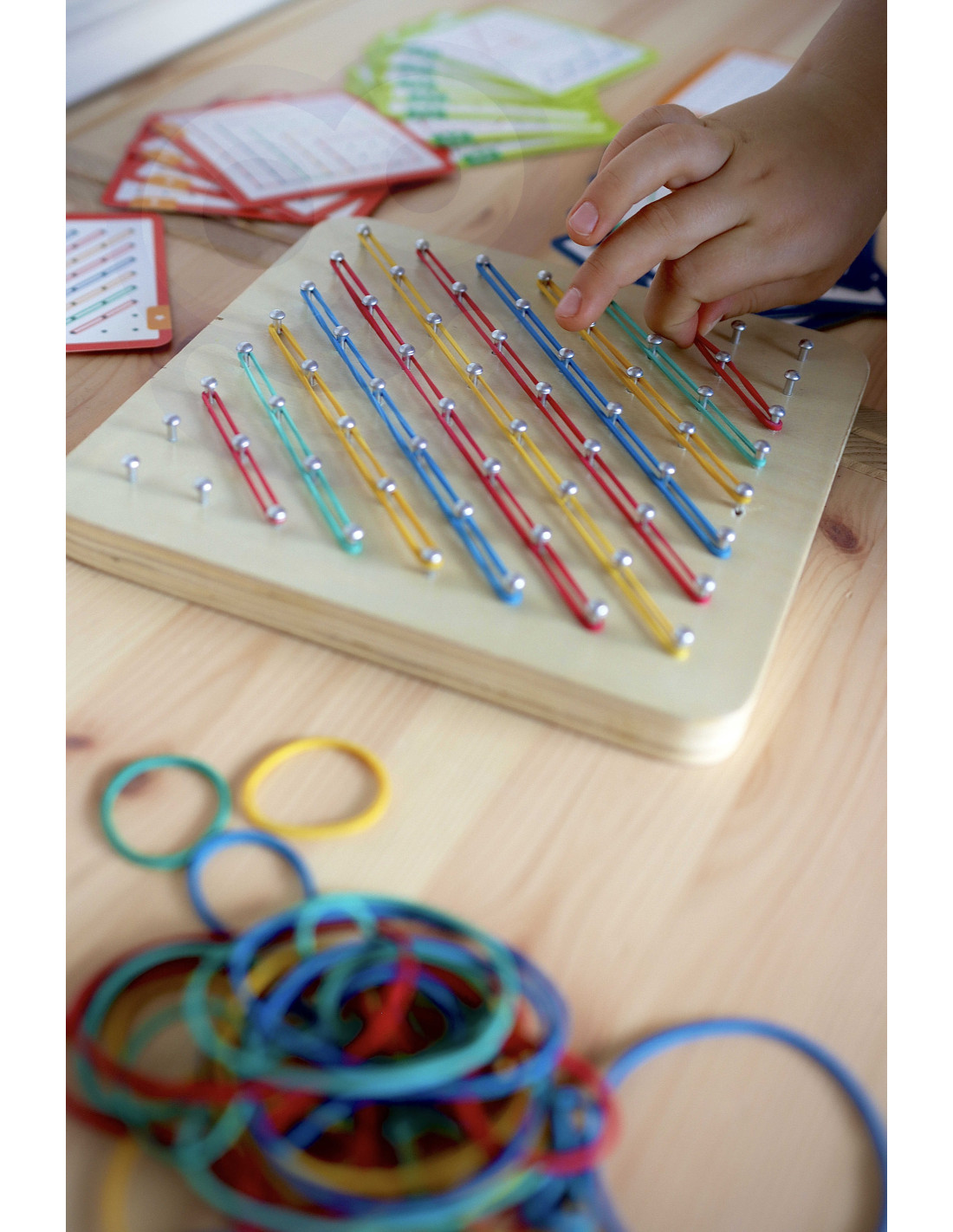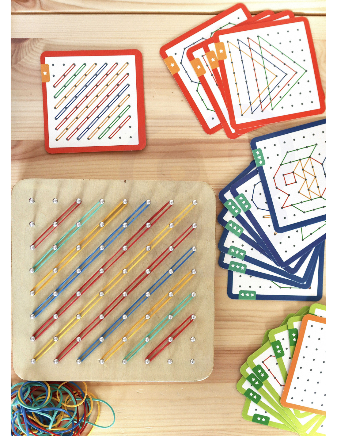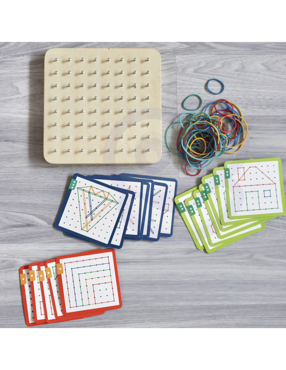 - - the set includes: 48 elastic bands, 20 double-sided cards (40 patterns), wooden board with pegs