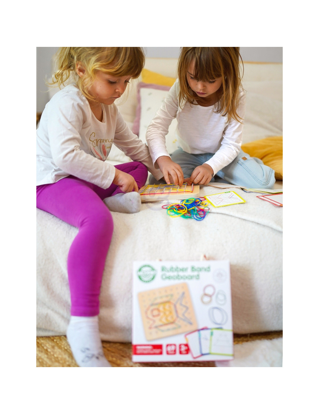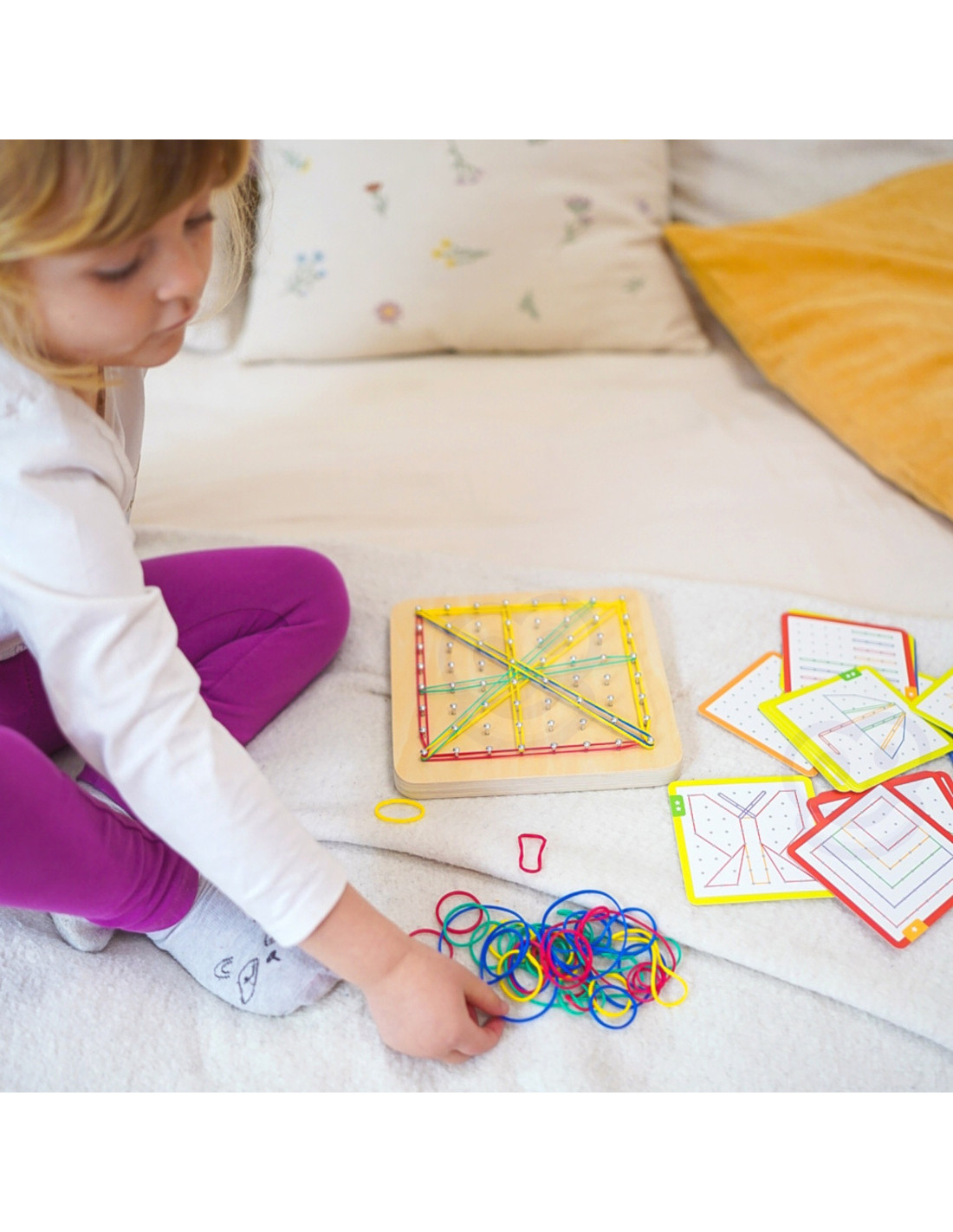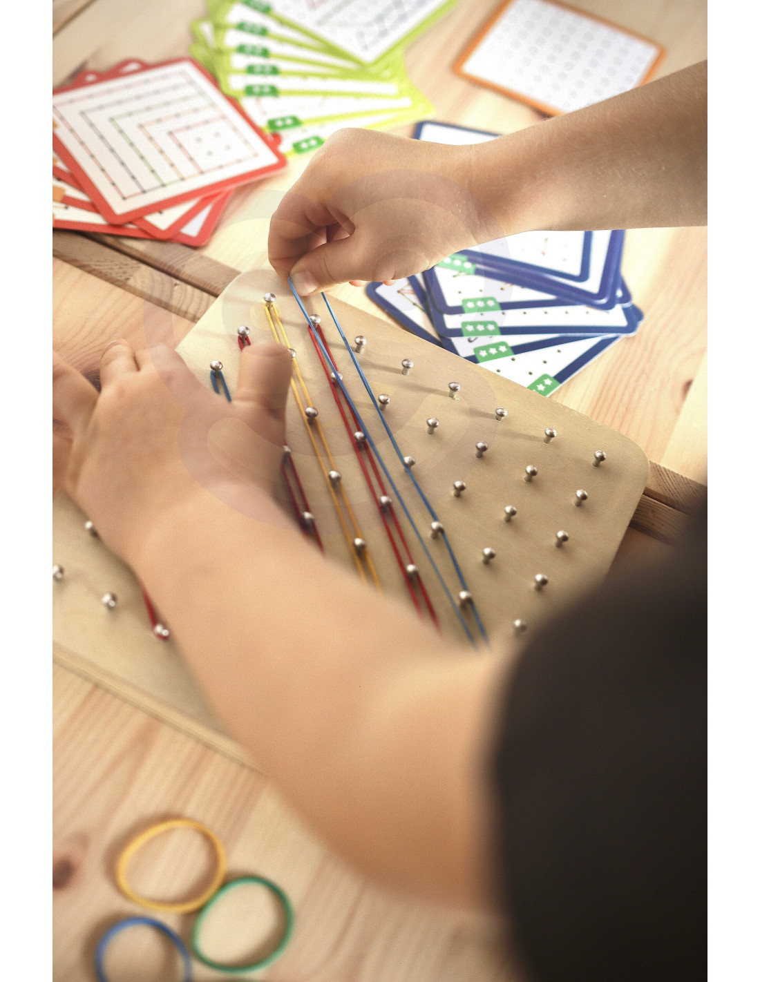 - - the set includes: 48 elastic bands, 20 double-sided cards (40 patterns), wooden board with pegs