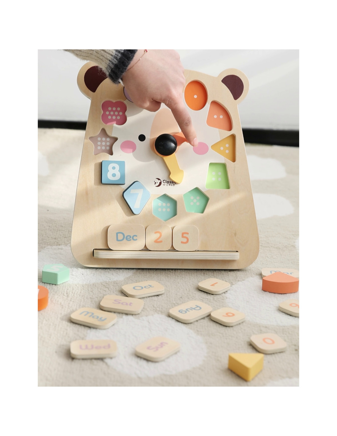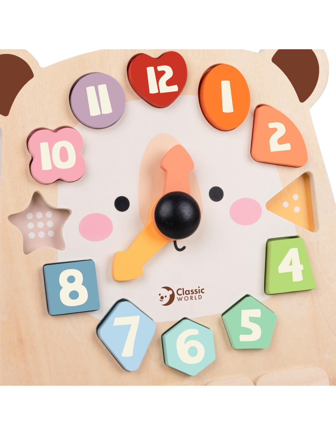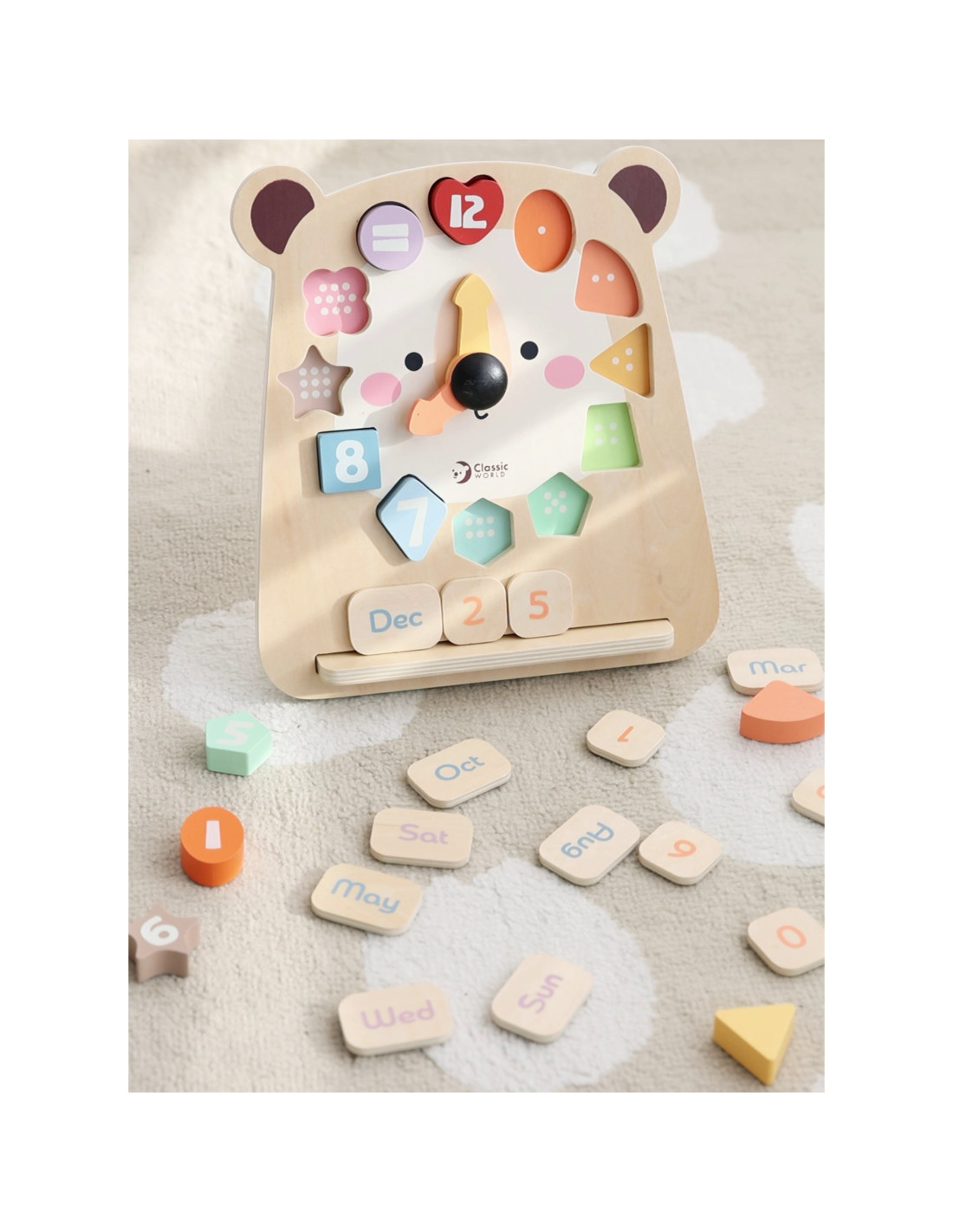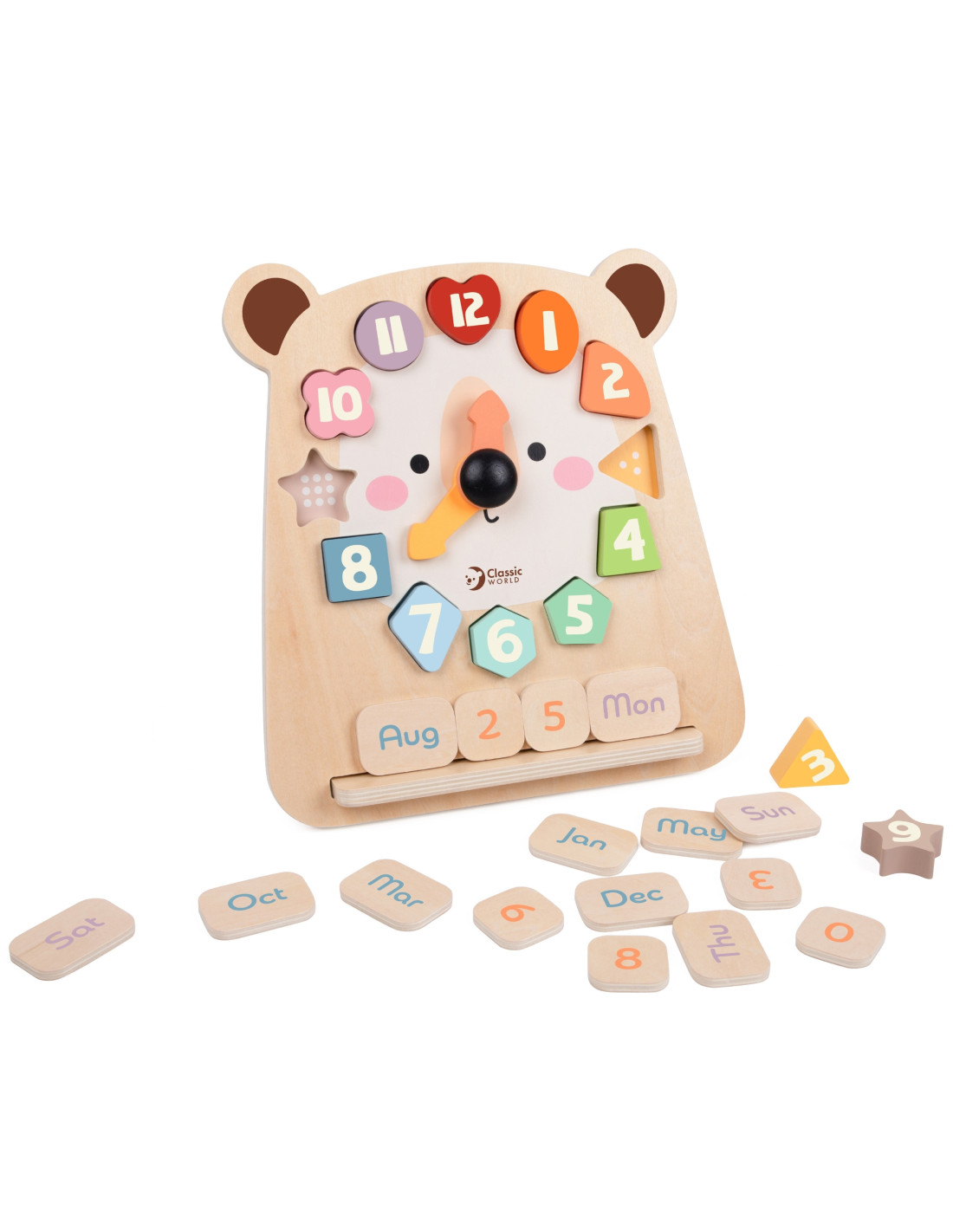 This wooden teddy bear clock from Classic World is a versatile toy that helps children learn the time, days of the week, and months, as well as recognize colors and shapes. Thanks to the removable blocks with numbers and names, little ones can practice hand-eye coordination, logical thinking, and manual dexterity. The clock encourages independent and creative play.
