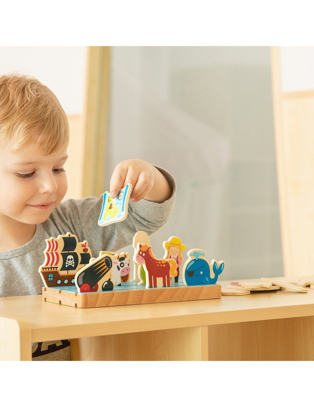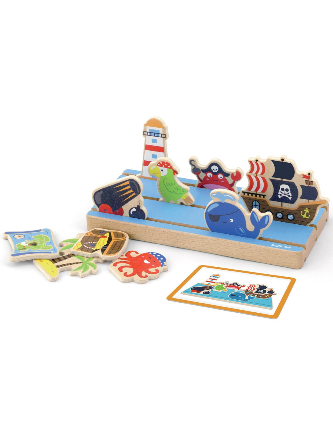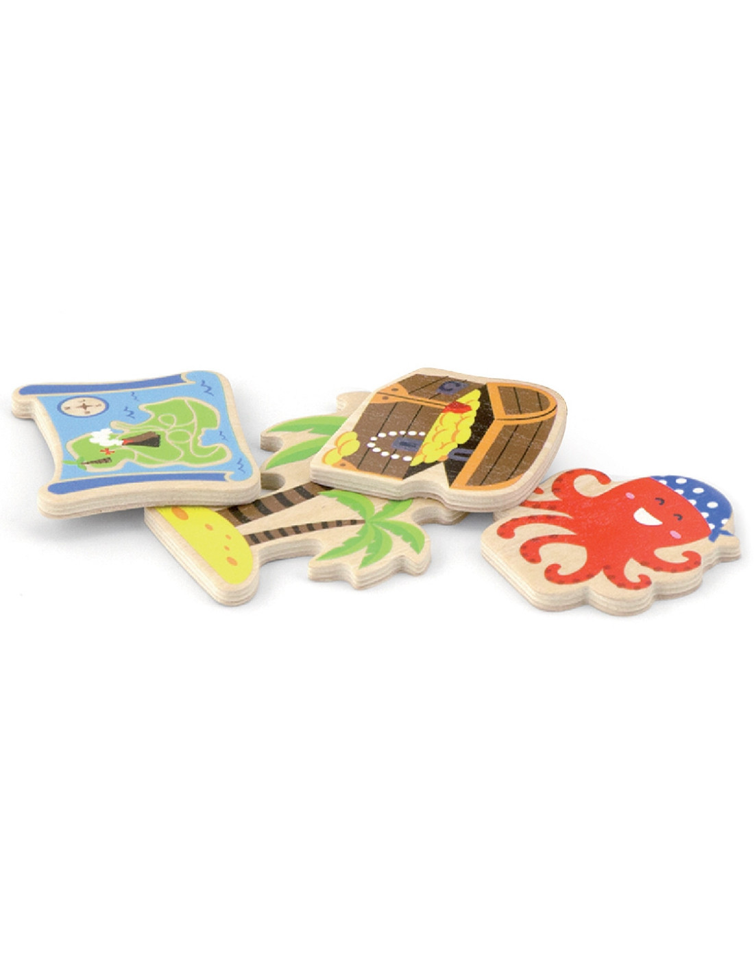 - wooden elements for assembling sea adventures: a lighthouse, a crab, a cannon, an octopus, a whale, a parrot, an island with palm trees, a treasure chest, a map, a pirate ship,