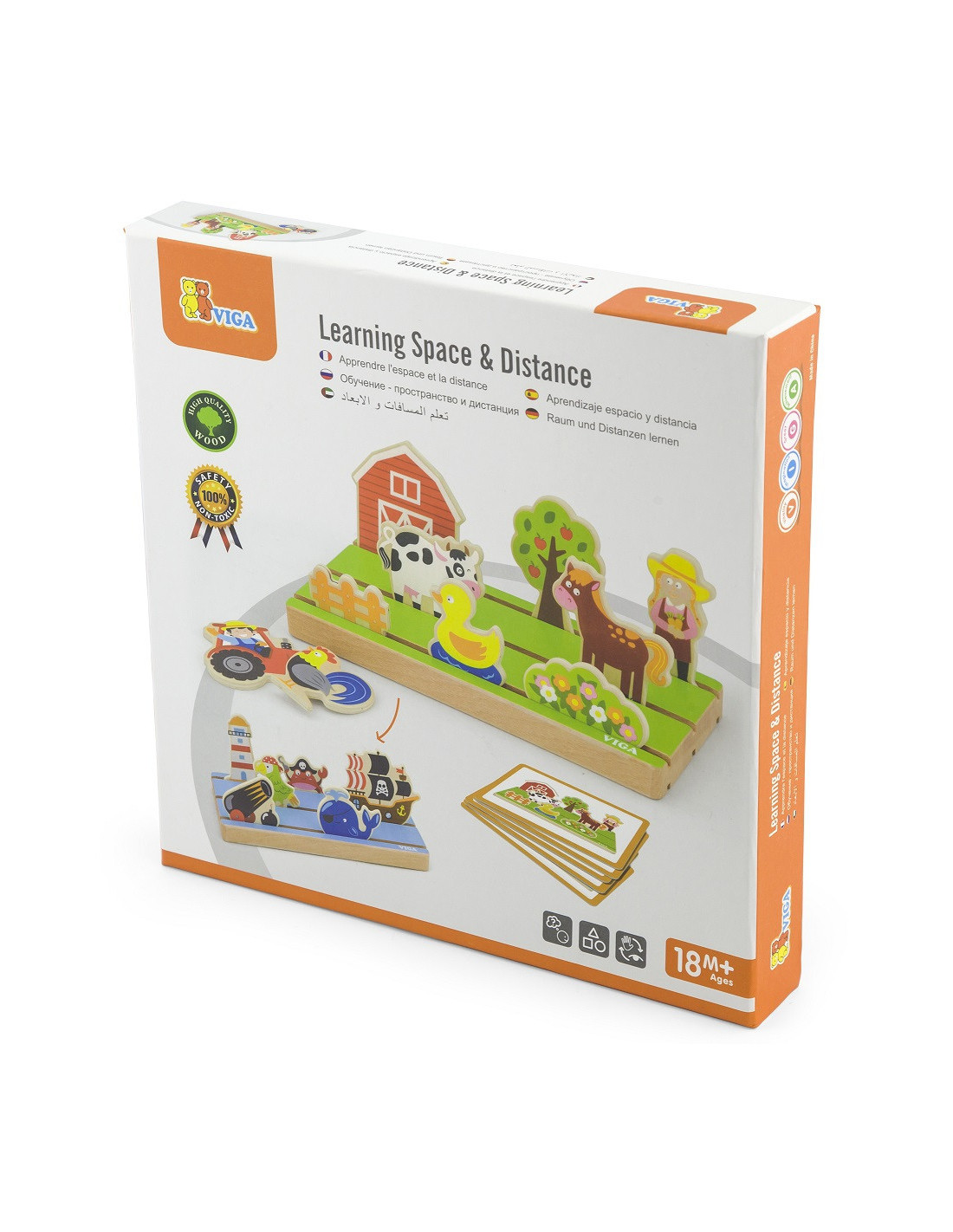 The puzzle contains pieces to be placed on a base and matching cards. Children place individual pieces in one of three pre-defined slots. Their task is then to determine the distances and relationships between the arranged objects.