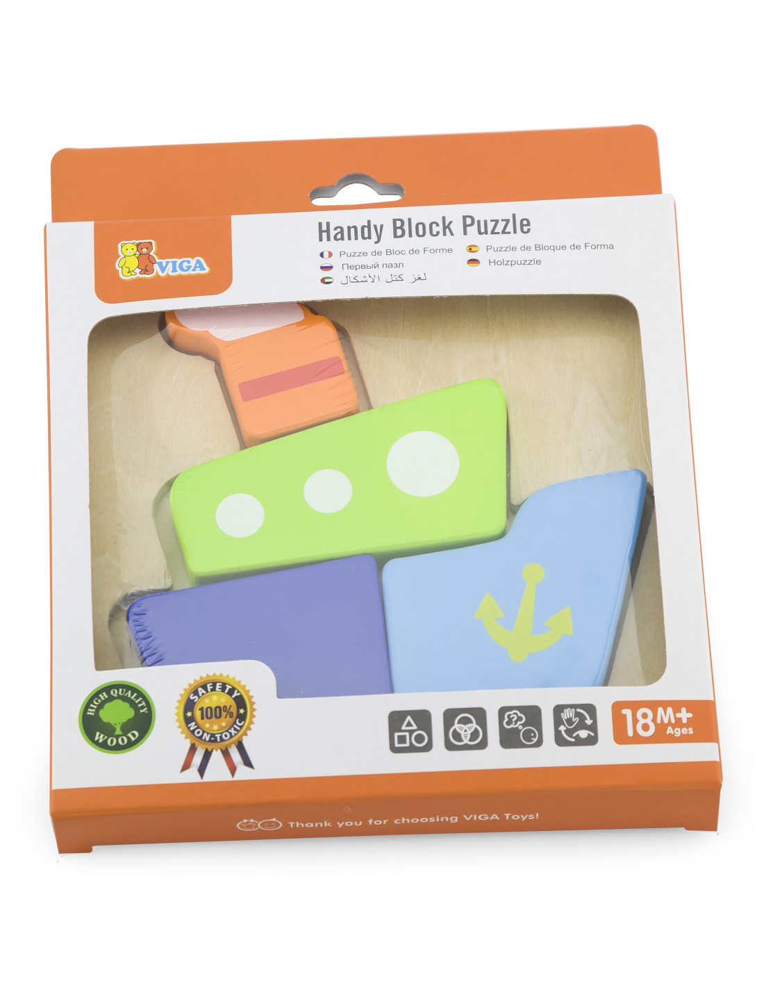Wooden Mini Puzzles from the renowned Viga brand for children It's the perfect solution for both home and preschool play. The puzzle consists of four pieces that together form a ship . The wooden base features a recessed shape that corresponds to the colorful puzzle pieces.