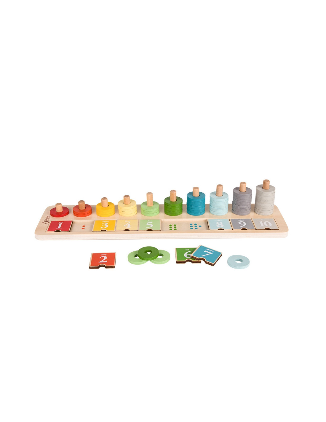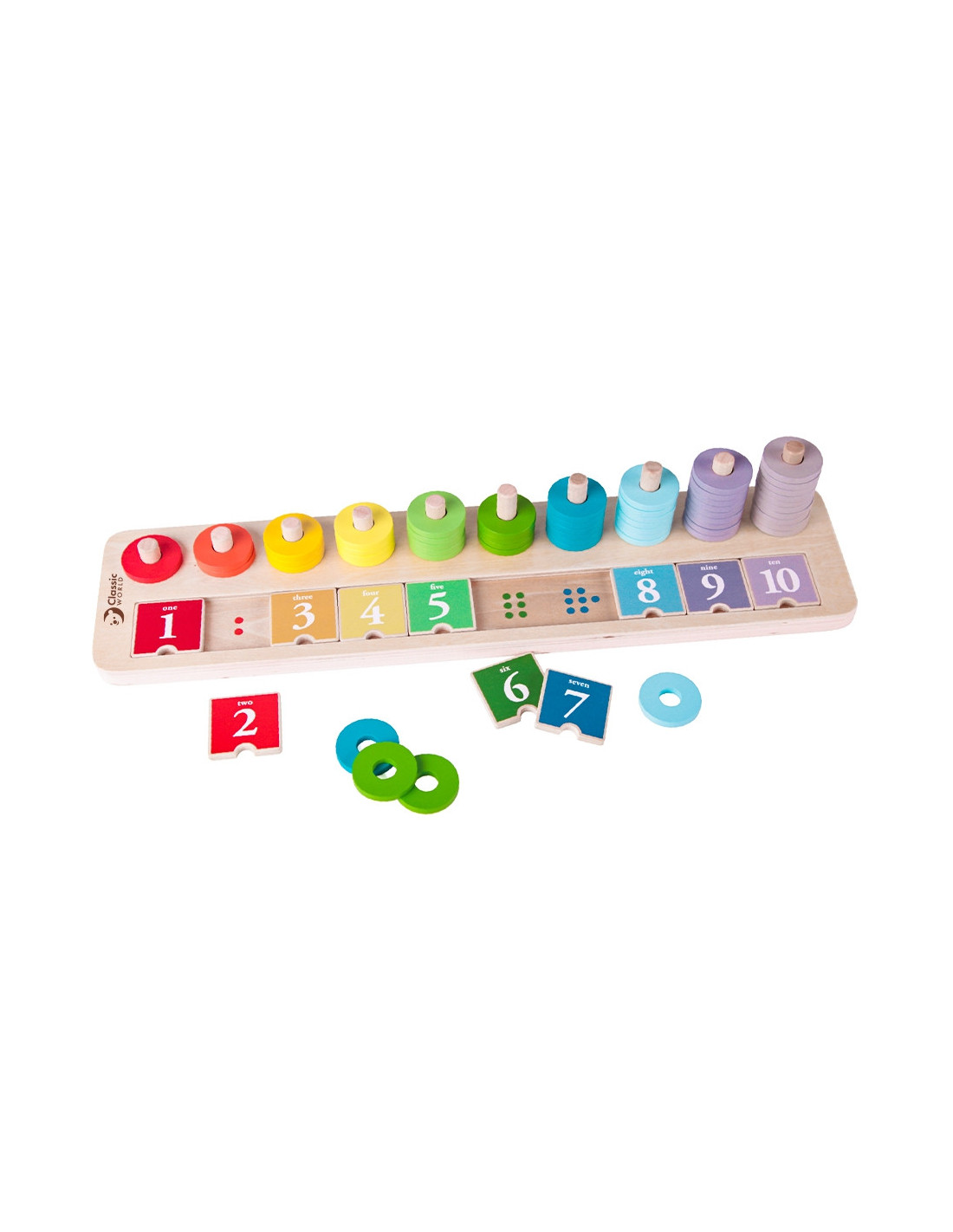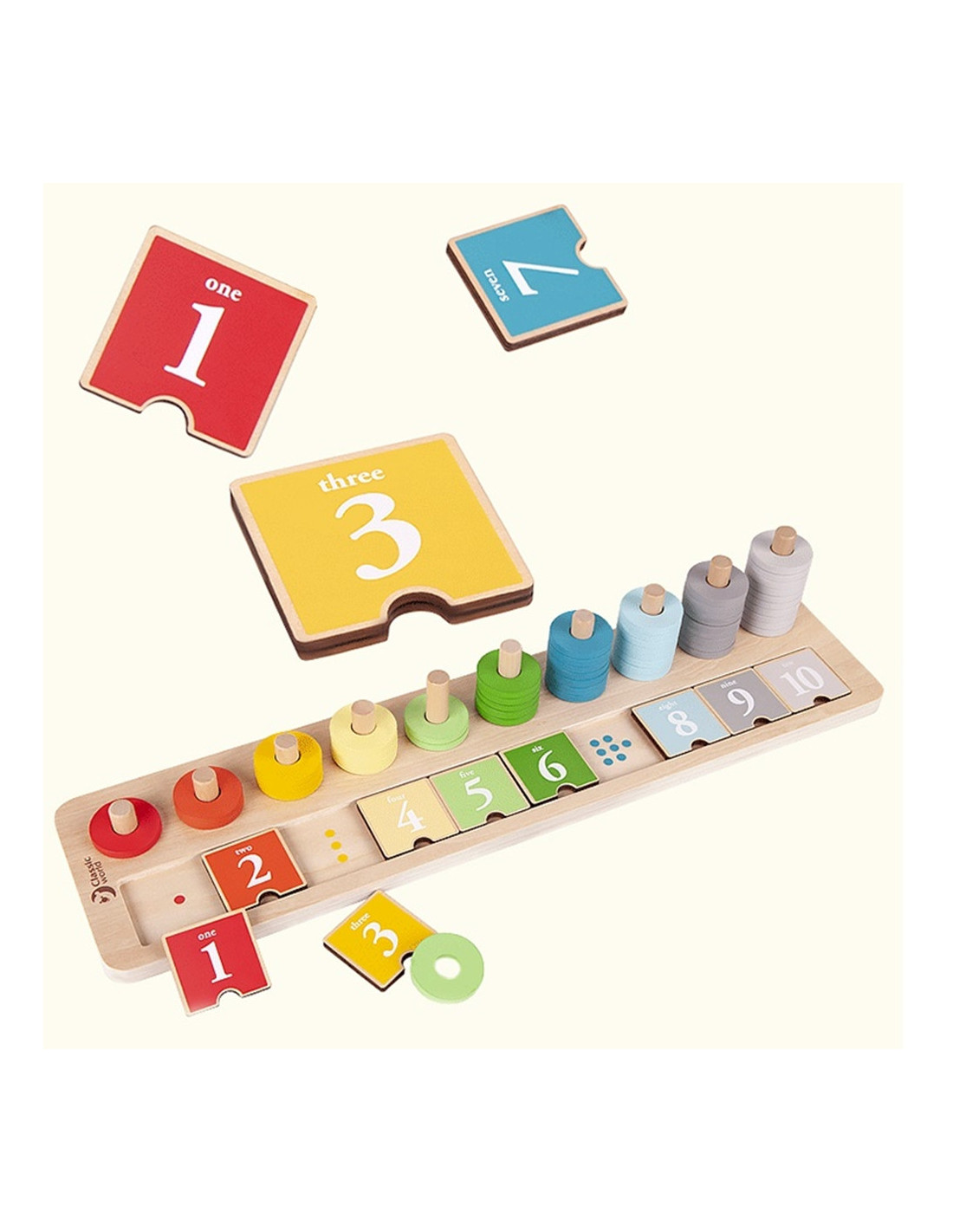 This Classic World puzzle is a wooden sorter for color recognition and counting. The game involves matching the number of circles to the numbers painted on the base . Dots are also drawn under the numbers , which can also help your child match the blocks. While playing, children develop manual dexterity , logical thinking , hand-eye coordination, and color recognition and the concept of larger/smaller. You can arrange the numbers in order or mix them up to make the puzzle more challenging.