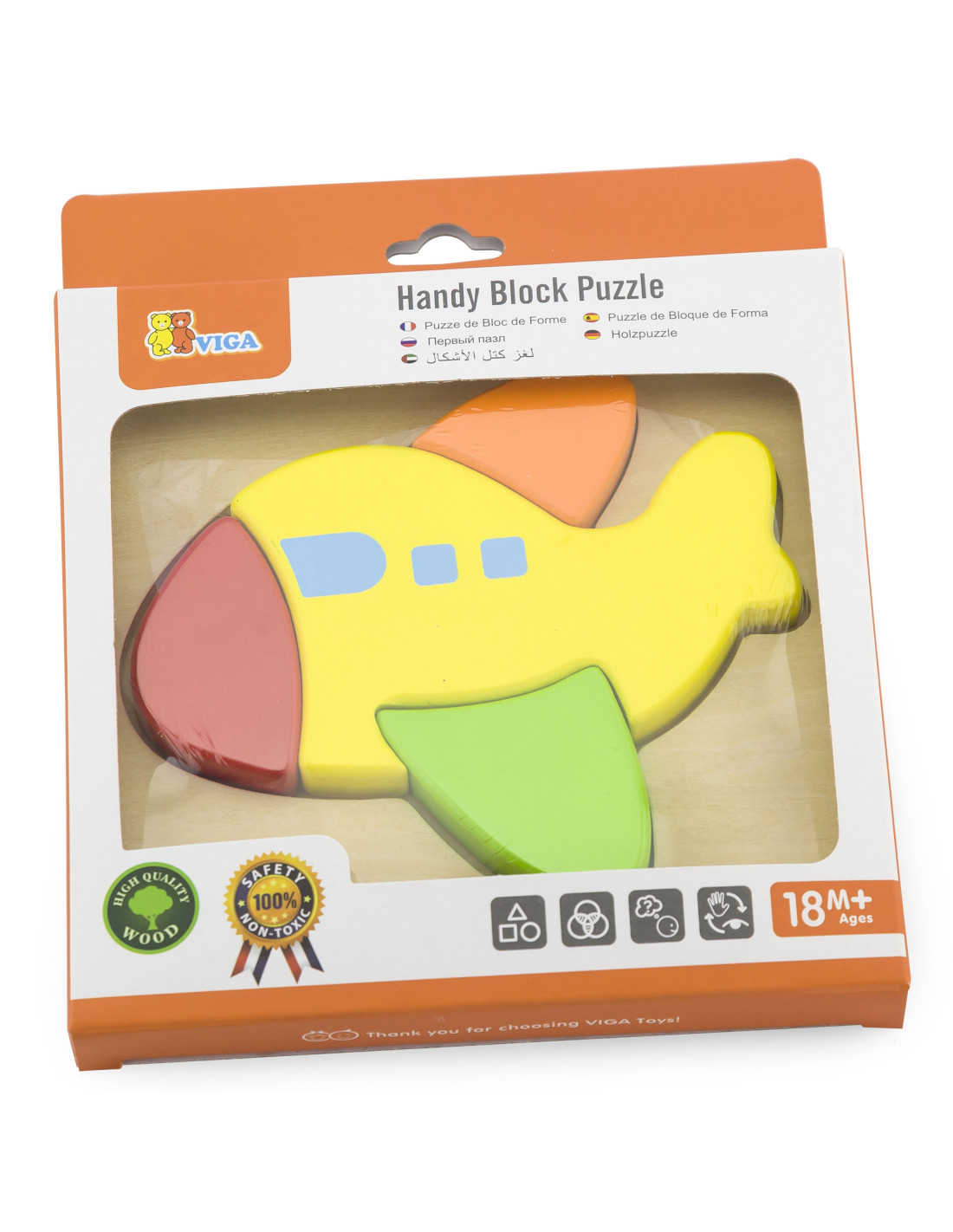 Wooden Mini Puzzles from the renowned Viga brand for children It's the perfect solution for both home and preschool play. The puzzle consists of four pieces that together form an airplane . The wooden base features a recessed shape that matches the colorful puzzle pieces.