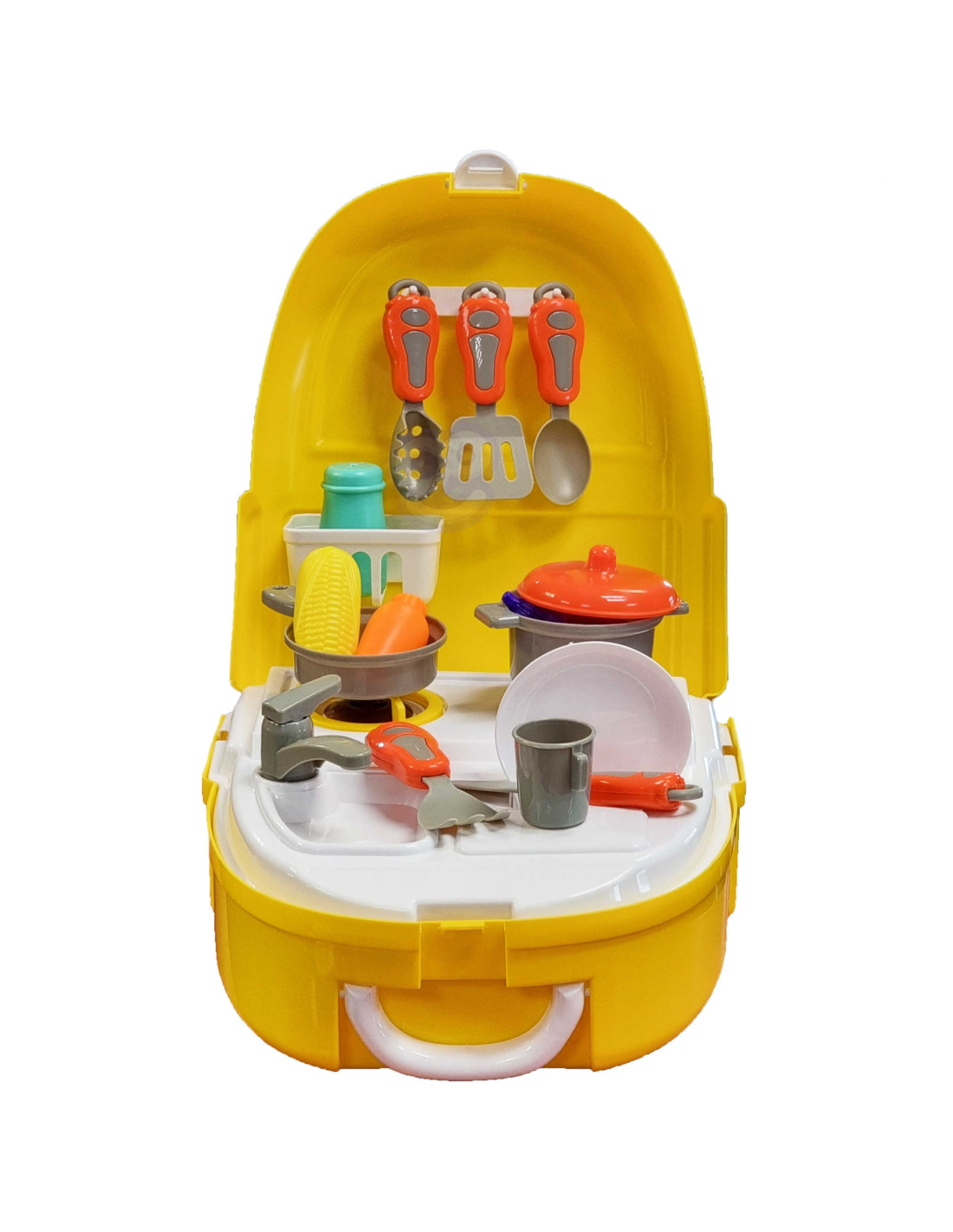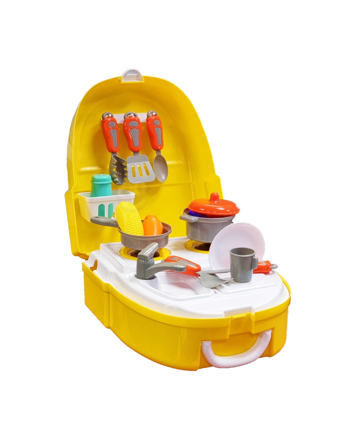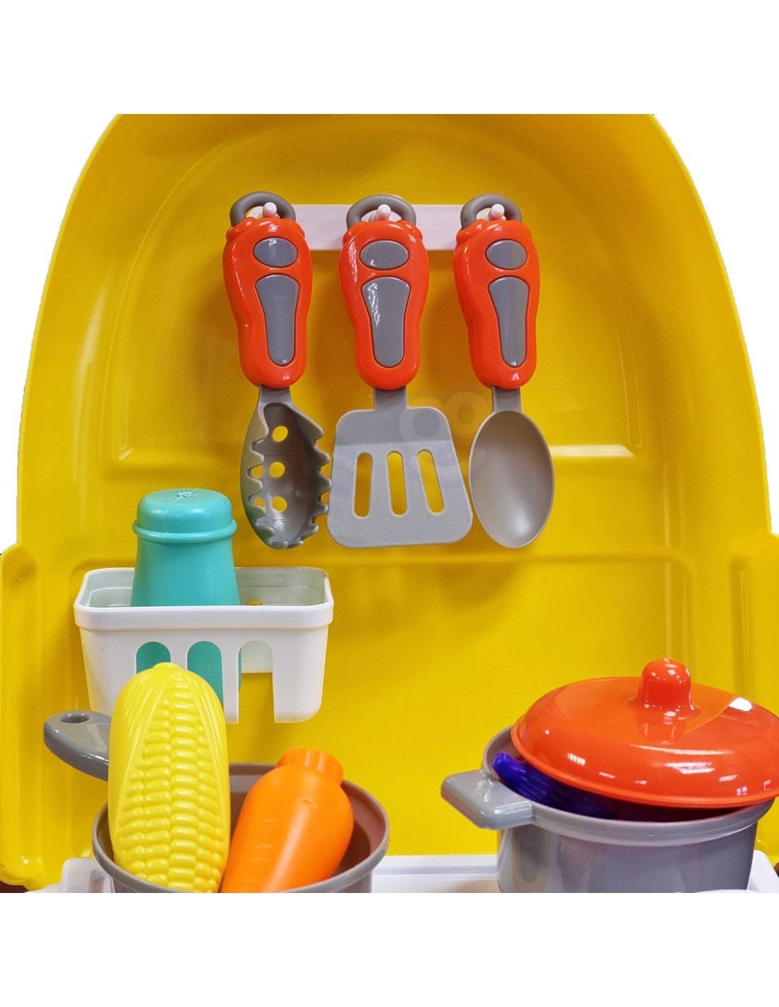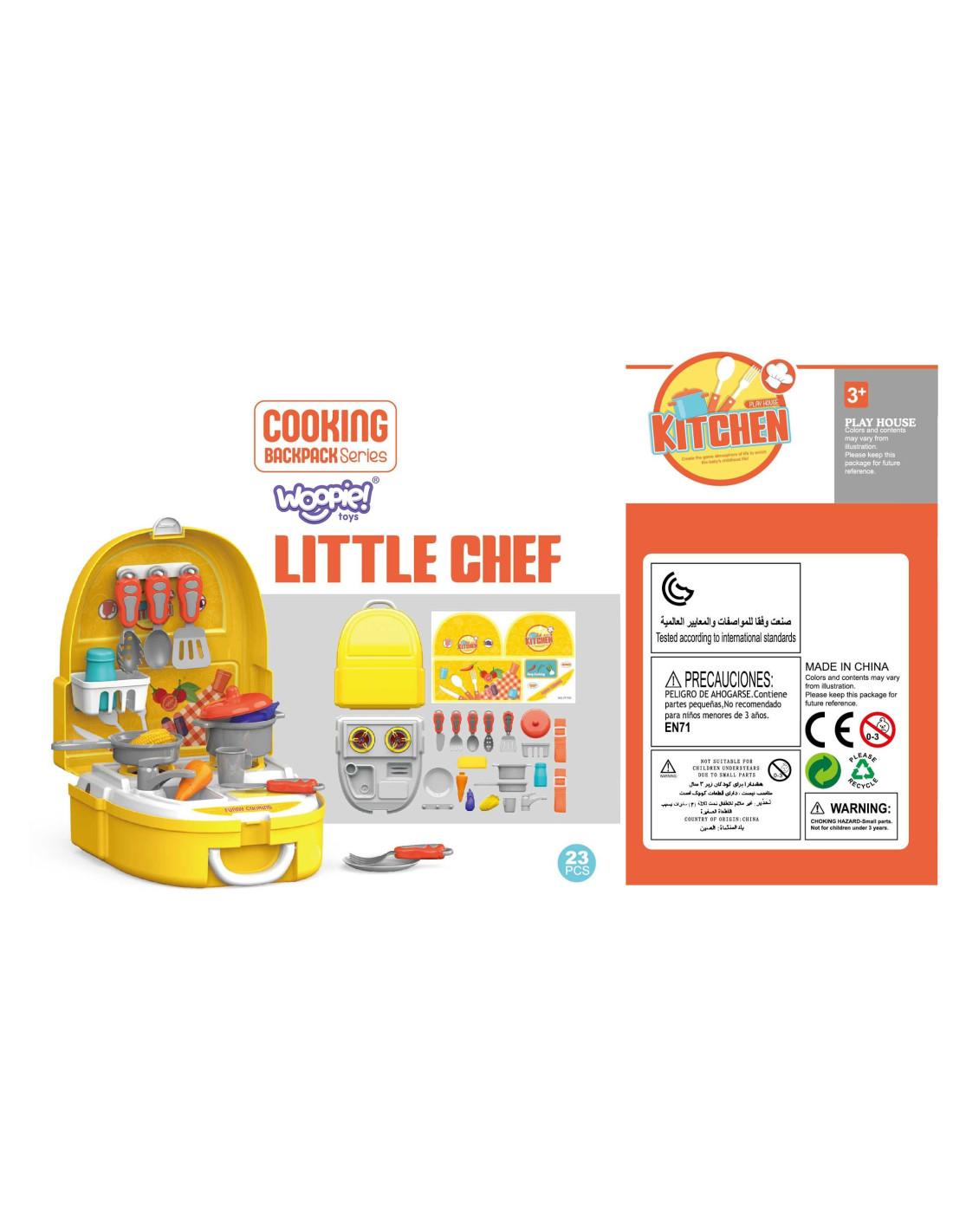 The Little Chef Backpack Set from WOOPIE lets your child play chef wherever and whenever they want. Children love helping their parents in the kitchen, developing a passion for cooking and collaborating with friends while cooking. The set includes 23 pieces : everything a chef needs. The toy functions as a backpack thanks to shoulder straps, allowing you to take the Little Chef Set with you wherever you go . Role-playing and imitating parents develops your child's awareness and stimulates their imagination and creativity .