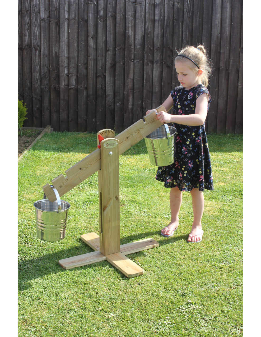 A children's balance scale from the renowned Classic World brand. The product is made of high-quality wood and painted with a non-toxic, child-safe impregnation . Fill the metal buckets with sand, water, and pebbles, ensuring that the two buckets are aligned. This is an ideal set for children to develop manual skills, creativity, and logical thinking. Perfect for your home garden!